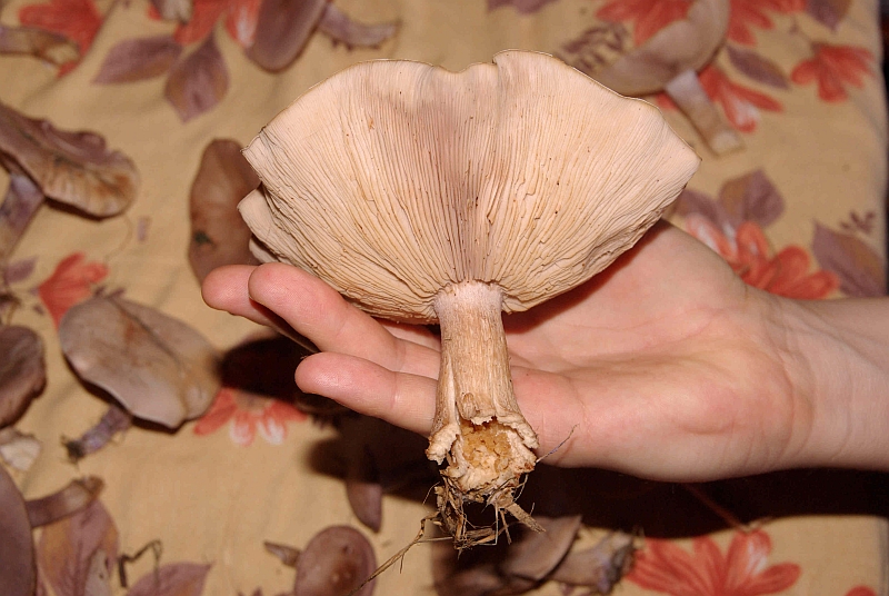 heute (20.12.2009) habe ich eine ganze Menge Pilze (eng zusammenstehend) auf dem Kompost hinter unserem Schuppen gefunden (Bilder anbei). Der Kompost besteht vorwiegend aus geschnittenen Rasenabfällen und ist geschützt von Koniferen (also schattiger Standort). Laut Bestimmungsbuch und Internetrecherchen tippen wir auf Rötelritterling (Lilastiel oder Violetter, Stiel lila angelaufen, faserig, Lamellen sind eher gräulich/bräunlich mit lila Schimmer, das Hutfleisch ist weißlich zur Mitte, Stiel, cremefarben), sind uns aber nicht sicher, da der Stiel meist nicht so dick (bei älteren Exemplaren hohl) wie beschrieben ist und der Hut schon frühzeitig Trichterform aufweist.