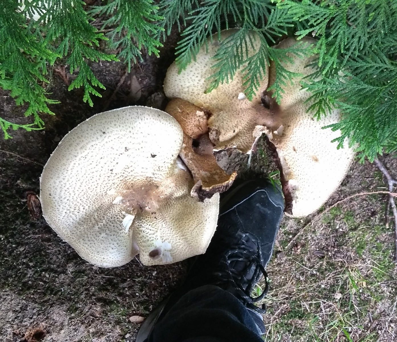 ich kann nicht besonders viel zur Lösung beitragen, habe aber eben, an einer Stelle, an der ich zuvor schon Agaricus Augustus fand die folgenden Fruchtkörper entdeckt. Genau genommen waren sie nicht zu übersehen.