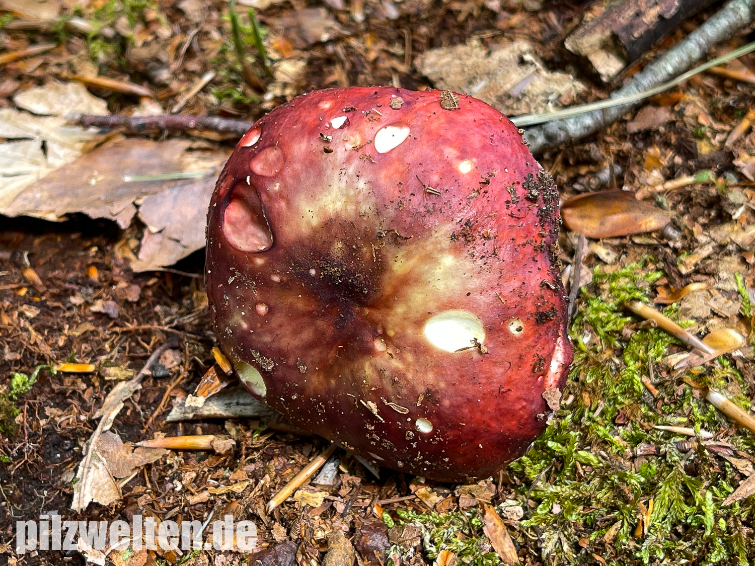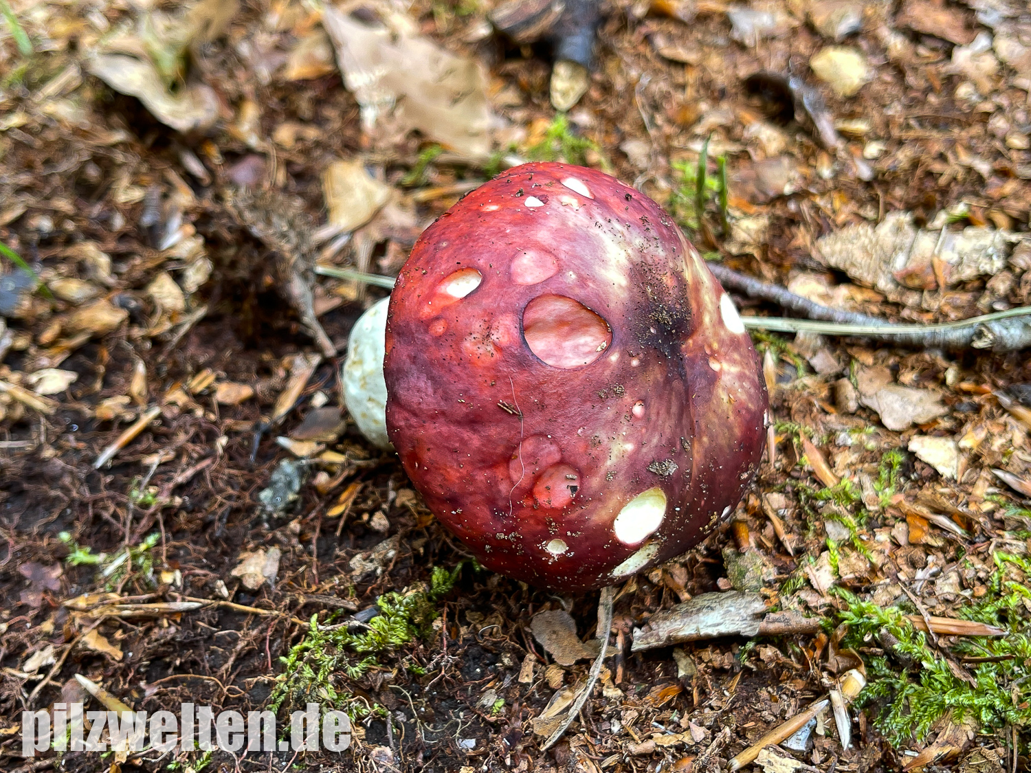 Die folgende Russula konnten wir bis jetzt noch nicht wirklich einordnen, vielleicht hat jemand Input? Unsere ersten Nachforschungen gingen (wegen der teilweise rötlichen Lamellenschneiden am Hutrand in Richtung Russula olivacea, was wir aber u. a. auf Grund des komplett weißen Stiels dann wieder verworfen haben. Auch bei den Purpurtäublingen haben wir uns umgesehen, so richtig passen wollte da aber unserer Meinung nach auch keiner.