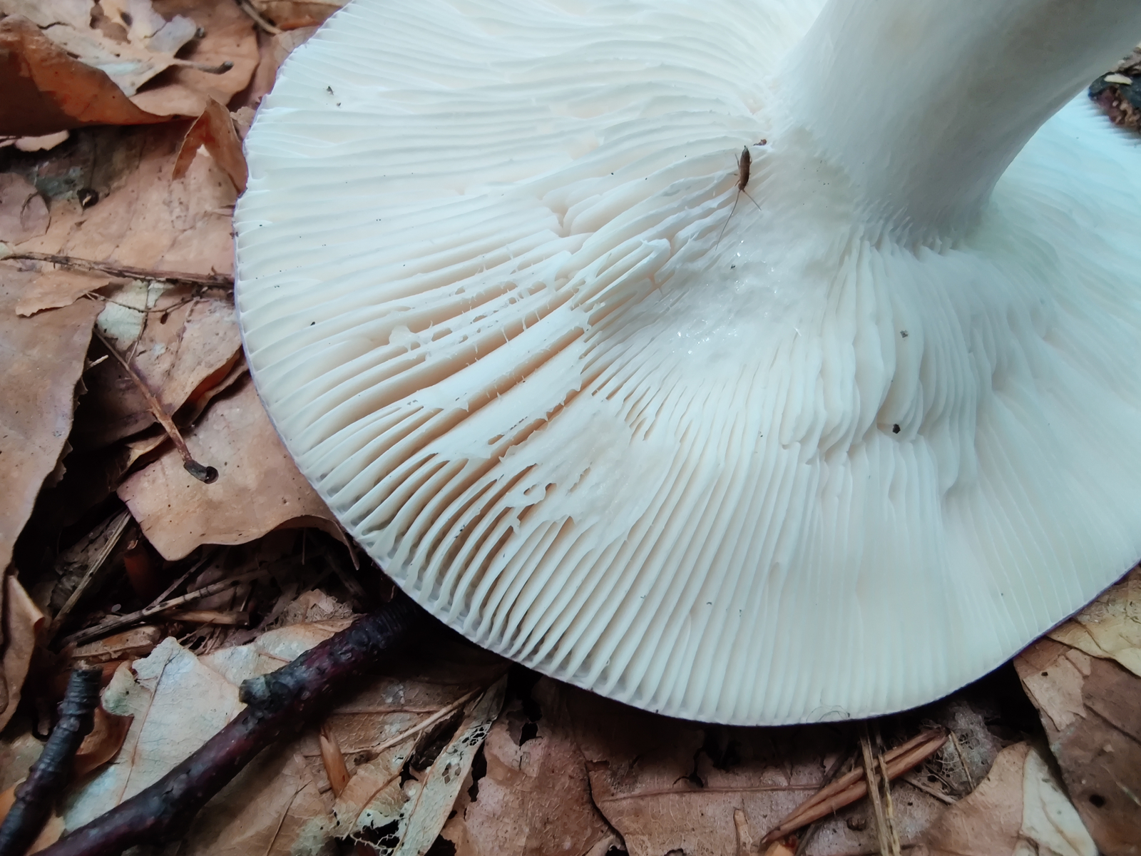 Lamellen: angewachsen, teilweise gegabelt; creme-gelblich (Sporenabwurf habe ich vorbereitet)