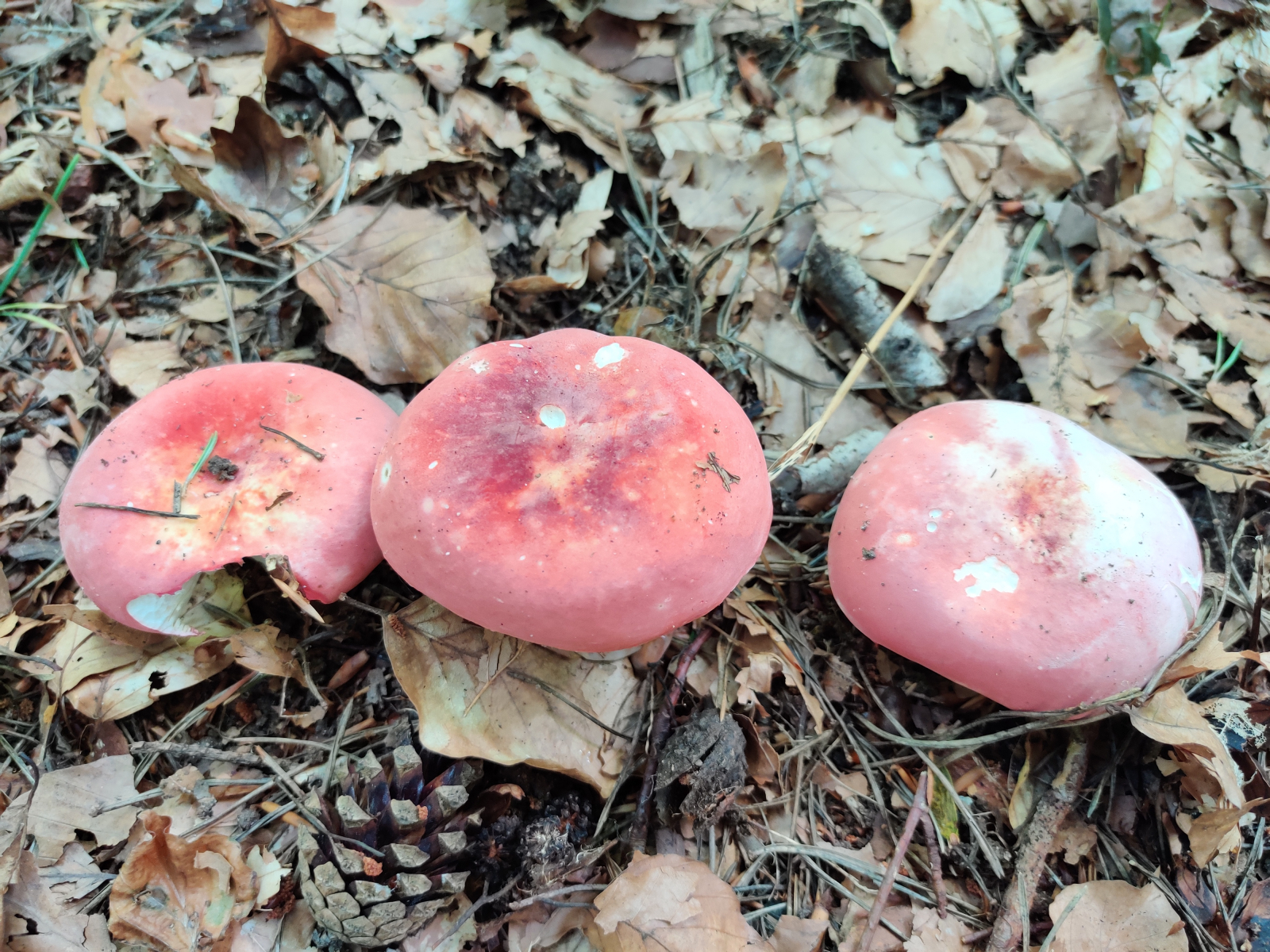 3. Am auffälligsten waren diese roten Täublinge. Sie wuchsen auf einer langen Strecke immer wieder neben einem vielbegangenen Waldweg unter Rotbuchen und Waldkiefern. Neben dem Weg schlängelt sich ein Bach, der jedoch wenige Meter tiefer als der Weg fließt. Viele Fruchtkörper hatten schon deutliche Trockenschäden oder wurden von Spaziergängern zertreten. Es gab aber auch noch einige frischere. Auch letztes Jahr konnte ich entlang dieses Weges viele dieser Täublinge finden, hatte sie mir aber nicht näher angeschaut. Könnte das der Zinnobertäubling (Russula lepida) sein? Da das Gebiet recht groß war, ich Fruchtkörper an verschiedenen Stellen fotografiert hatte und ich nicht jeden Pilz genau untersucht habe, ist nicht garantiert, dass alle Bilder die selbe Art zeigen. Ich gehe aber davon aus, da die Merkmale bei allen angeschauten Fruchtkörpern doch sehr konstant waren.