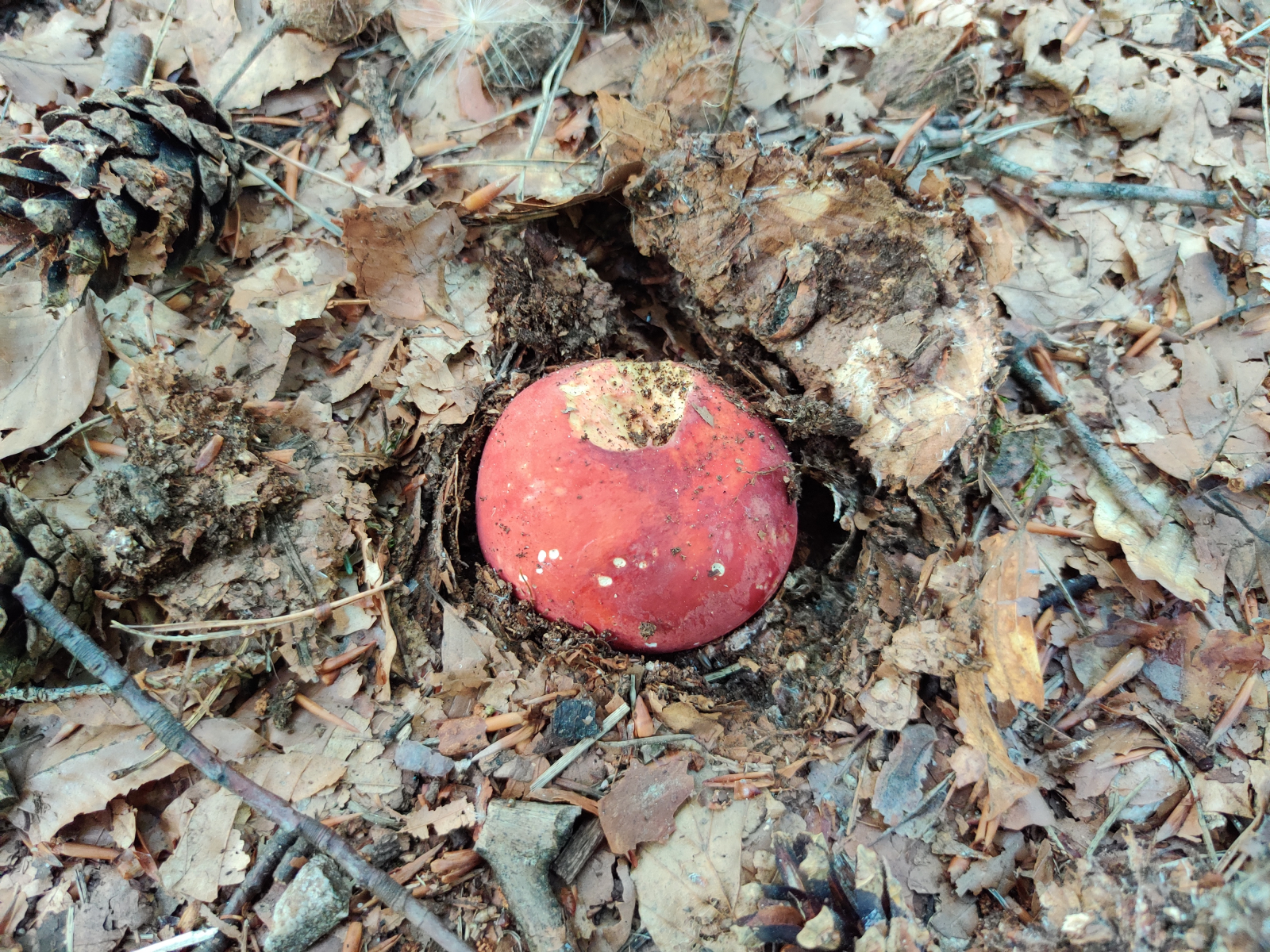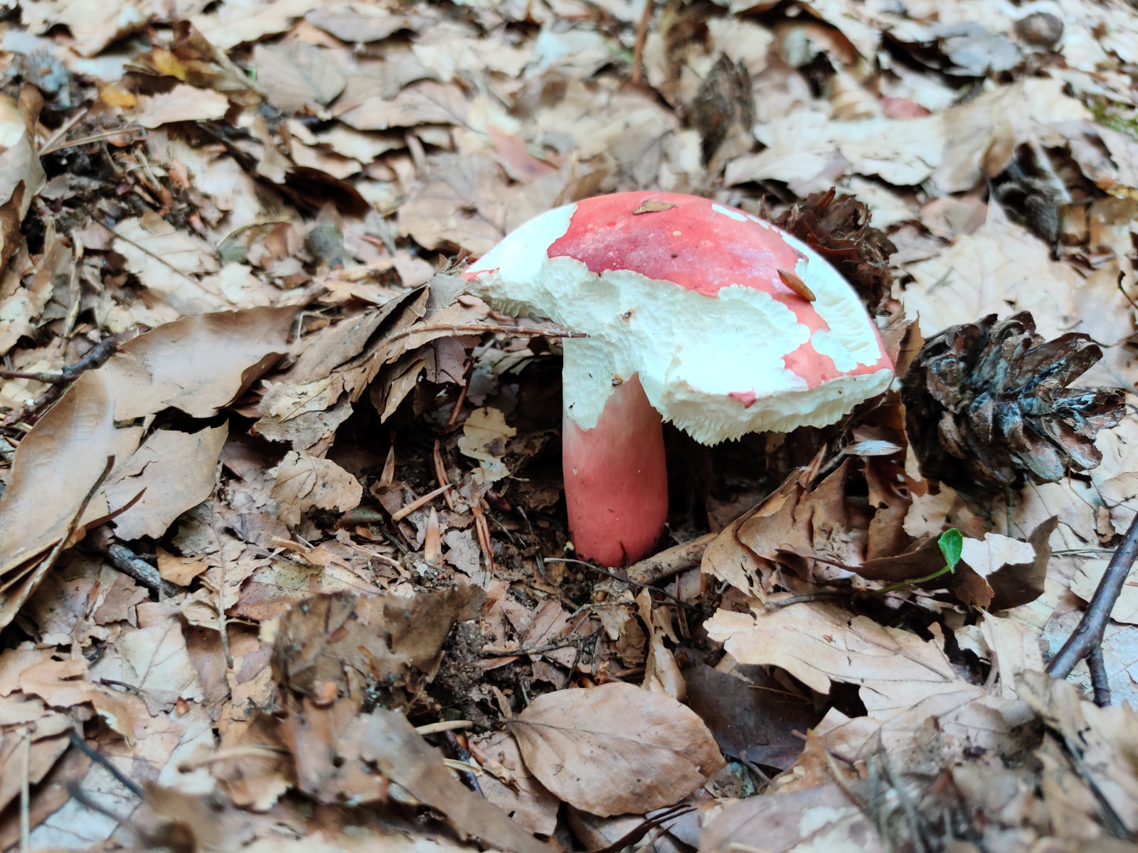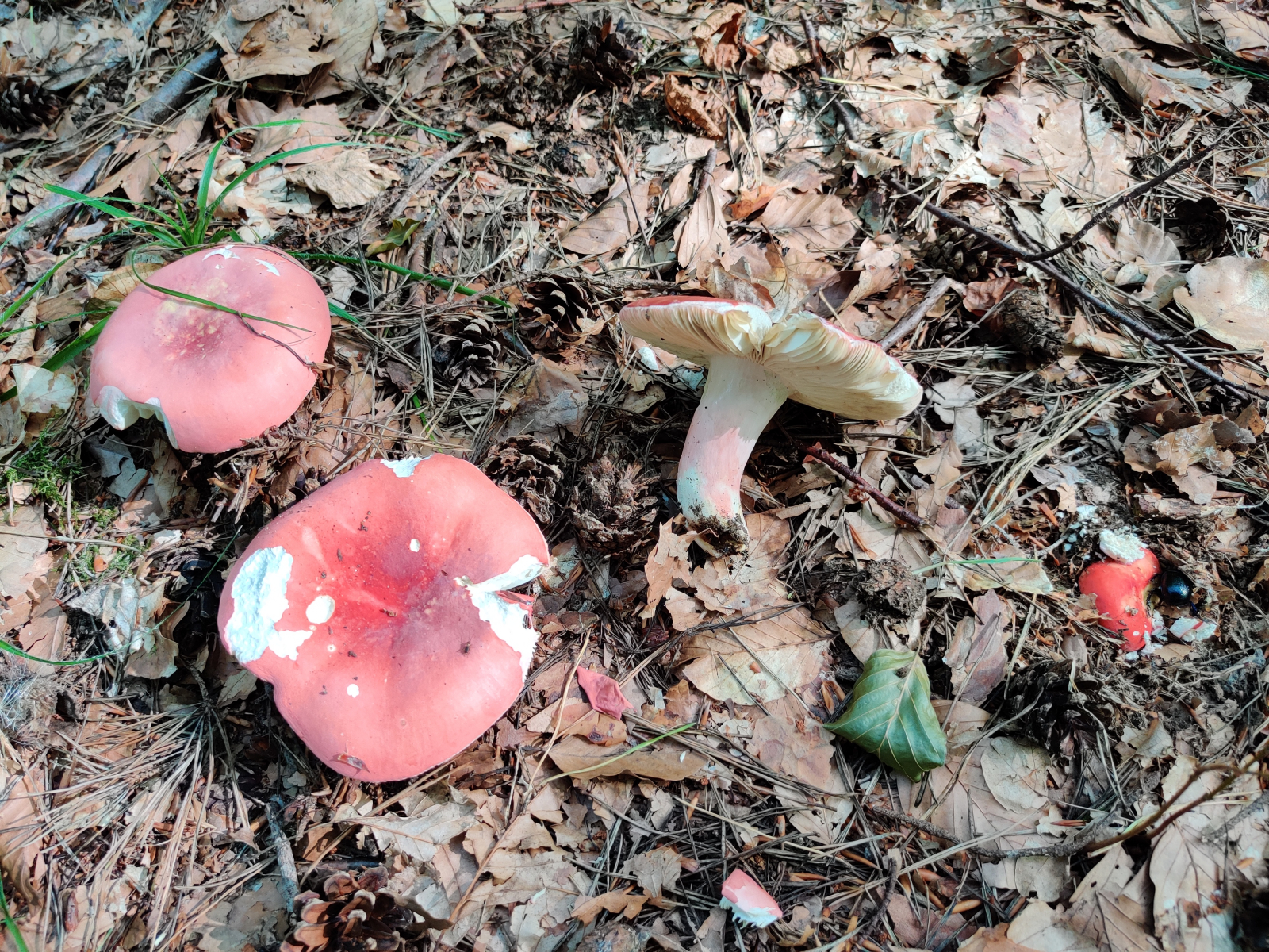 3. Am auffälligsten waren diese roten Täublinge. Sie wuchsen auf einer langen Strecke immer wieder neben einem vielbegangenen Waldweg unter Rotbuchen und Waldkiefern. Neben dem Weg schlängelt sich ein Bach, der jedoch wenige Meter tiefer als der Weg fließt. Viele Fruchtkörper hatten schon deutliche Trockenschäden oder wurden von Spaziergängern zertreten. Es gab aber auch noch einige frischere. Auch letztes Jahr konnte ich entlang dieses Weges viele dieser Täublinge finden, hatte sie mir aber nicht näher angeschaut. Könnte das der Zinnobertäubling (Russula lepida) sein? Da das Gebiet recht groß war, ich Fruchtkörper an verschiedenen Stellen fotografiert hatte und ich nicht jeden Pilz genau untersucht habe, ist nicht garantiert, dass alle Bilder die selbe Art zeigen. Ich gehe aber davon aus, da die Merkmale bei allen angeschauten Fruchtkörpern doch sehr konstant waren.