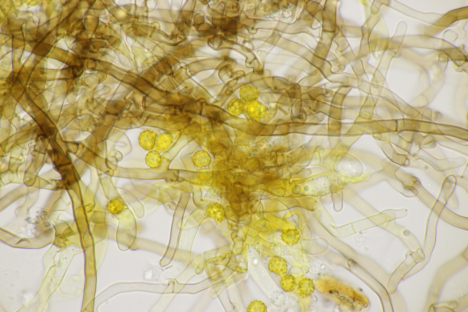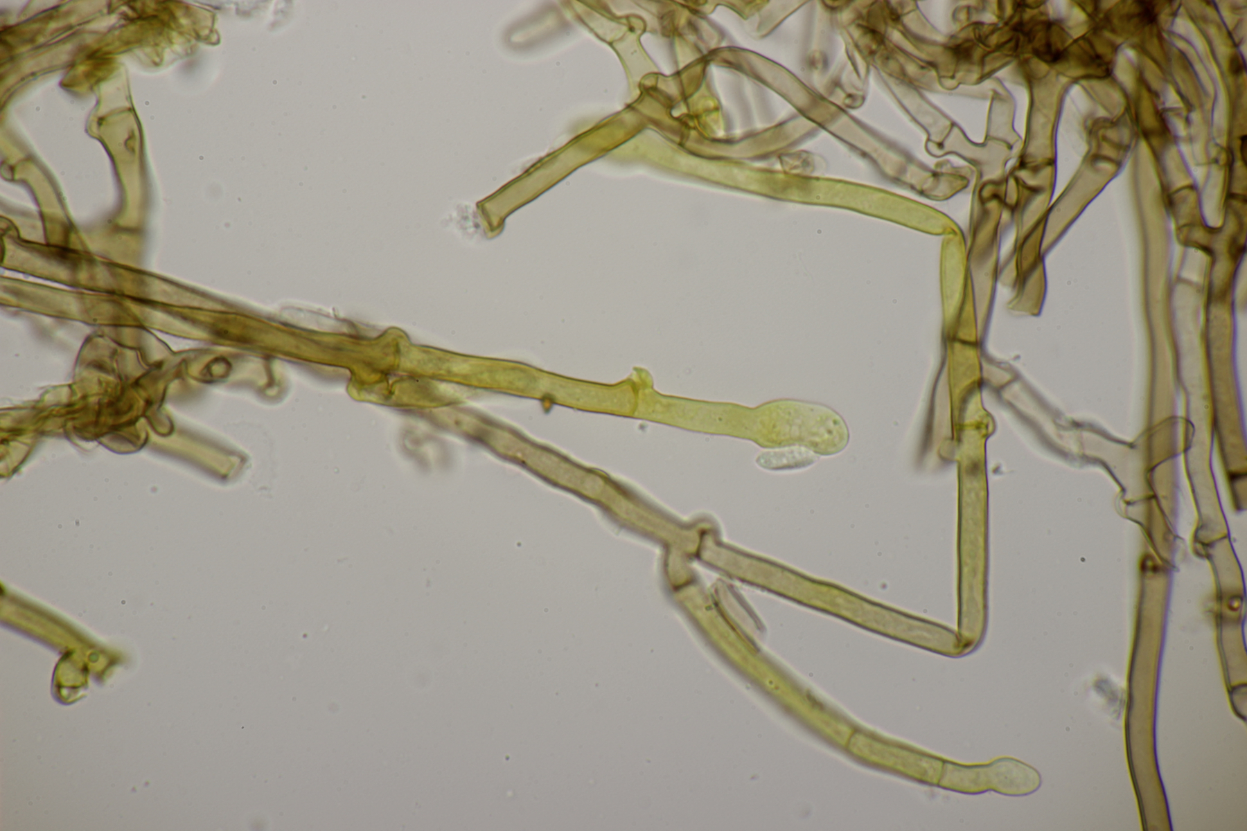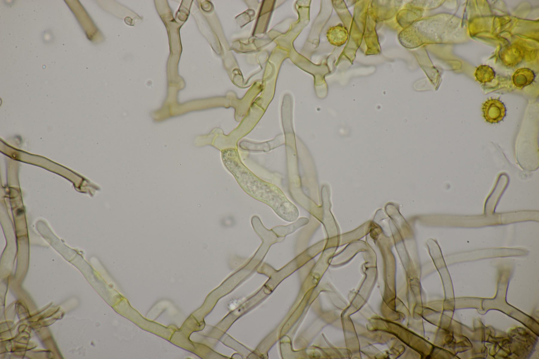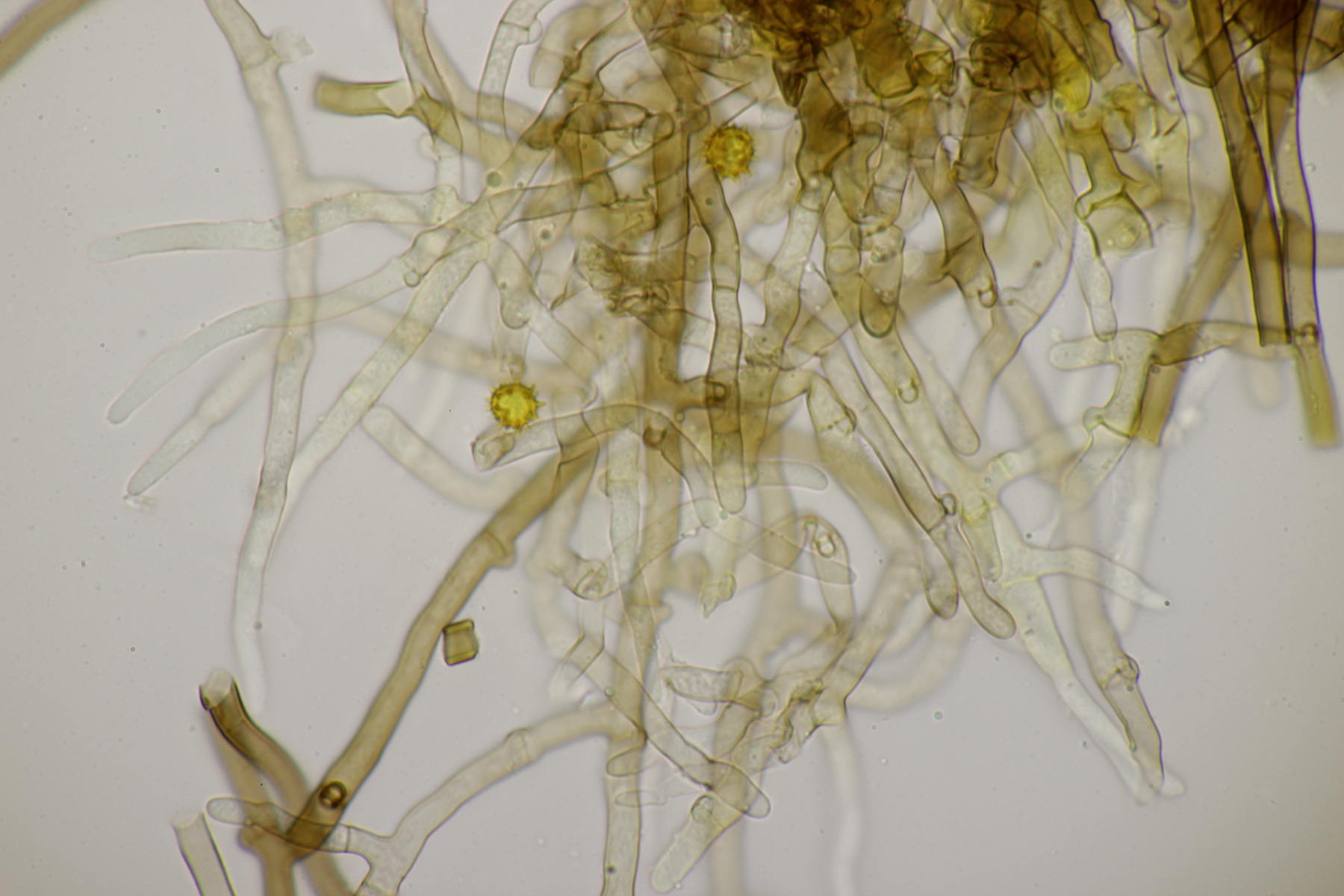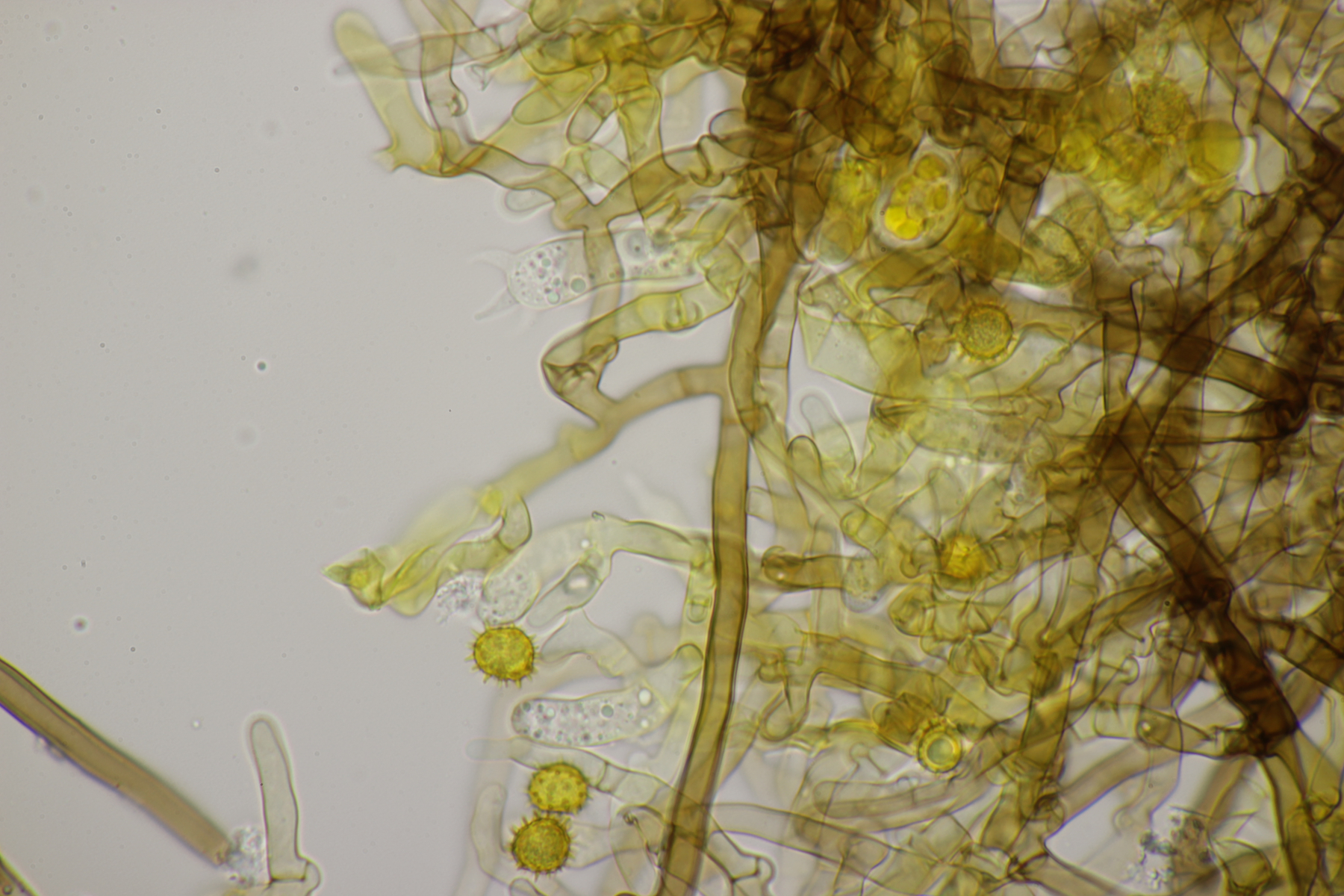 6. Eine Tomentella! Und zwar diesmal sogar etwas gut bestimmbares. Mit den runden Sporen von 7-9 µm und amyloidem Keimporus lande ich bei Tomentella bryophila.