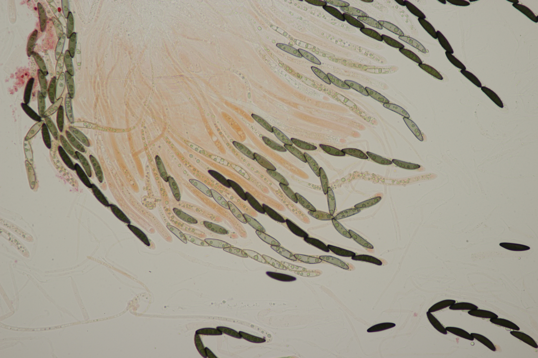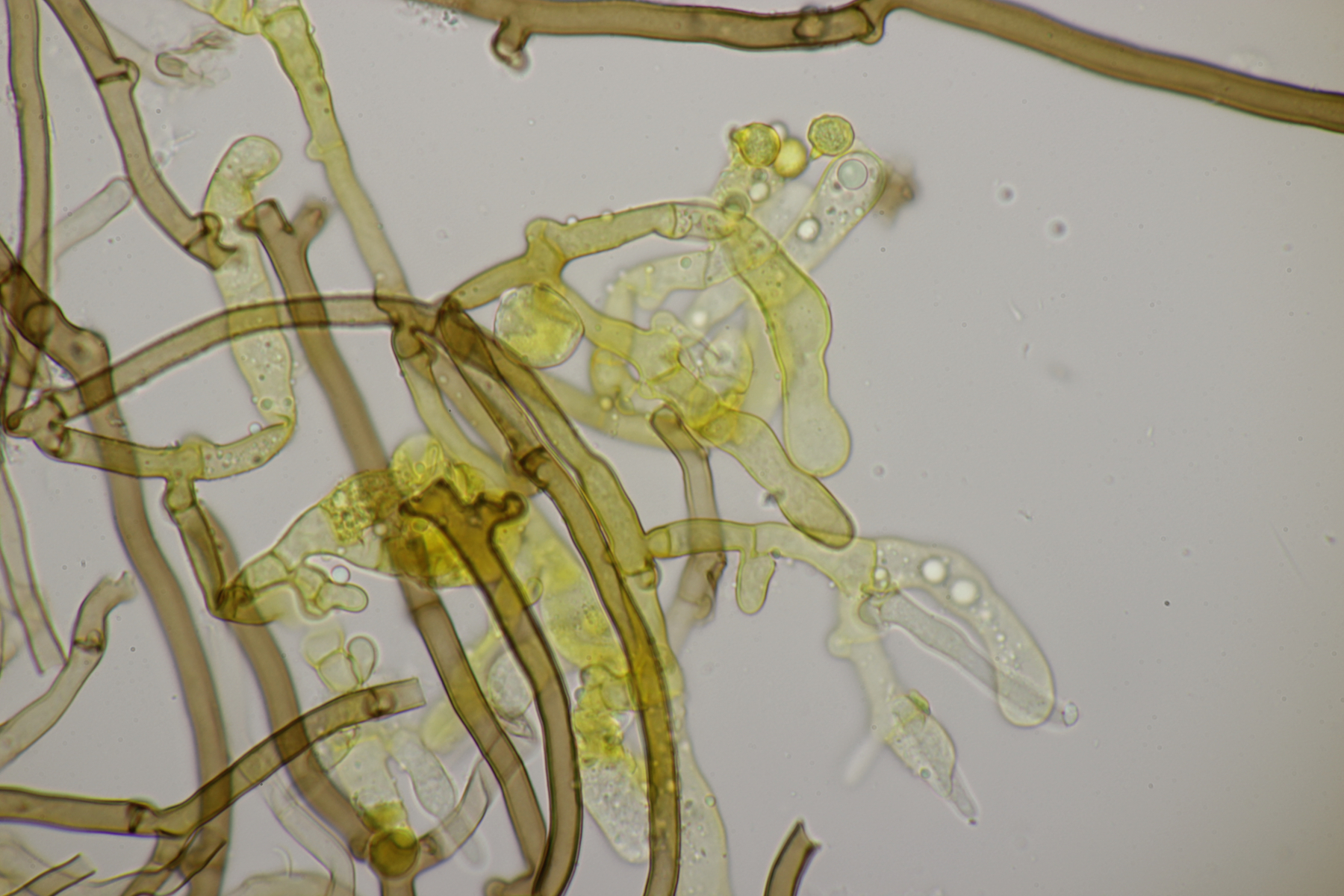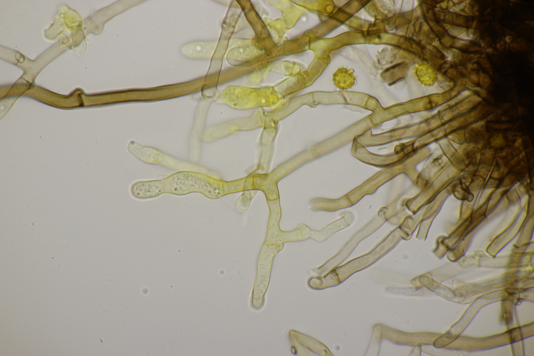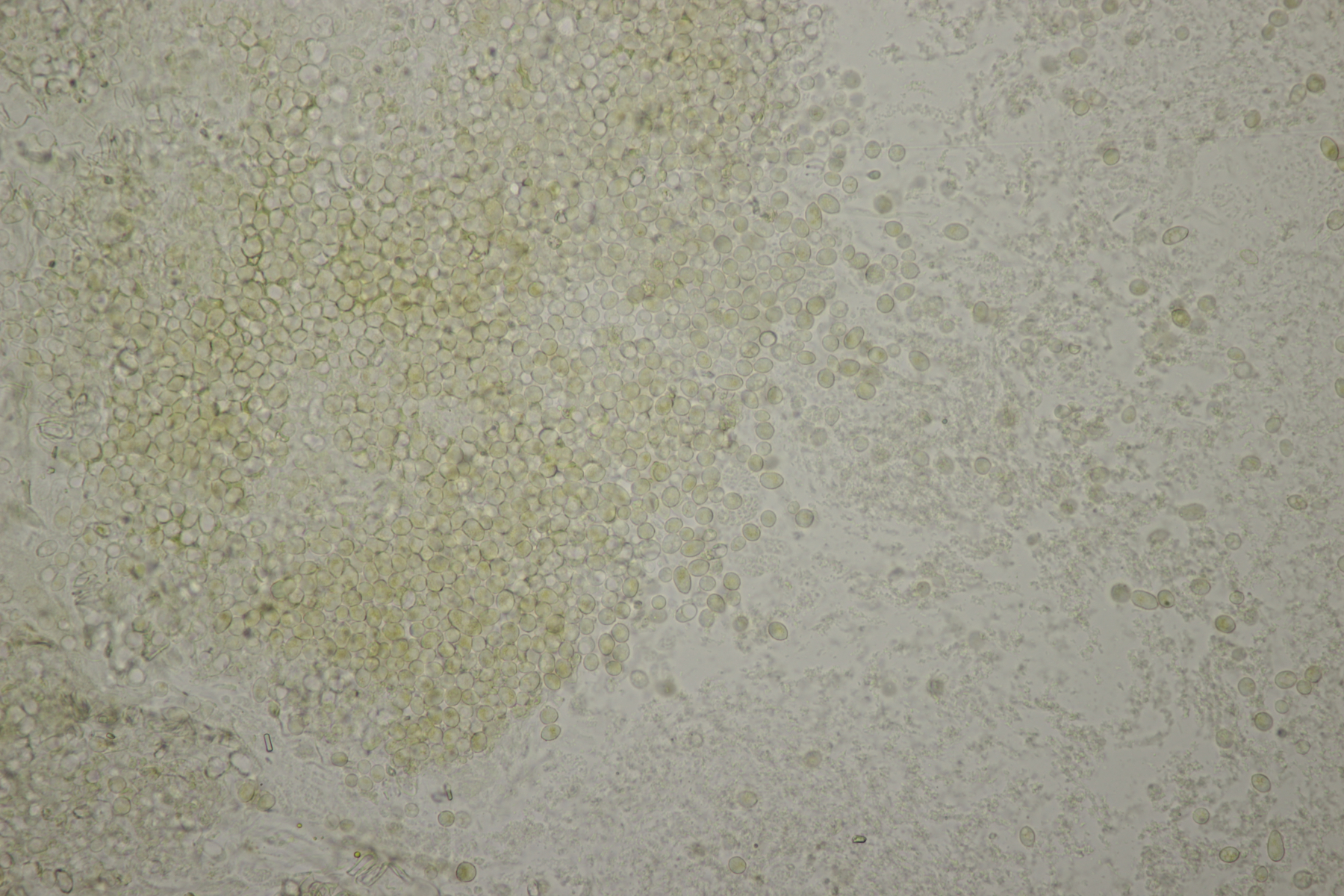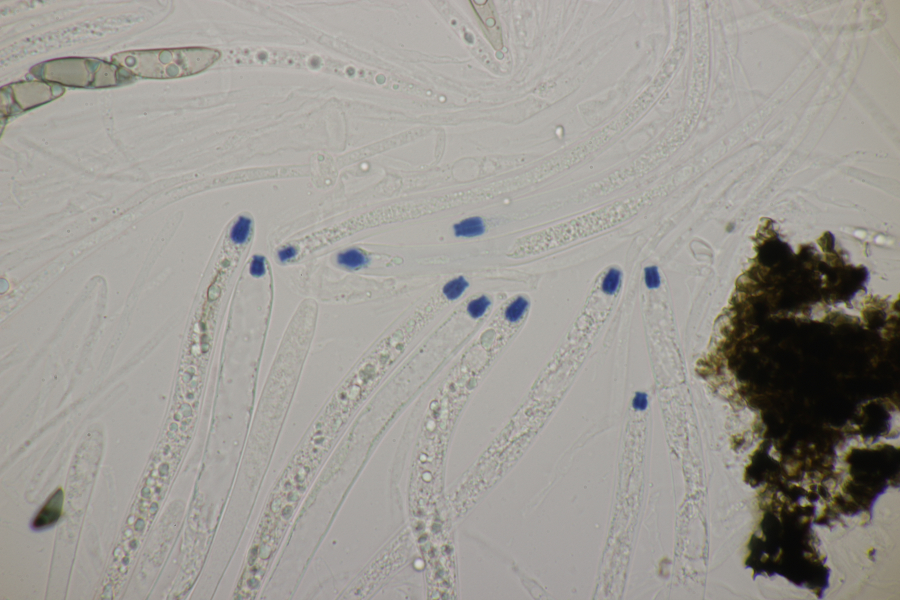 6. Eine Tomentella! Und zwar diesmal sogar etwas gut bestimmbares. Mit den runden Sporen von 7-9 µm und amyloidem Keimporus lande ich bei Tomentella bryophila.