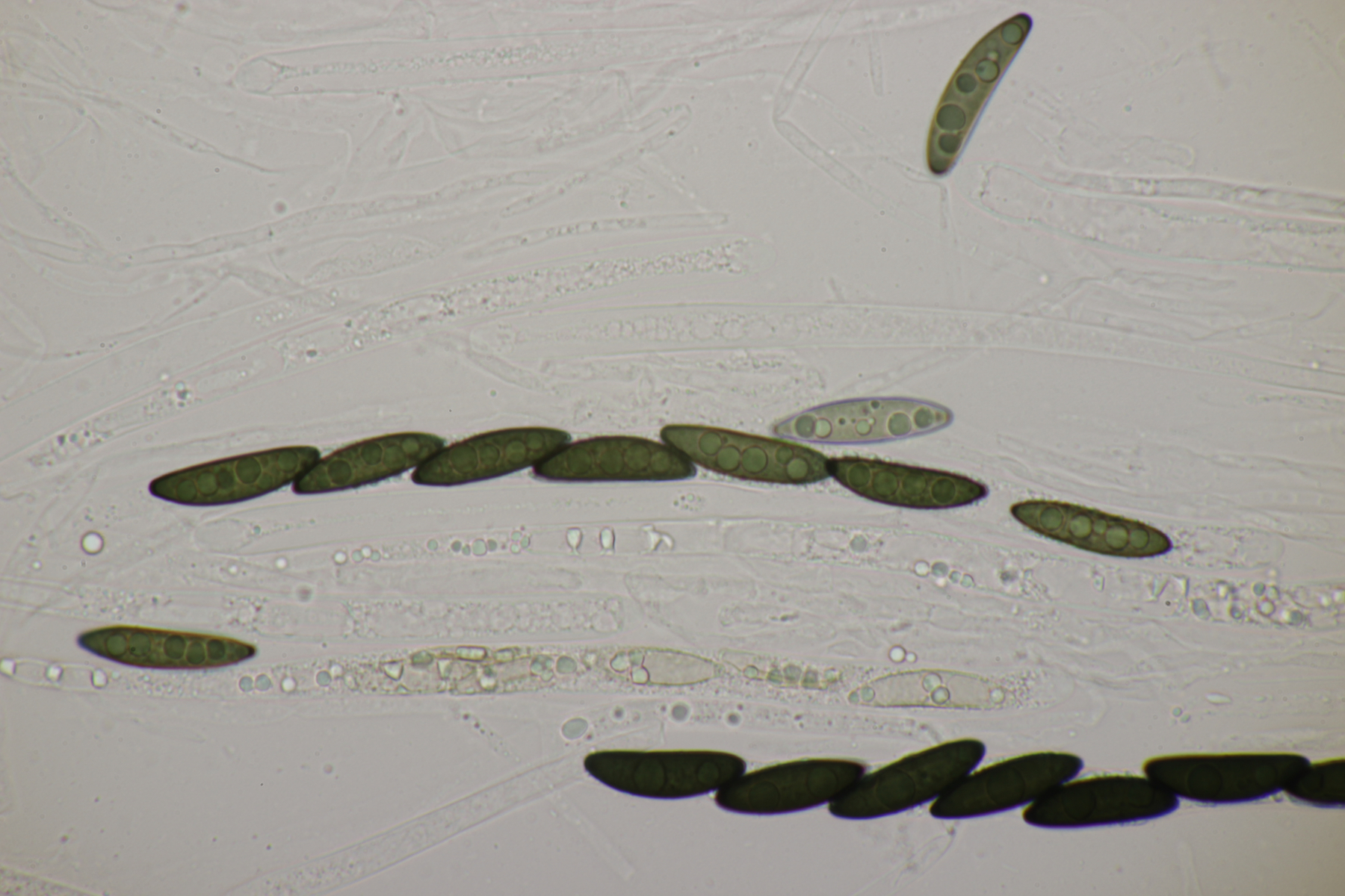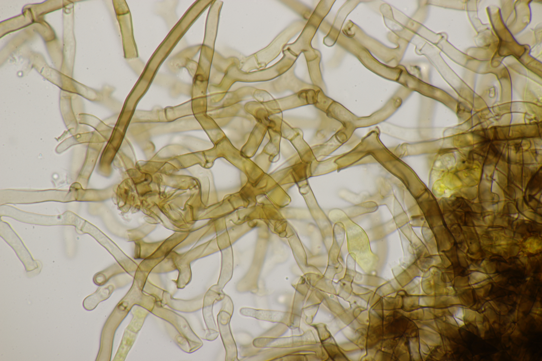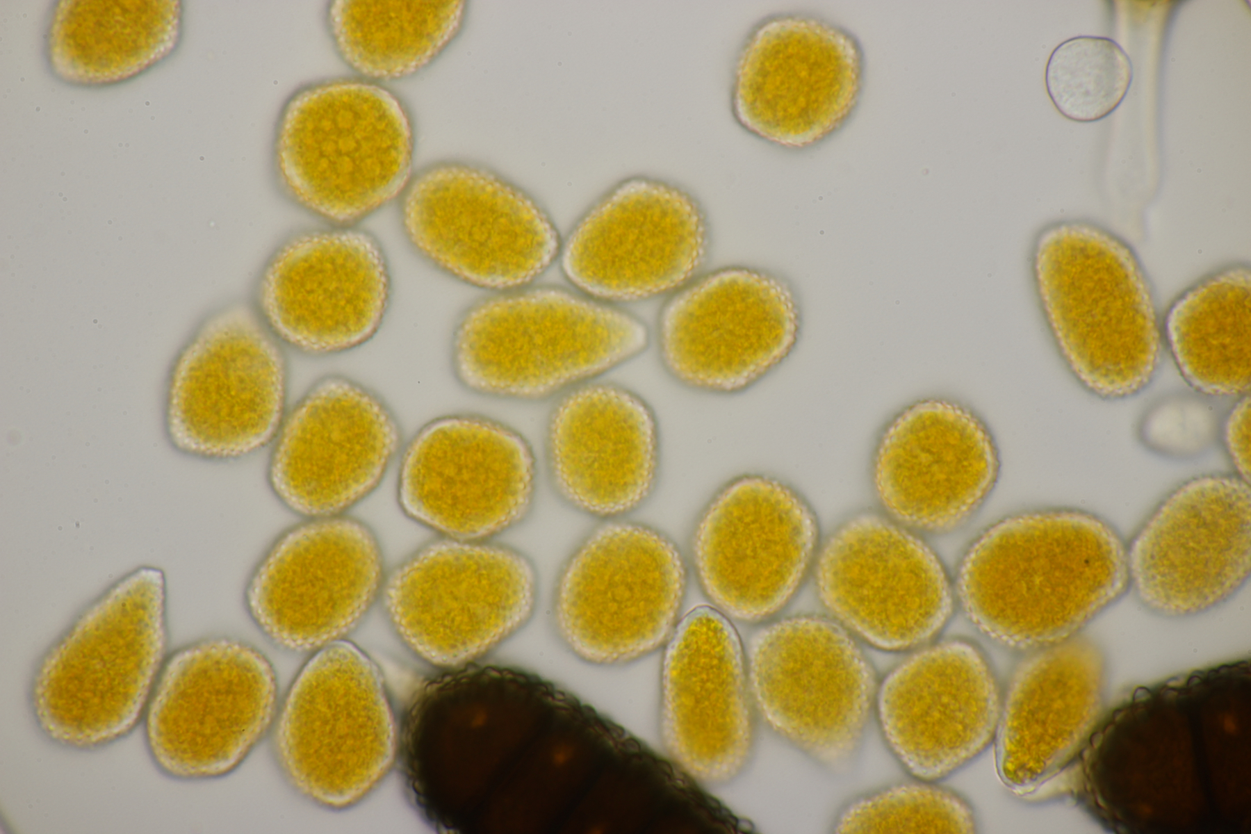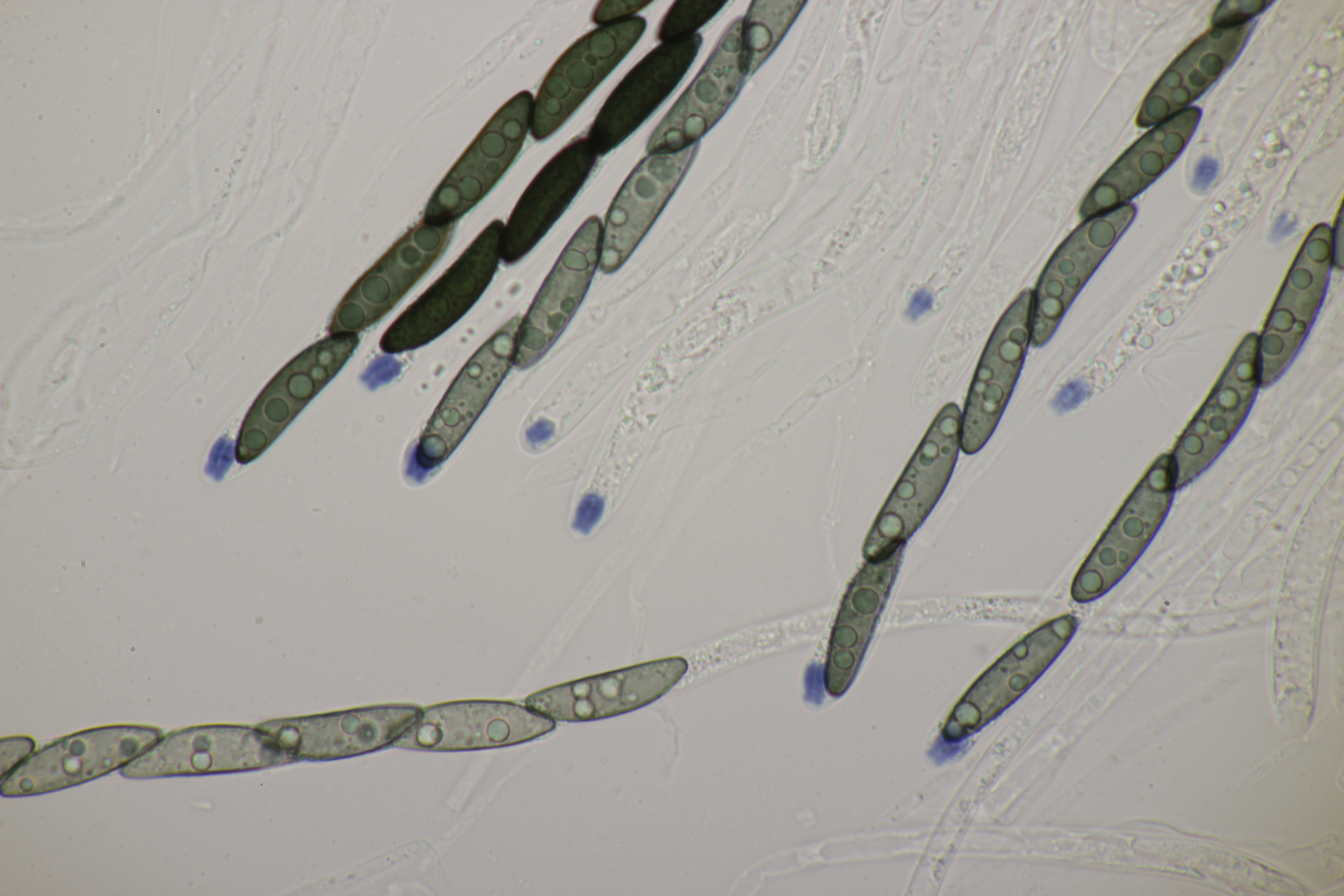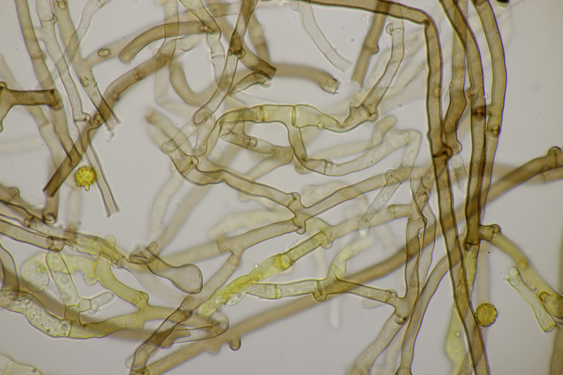 6. Eine Tomentella! Und zwar diesmal sogar etwas gut bestimmbares. Mit den runden Sporen von 7-9 µm und amyloidem Keimporus lande ich bei Tomentella bryophila.