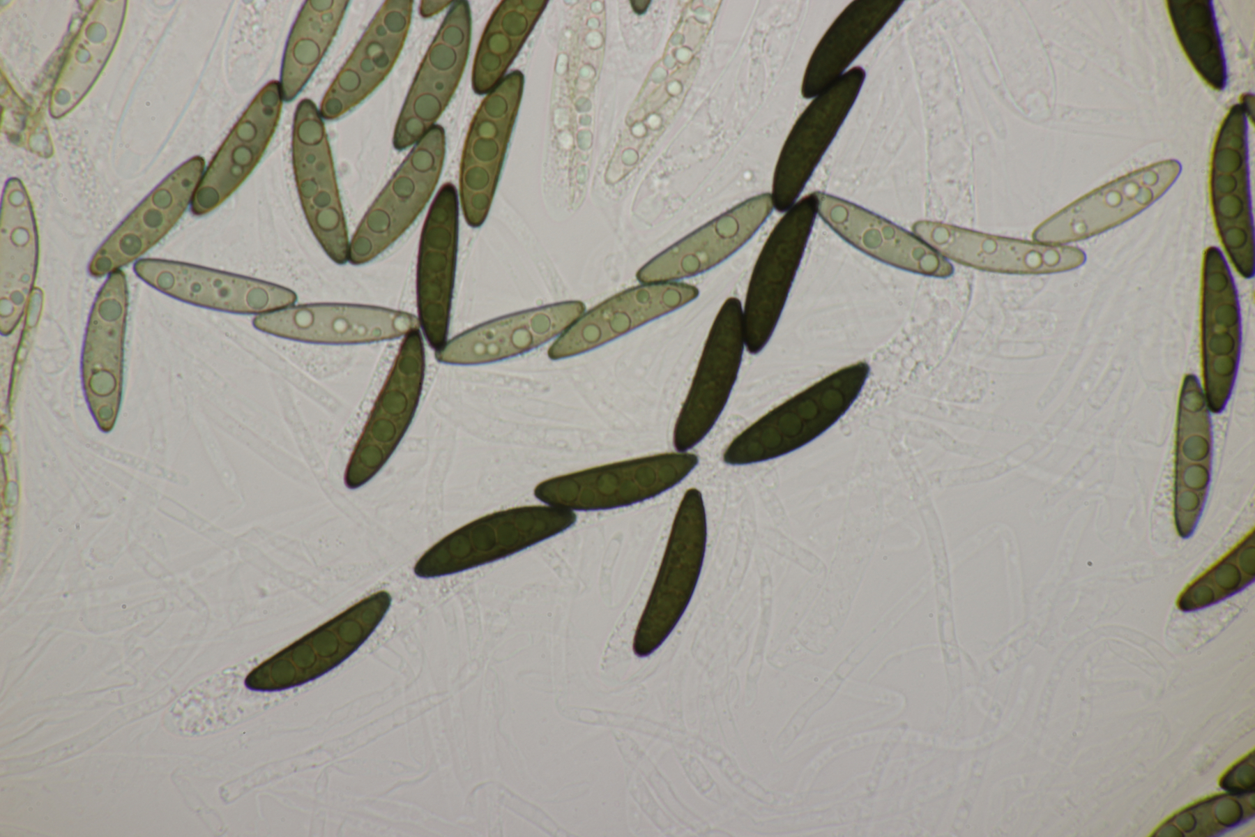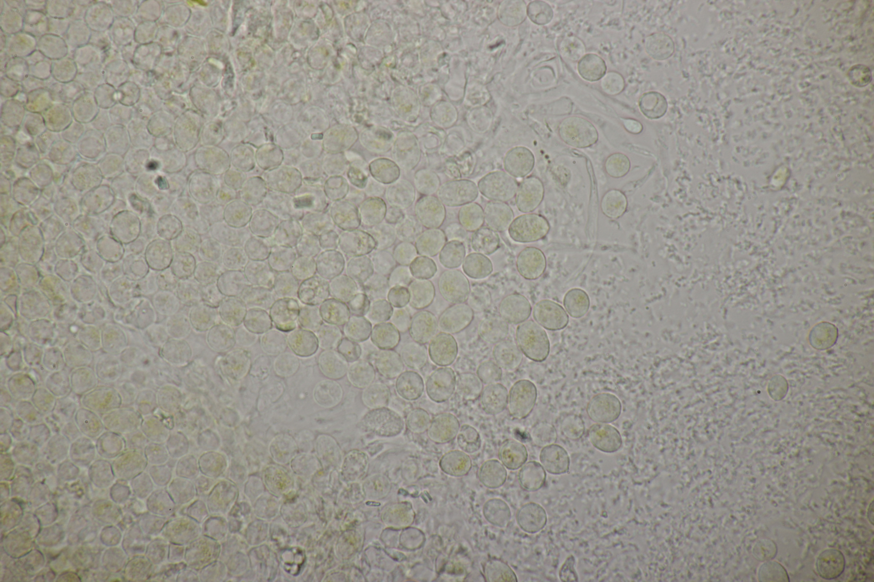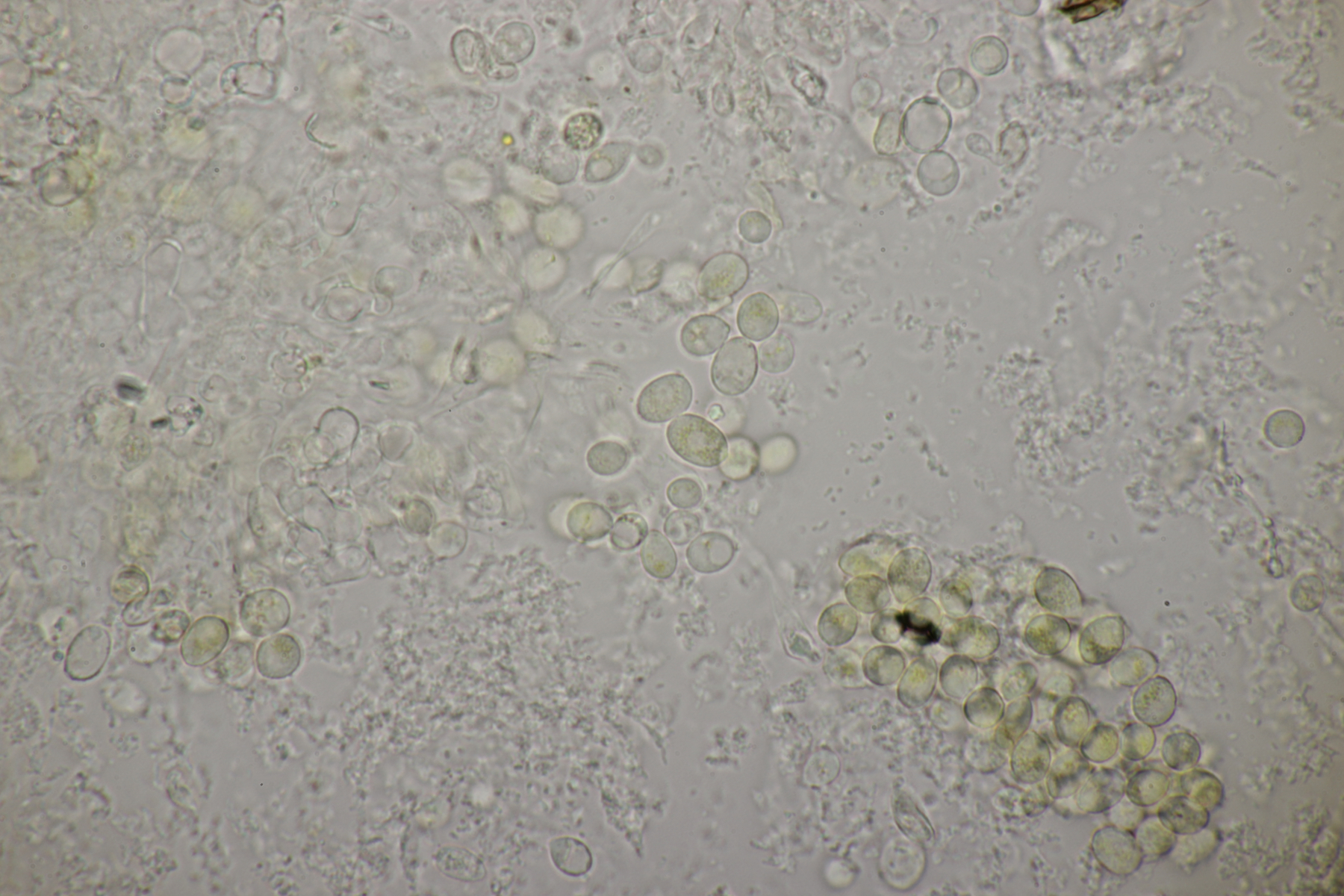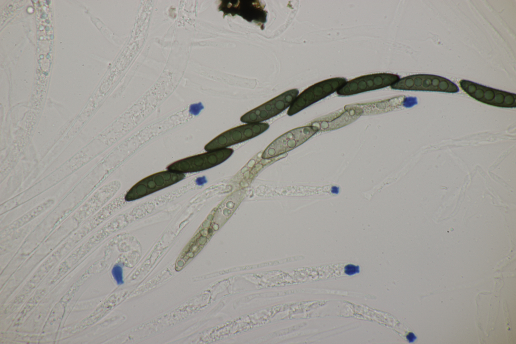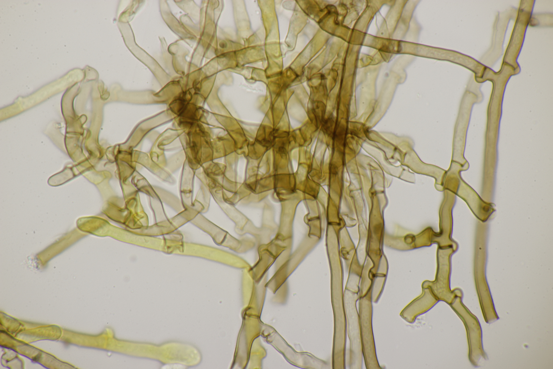6. Eine Tomentella! Und zwar diesmal sogar etwas gut bestimmbares. Mit den runden Sporen von 7-9 µm und amyloidem Keimporus lande ich bei Tomentella bryophila.