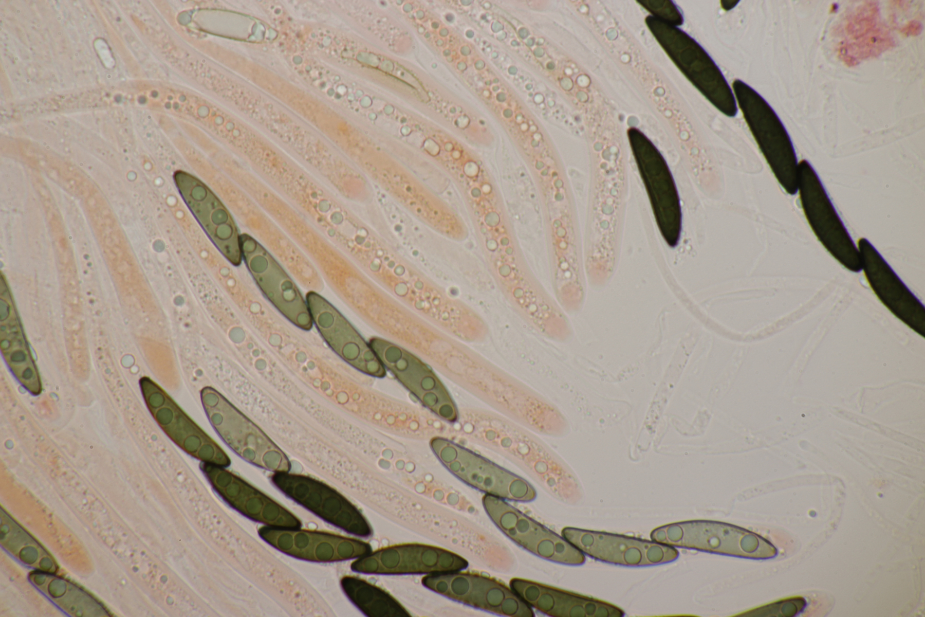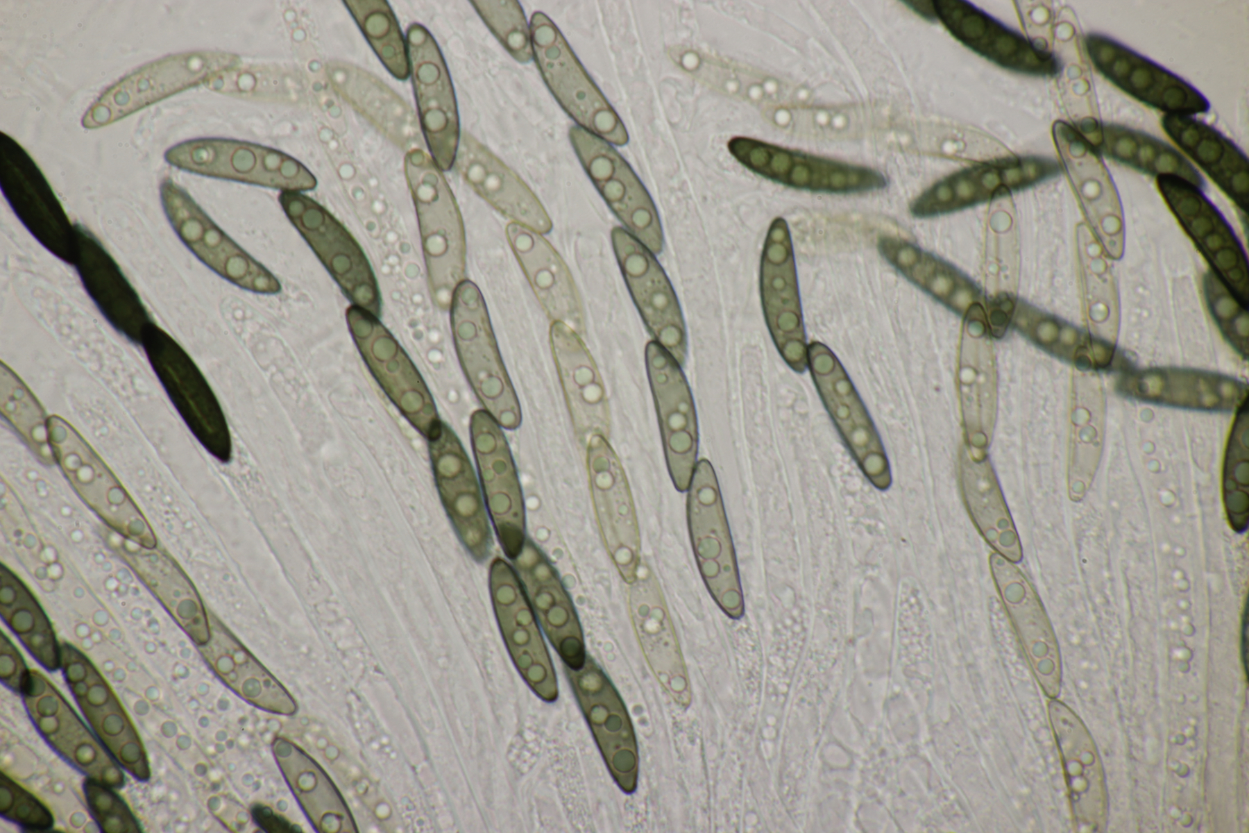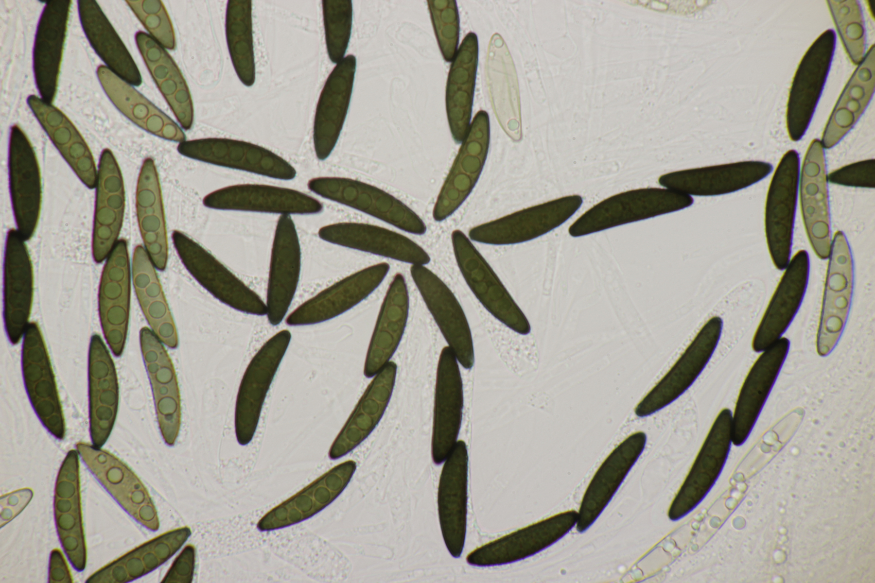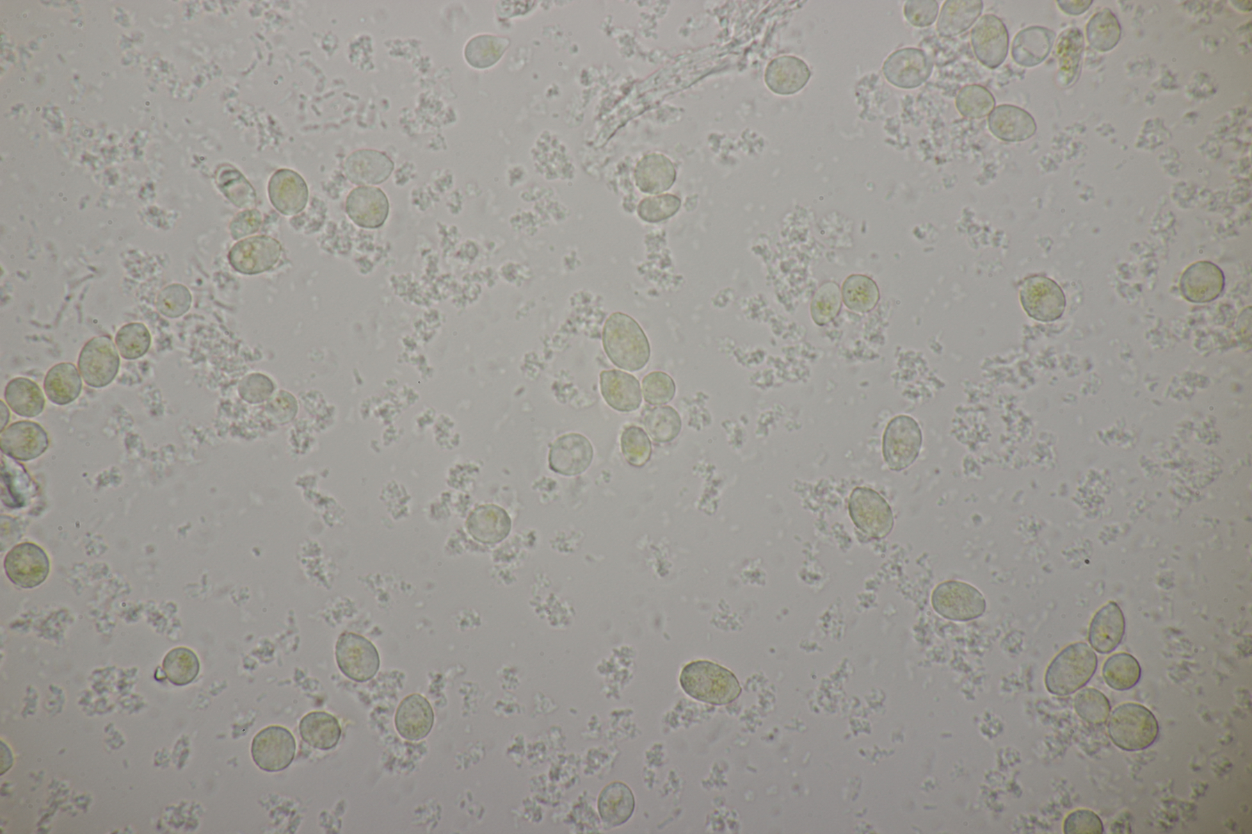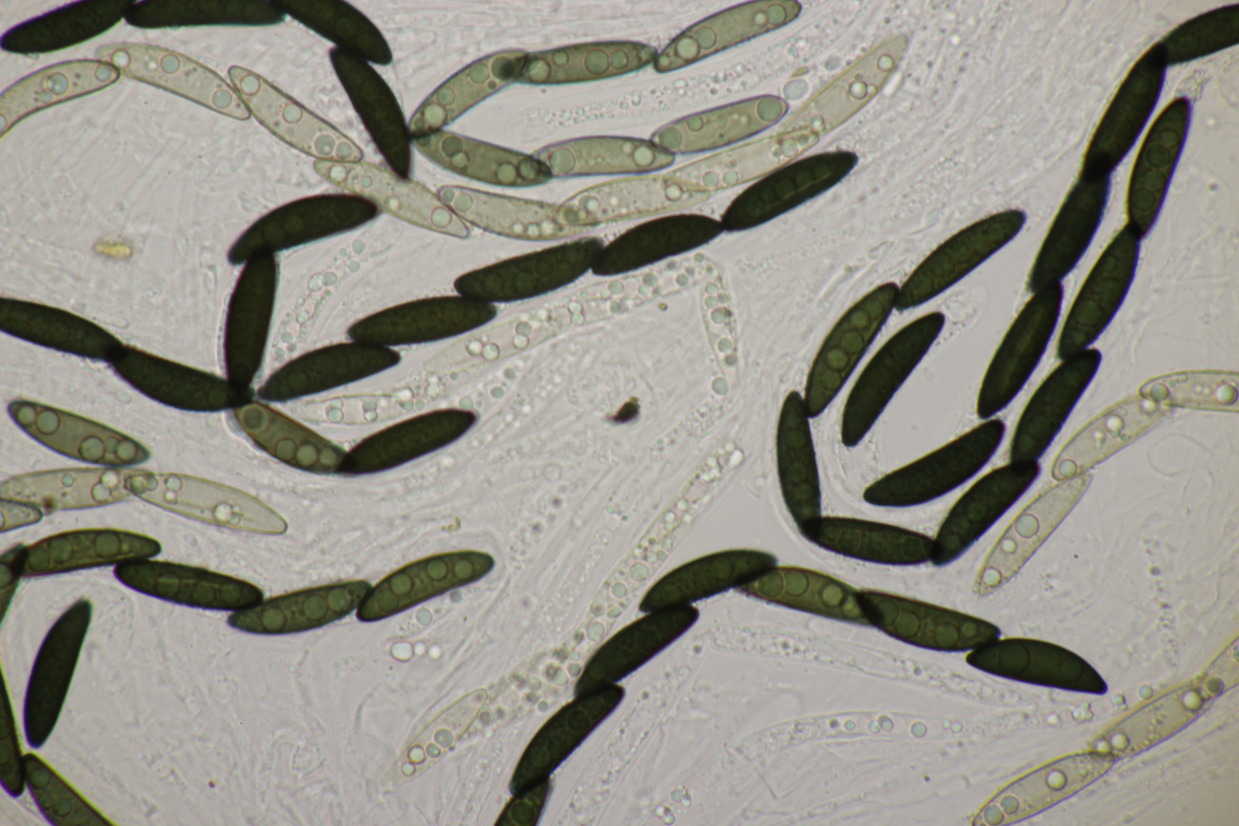6. Eine Tomentella! Und zwar diesmal sogar etwas gut bestimmbares. Mit den runden Sporen von 7-9 µm und amyloidem Keimporus lande ich bei Tomentella bryophila.