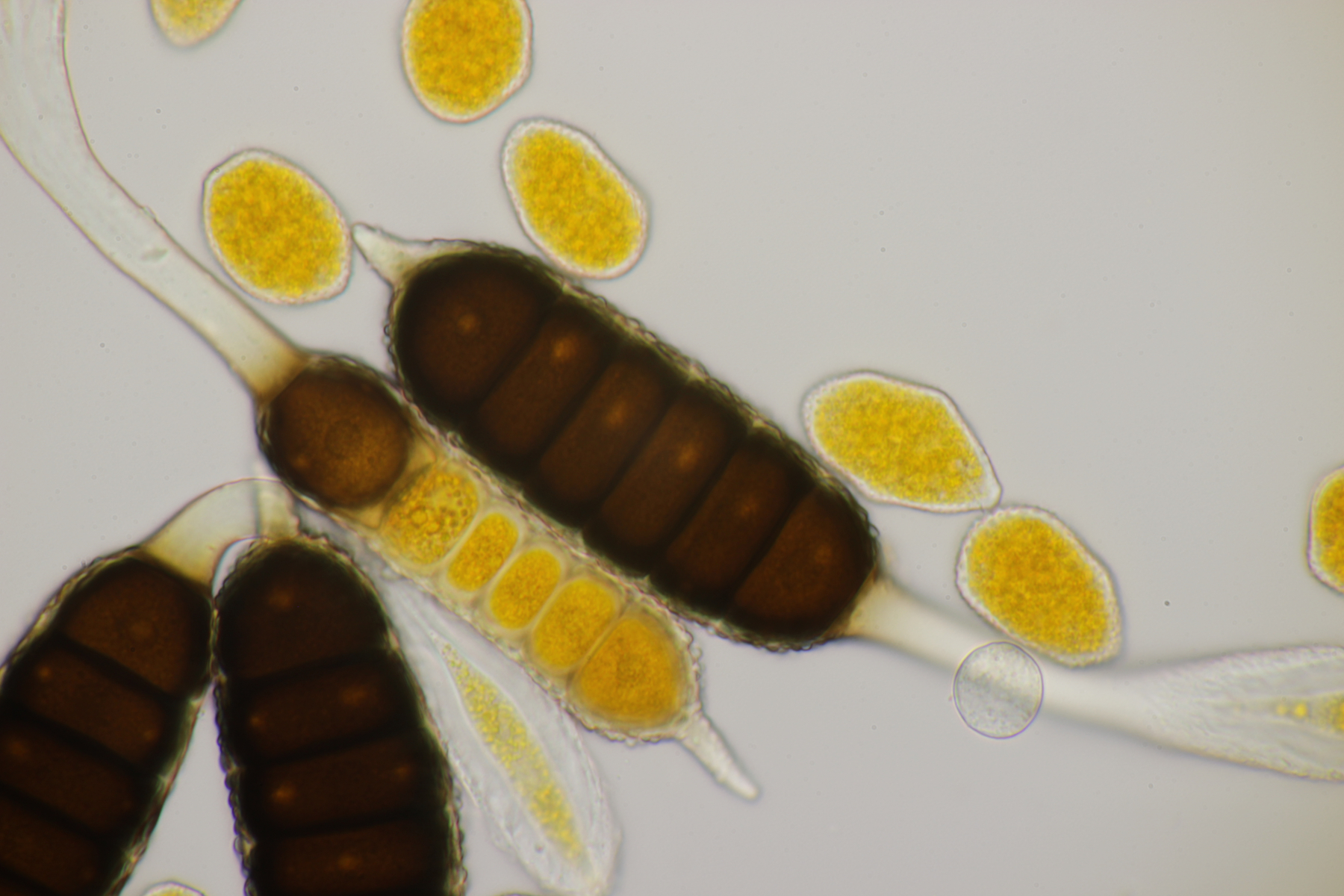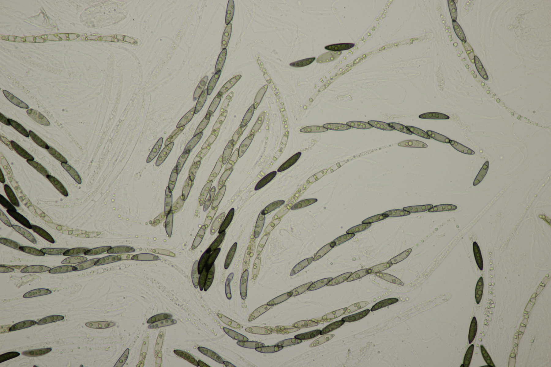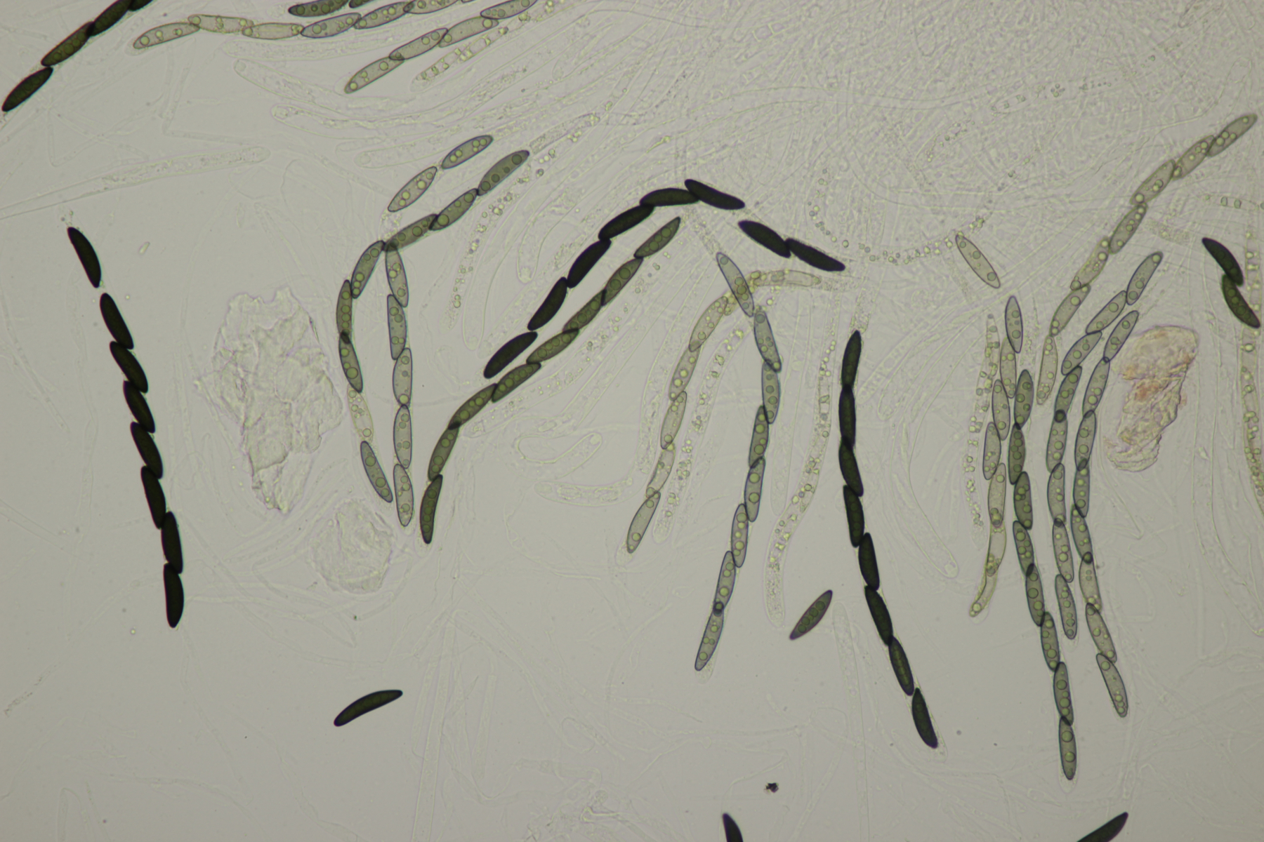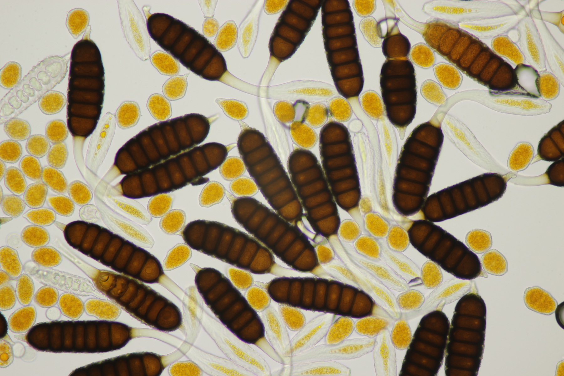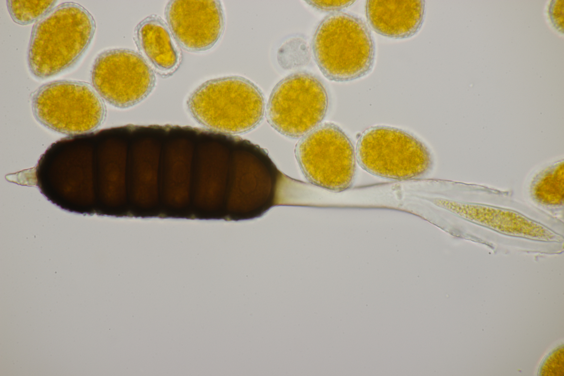 4. Mal wieder ein Rosenrost. Die Zellenzahl der Teliosporen liegt gleichverteilt bei 6 und 7 Zellen, das hilft also nicht. Aber die Spitze ist ziemlich abrupt aufgesetzt und der Stiel allmählich verdickt, so daß ich zu Phragmidium tuberculatum tendiere. Dazu passen auch die relativ deutlichen Keimporen der Uredosporen