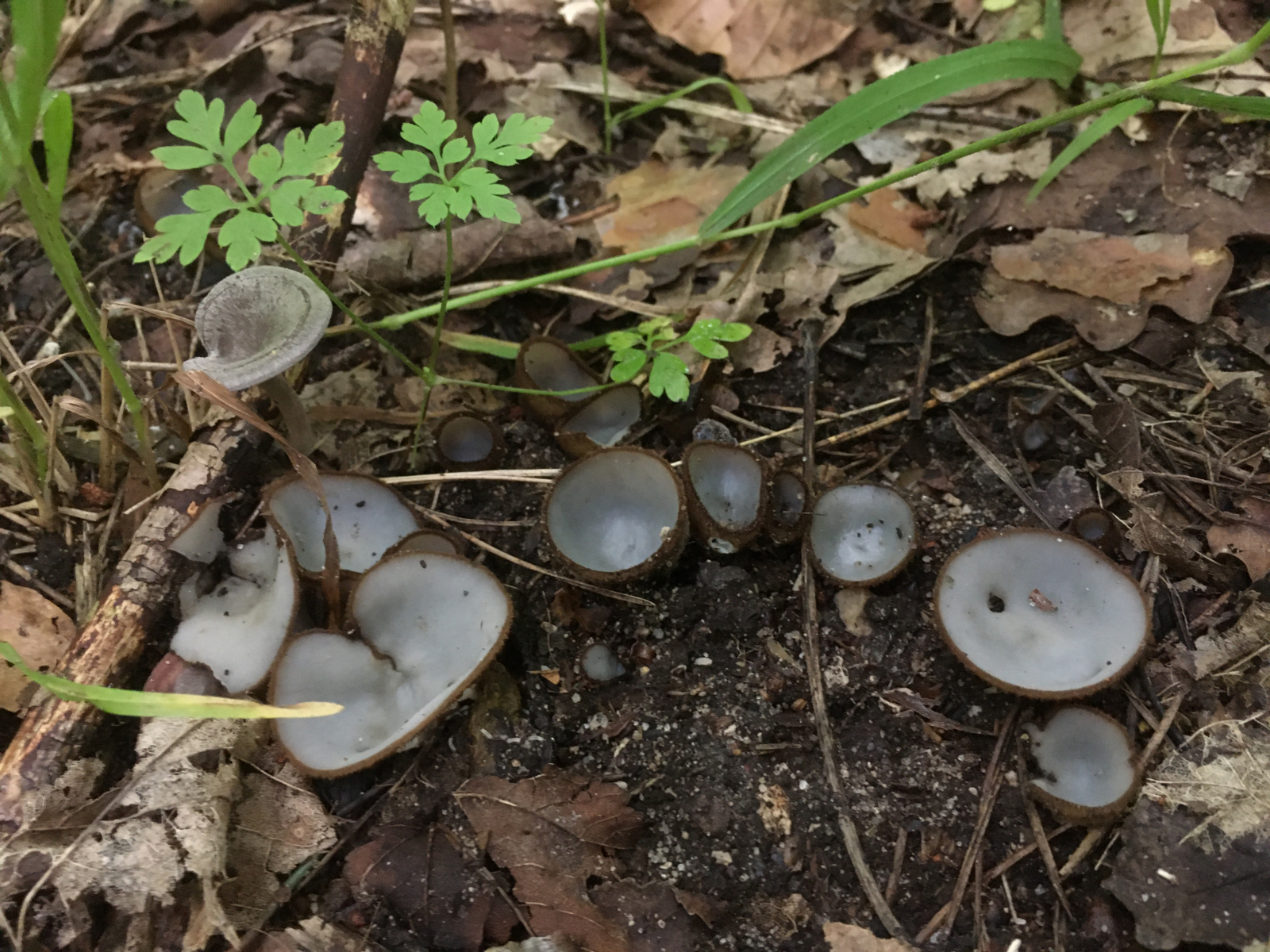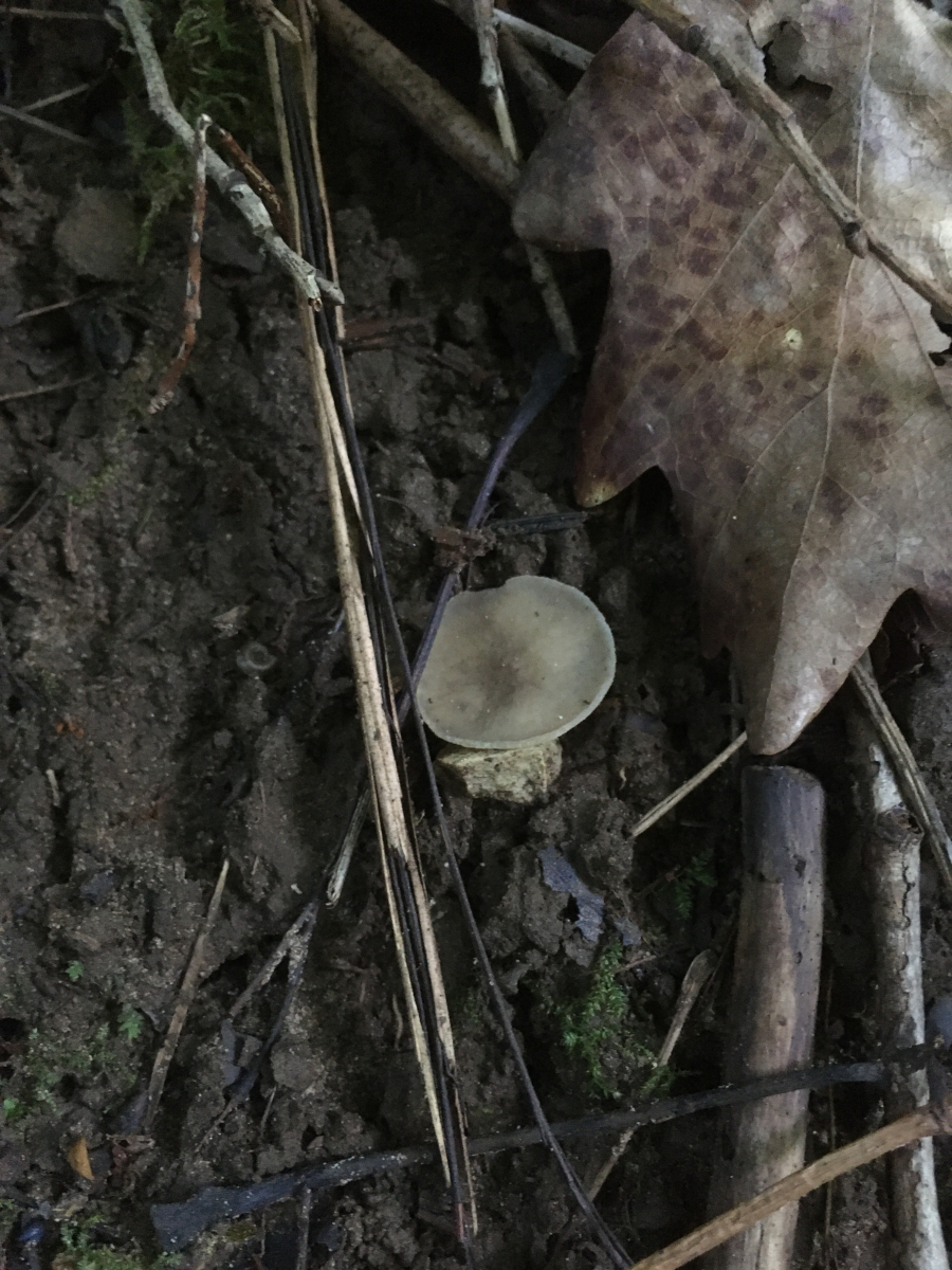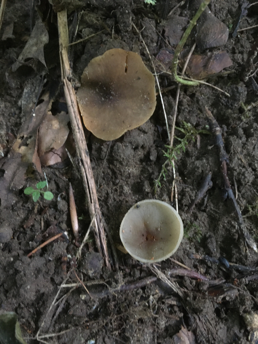 Am Ende der Wanderung schon fast in der Dämmerung fand ich nochmal Becher, die den Ausflug zum Glück besser überstanden. Sie wuchsen auf nackter Erde an einem Hohlweg unter Eiche, Hasel und Hainbuche. Bemerkenswert fand ich dass sie so flach wie eine Untertasse daherkamen. Das hatte ich bisher nur bei Gyromitra ancilis im Frühjahr gesehen. Und selbst die war nicht ganz so flach anliegend.