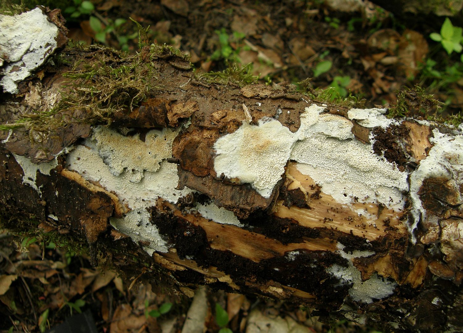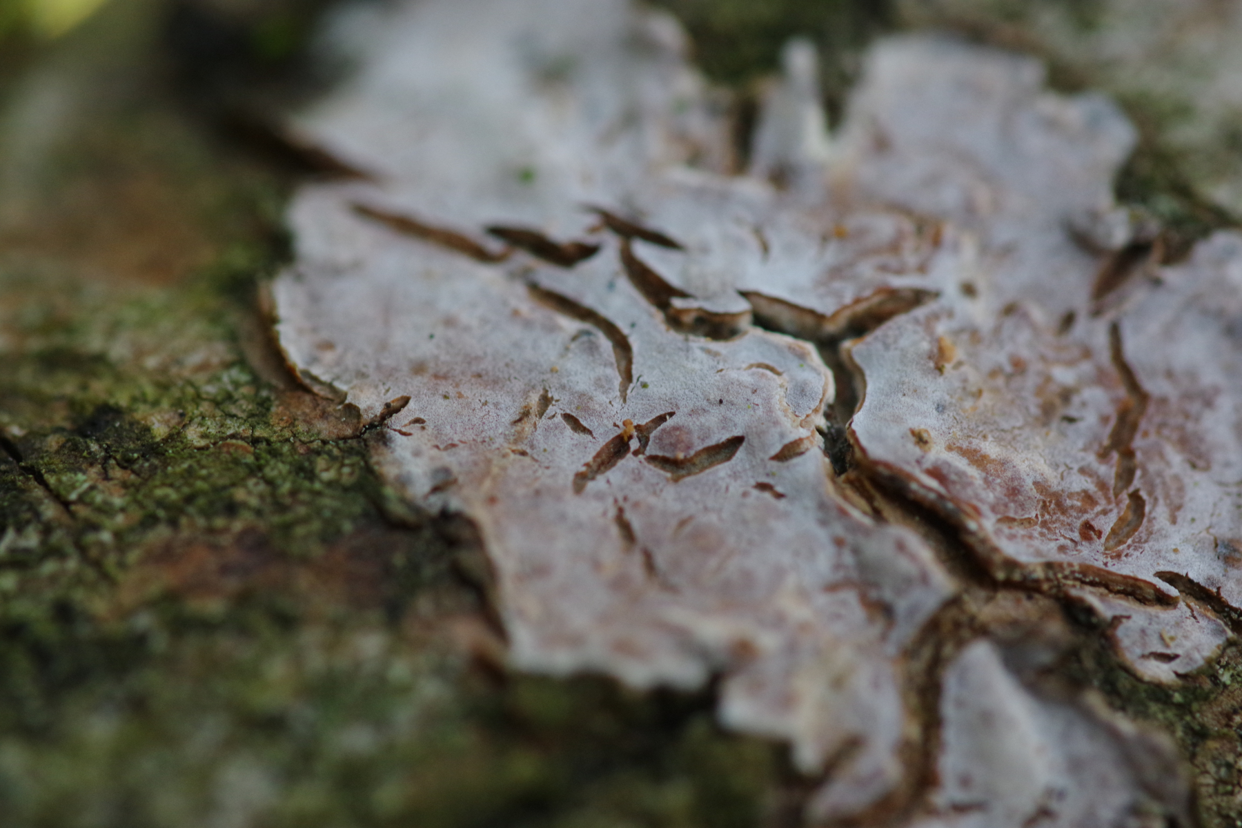 1) gleich neben der Espe, an der Inonotus rheades wächst, wo ich nicht verpassen möchte, wenn die neuen Fruchtkörper kommen, gibt es an einer toten, geneigten, dünnen Espe diese ins Rosa gehende Kruste