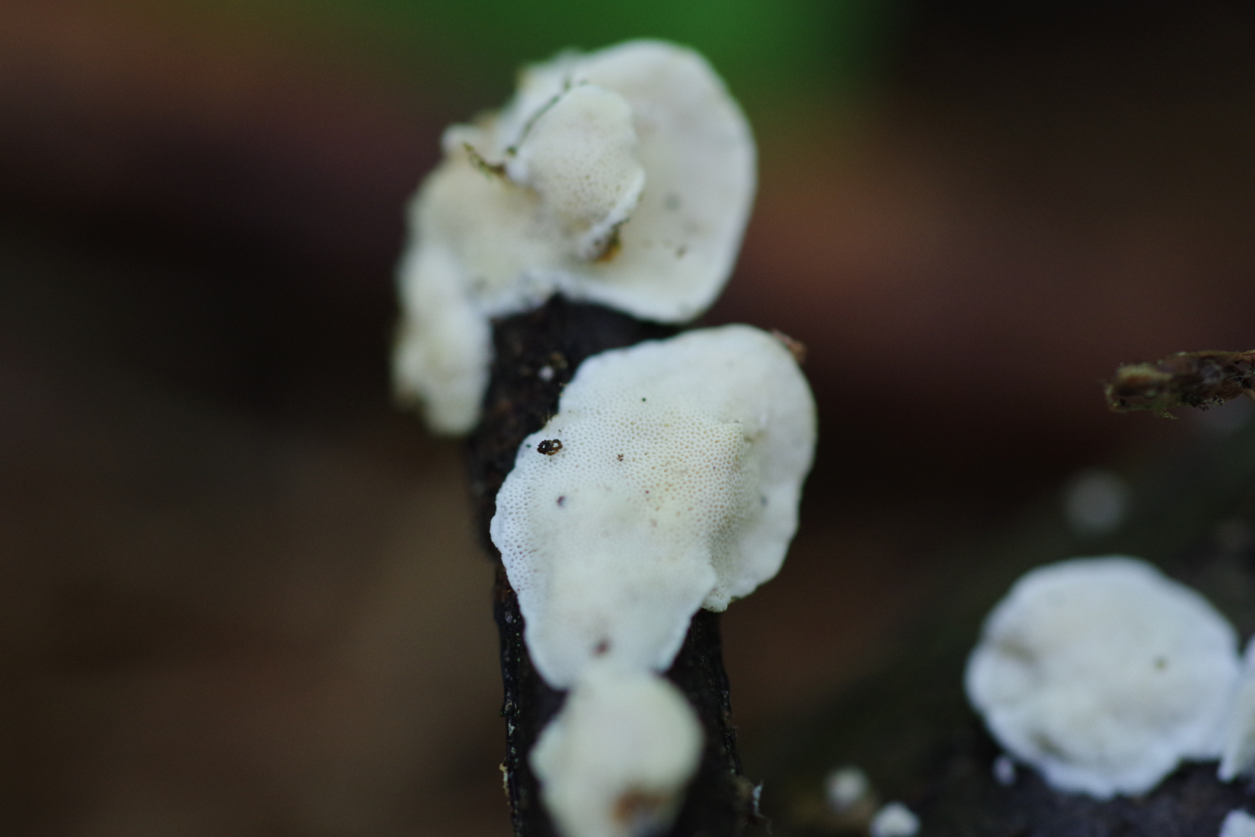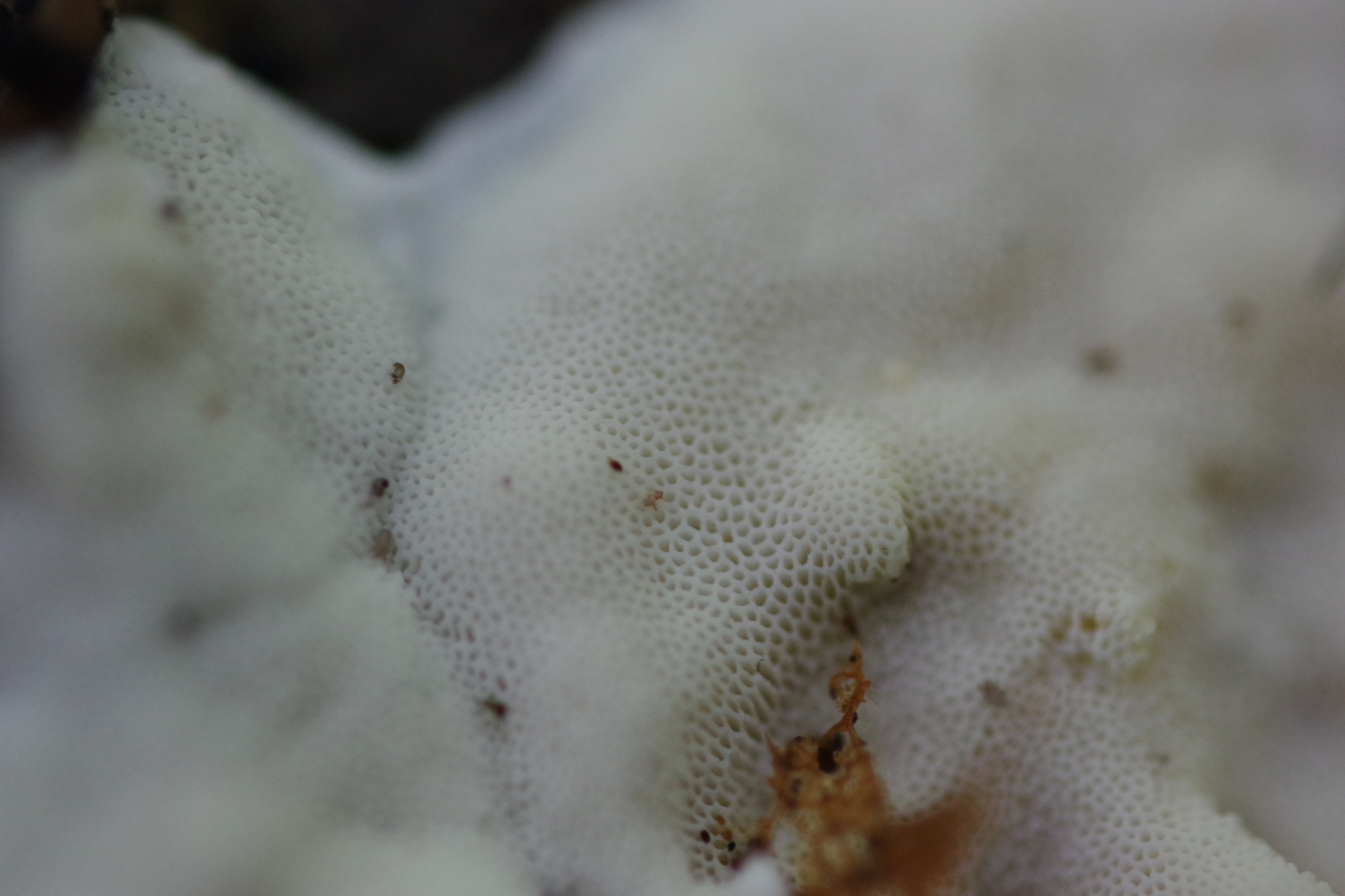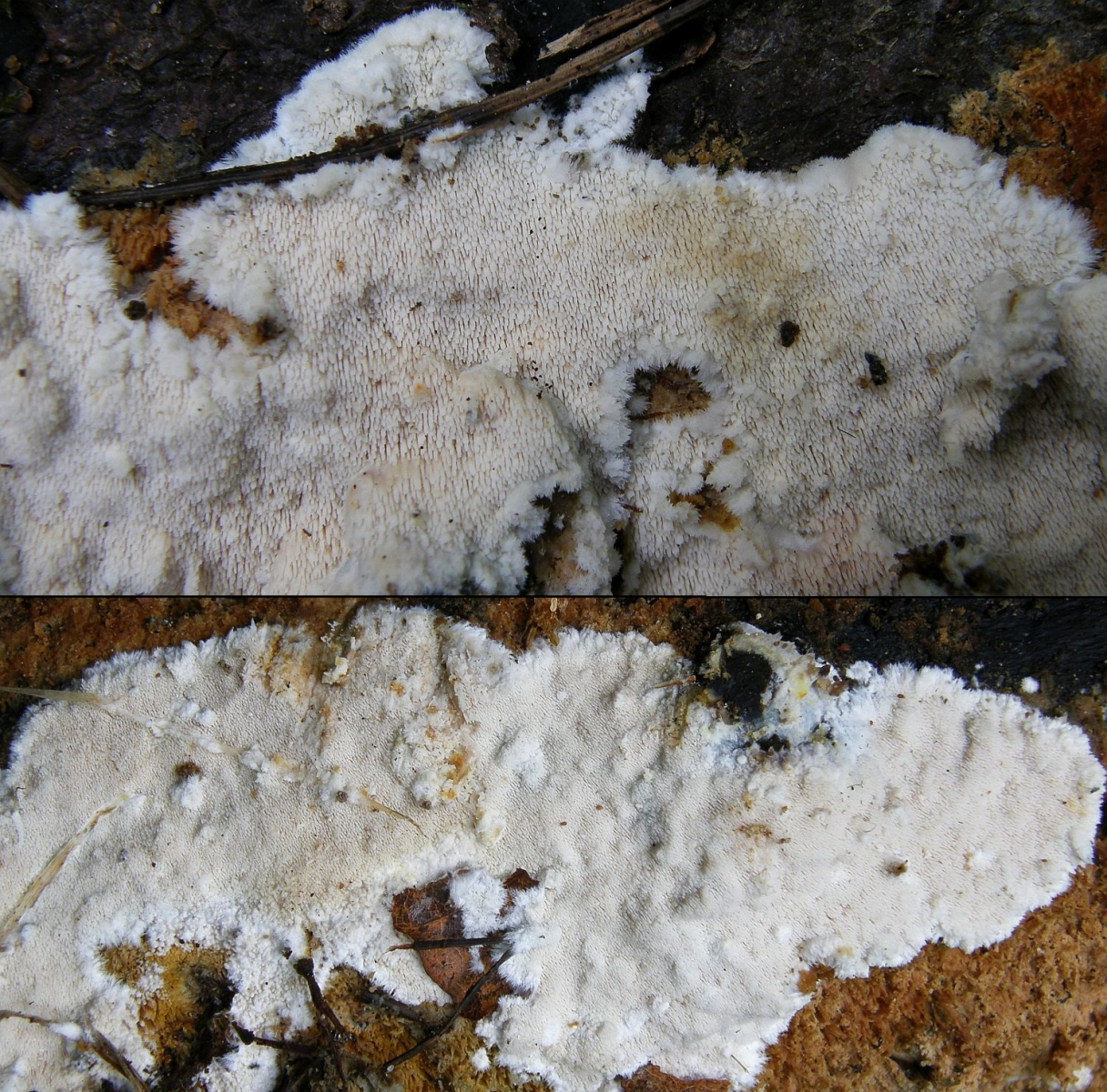ein weißer, feinporiger, resupinater bis kleine Hüte bildender Pilz, oberseits bräunlich, filzig. In älter ist der gelblich, ocker. Skeletocutis nivea scheint mir hier ein plausibler Arbeitstitel.