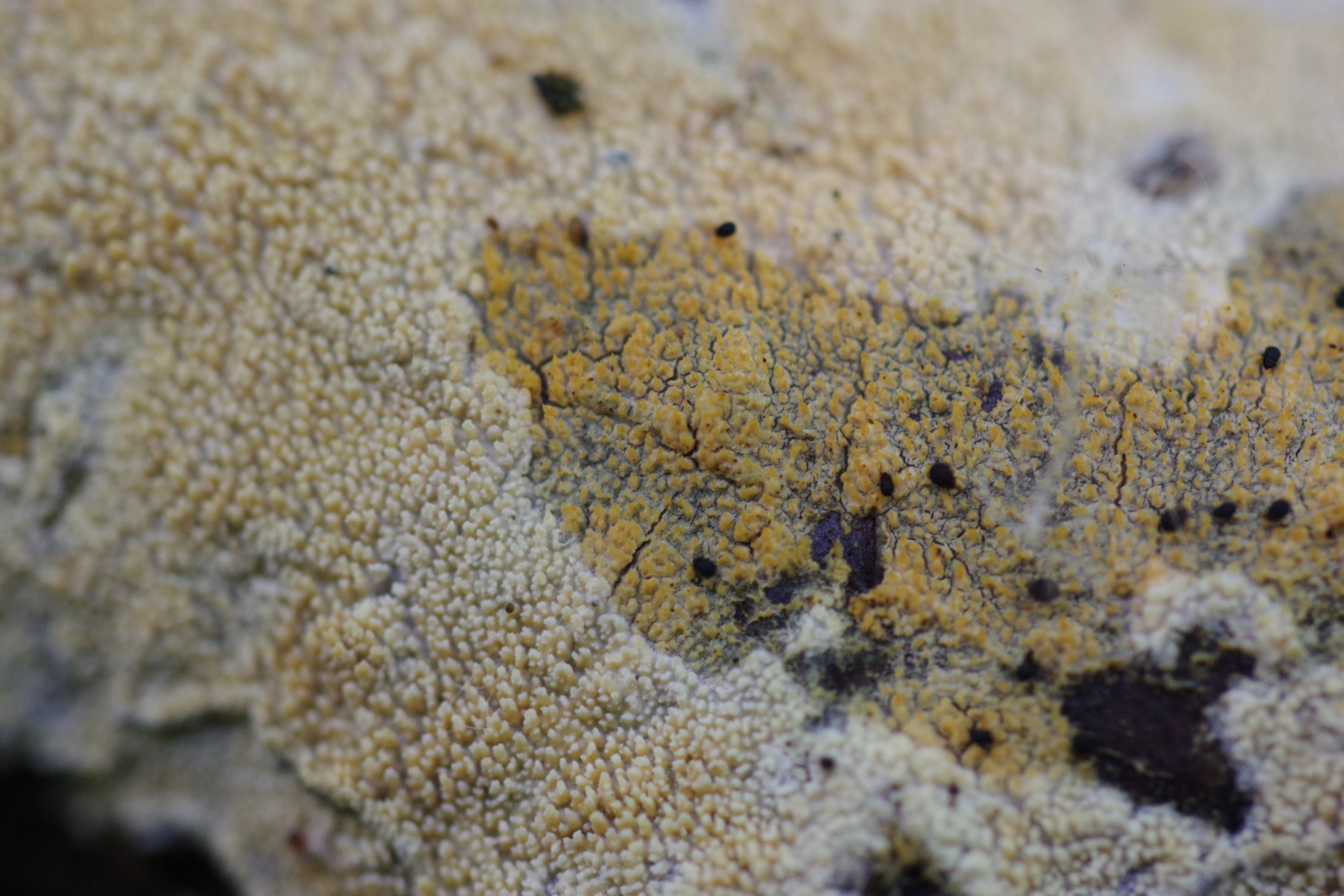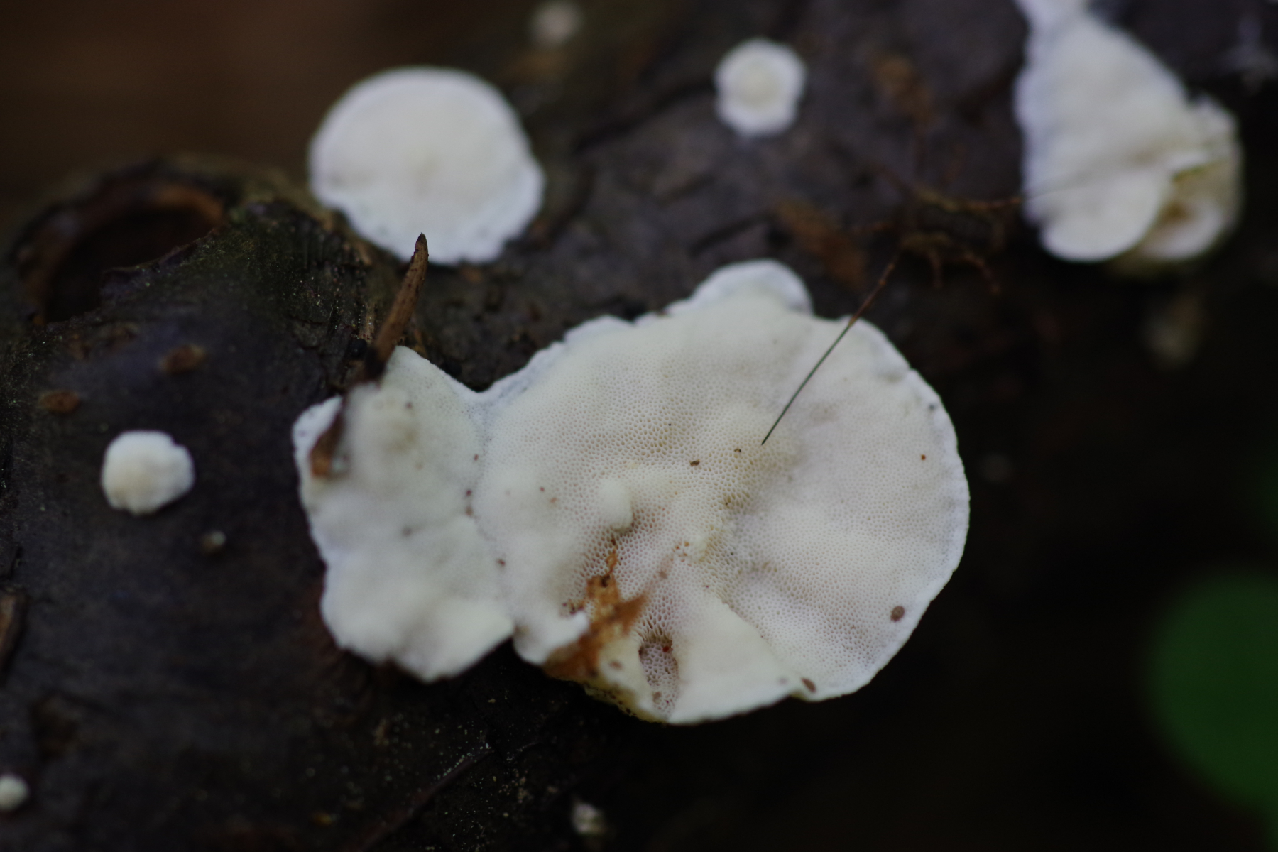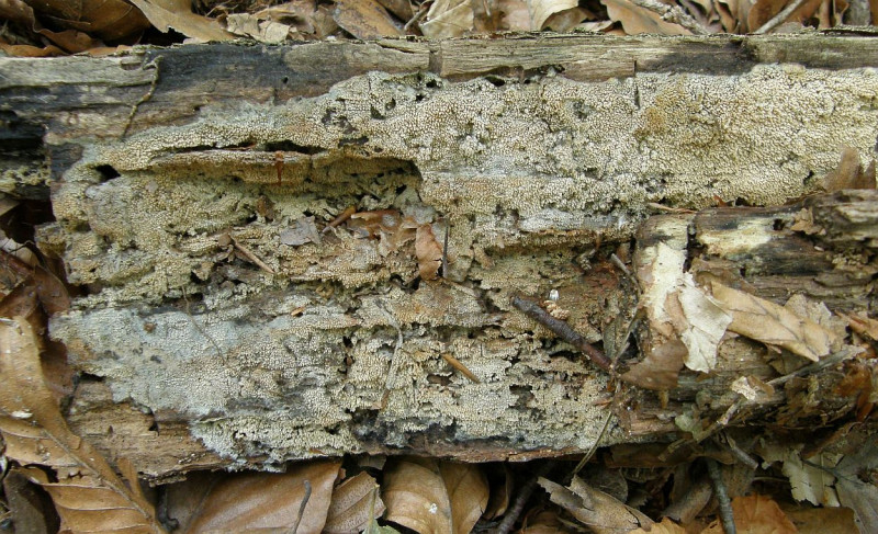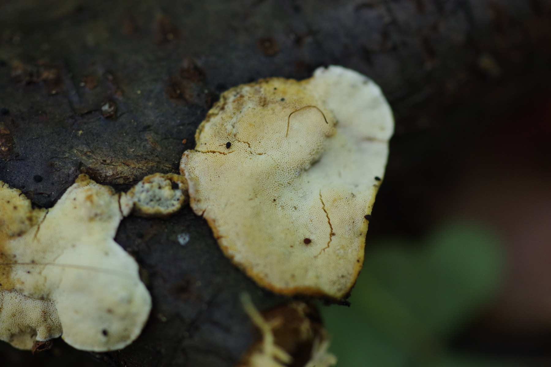 ein weißer, feinporiger, resupinater bis kleine Hüte bildender Pilz, oberseits bräunlich, filzig. In älter ist der gelblich, ocker. Skeletocutis nivea scheint mir hier ein plausibler Arbeitstitel.