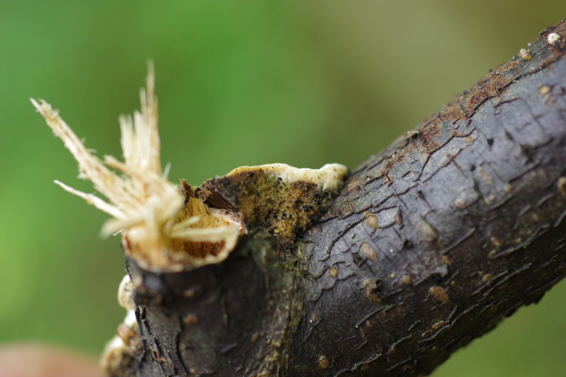 5) der Rest ist an einem auf dem Boden liegenden Zweig von Traubenkirsche (Prunus padus), ein Substrat, an dem ich noch nicht so viel hatte
