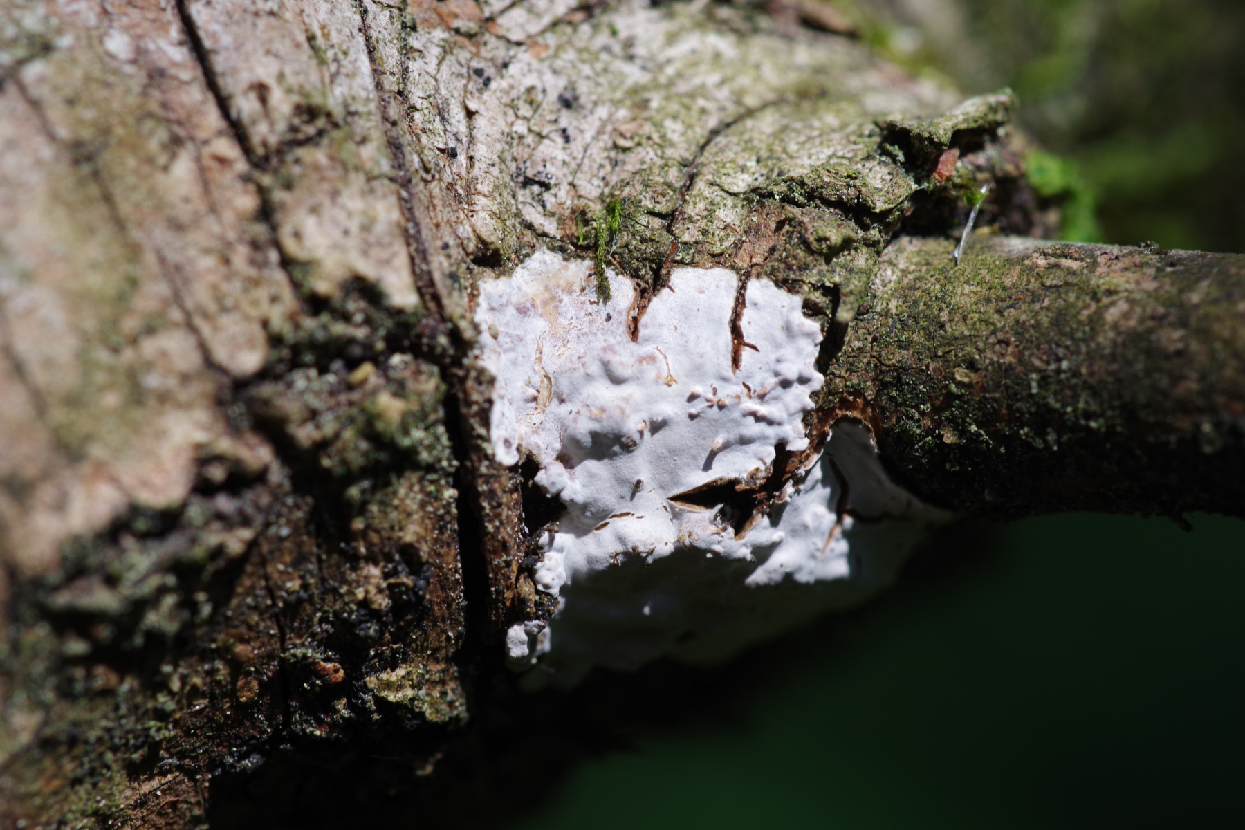 1) gleich neben der Espe, an der Inonotus rheades wächst, wo ich nicht verpassen möchte, wenn die neuen Fruchtkörper kommen, gibt es an einer toten, geneigten, dünnen Espe diese ins Rosa gehende Kruste