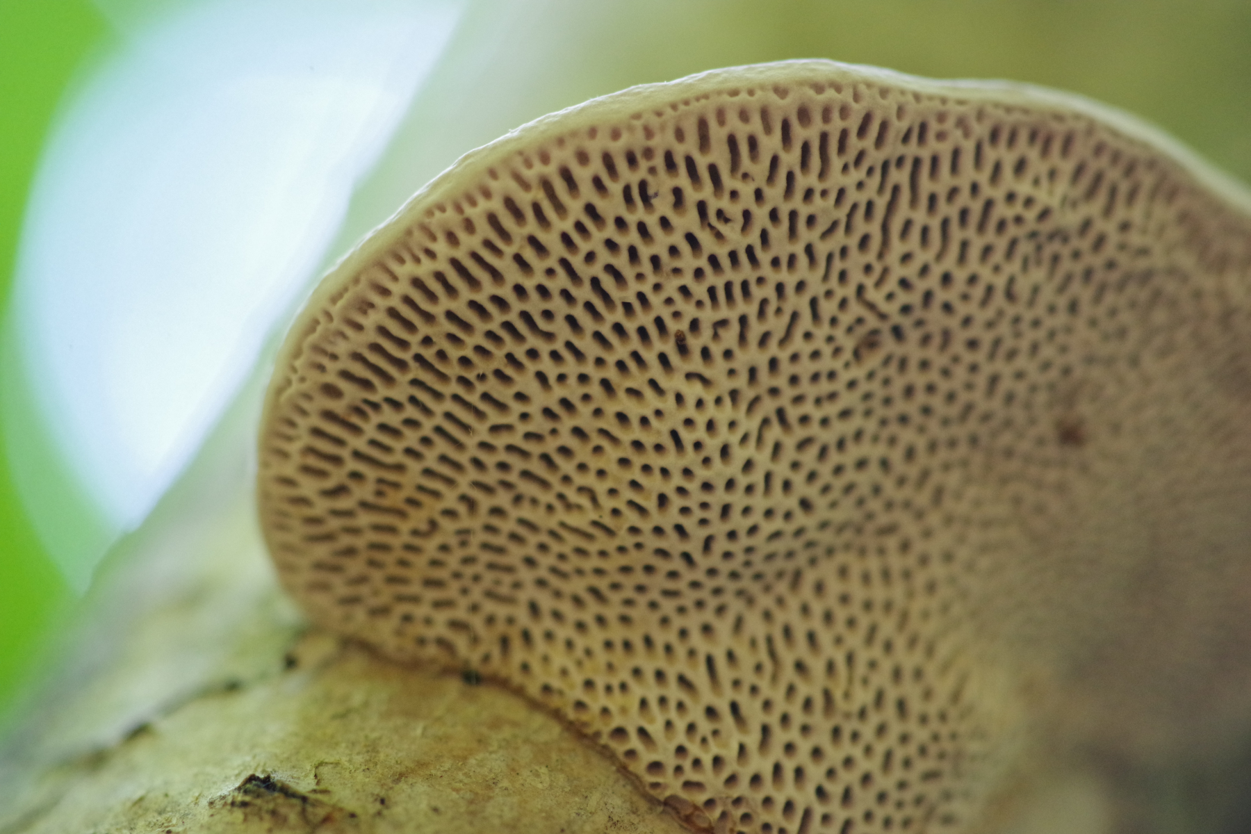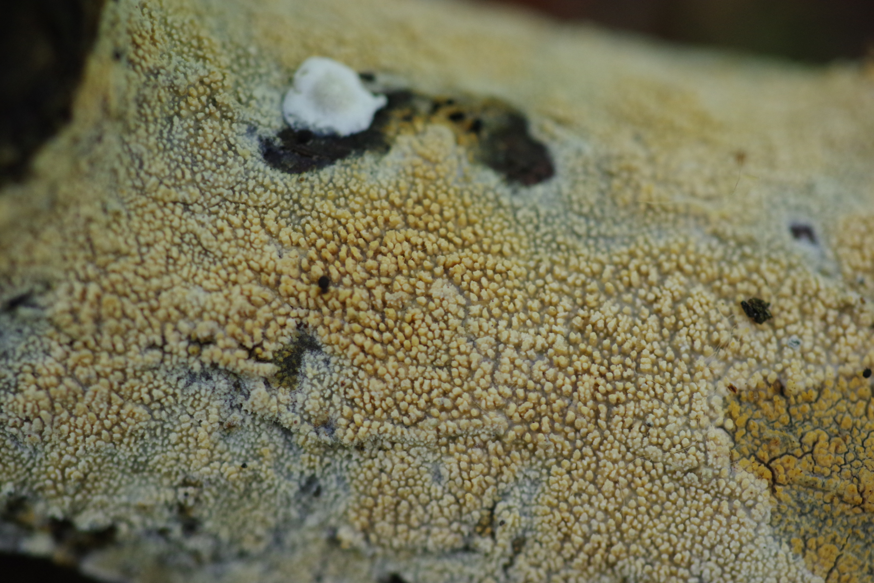 ein weißer, feinporiger, resupinater bis kleine Hüte bildender Pilz, oberseits bräunlich, filzig. In älter ist der gelblich, ocker. Skeletocutis nivea scheint mir hier ein plausibler Arbeitstitel.