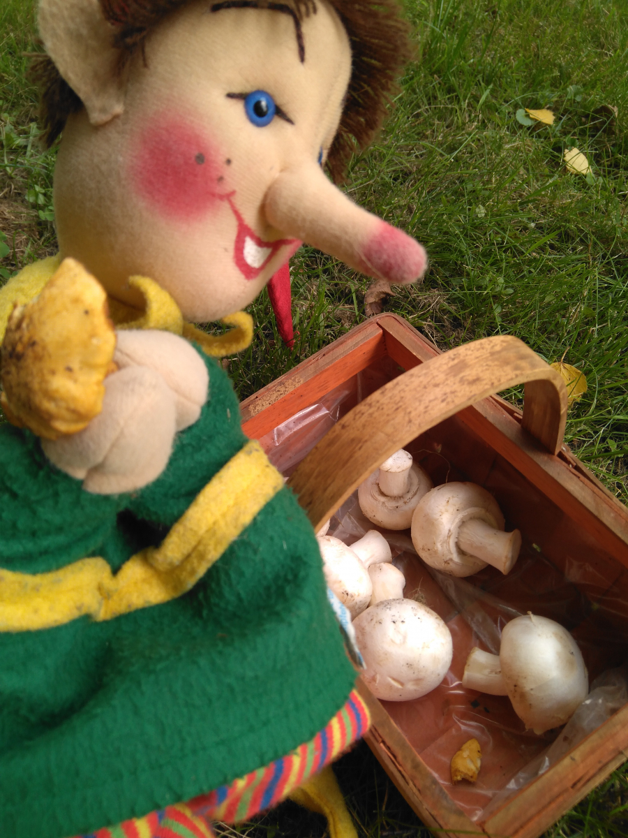 Zum Schluss gibt es noch ein Kasperletheater im Wald. Heute hat sich der Kasper über Pfifferlinge (er hält einen in der Hand!!) gefreut, normalerweise kaufe ich immer Champignons, damit ich Pilze für den Kasper habe, die Champignons hätte ich aber gar nicht gebraucht, es gibt ja gerade Pilze ![]()