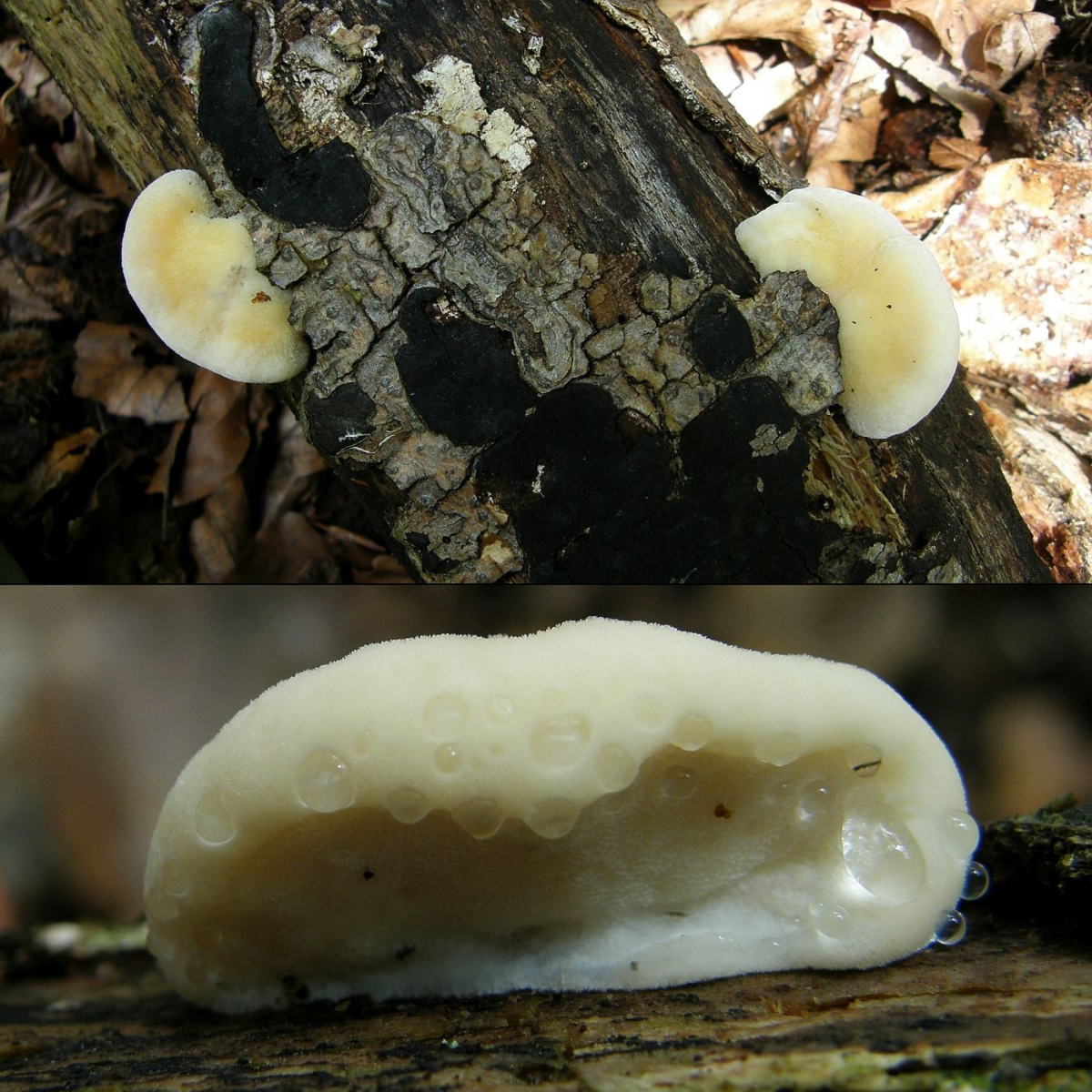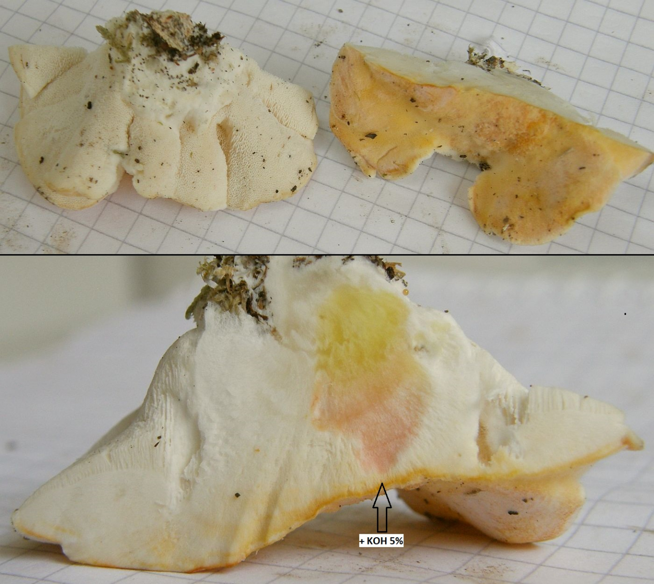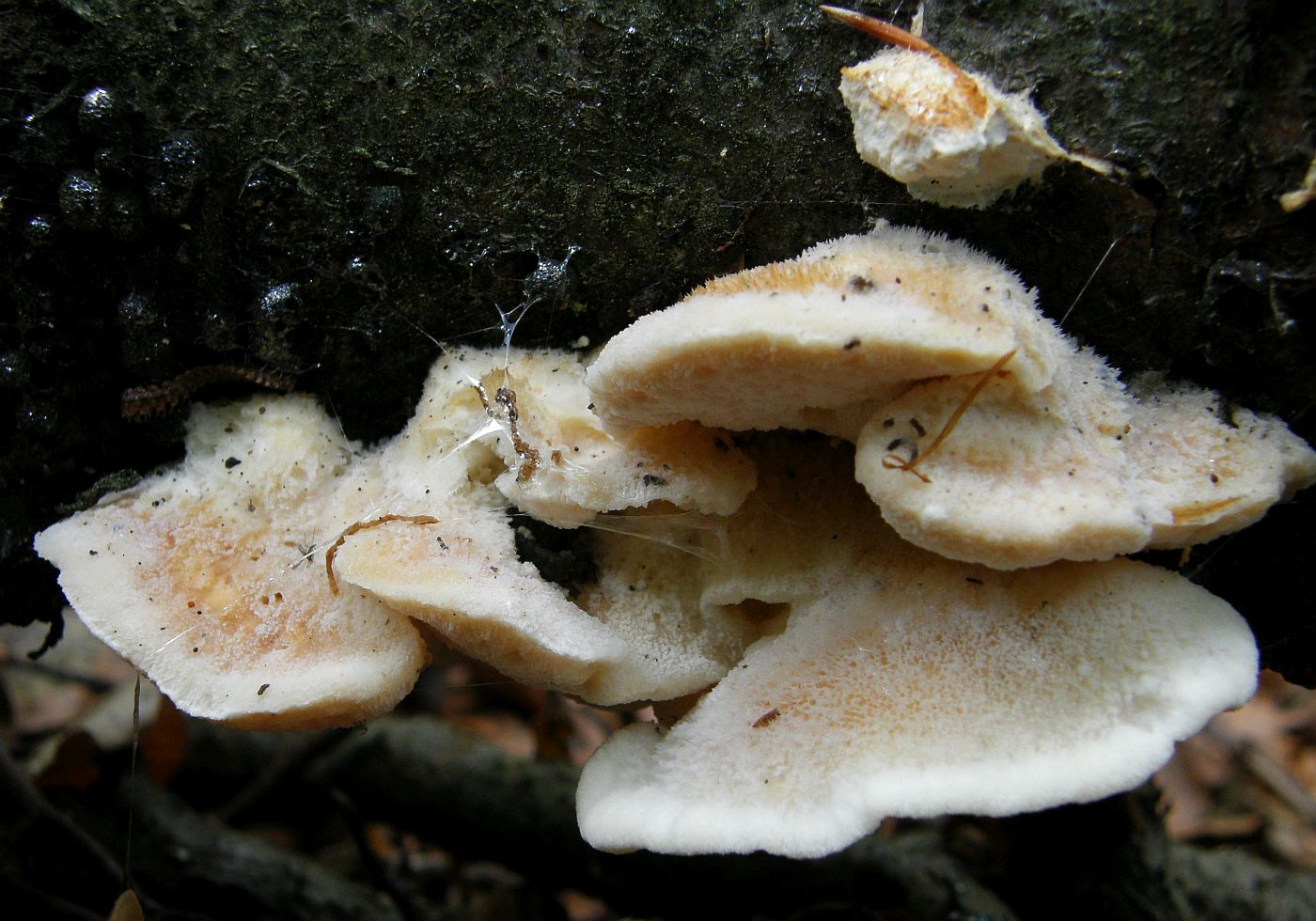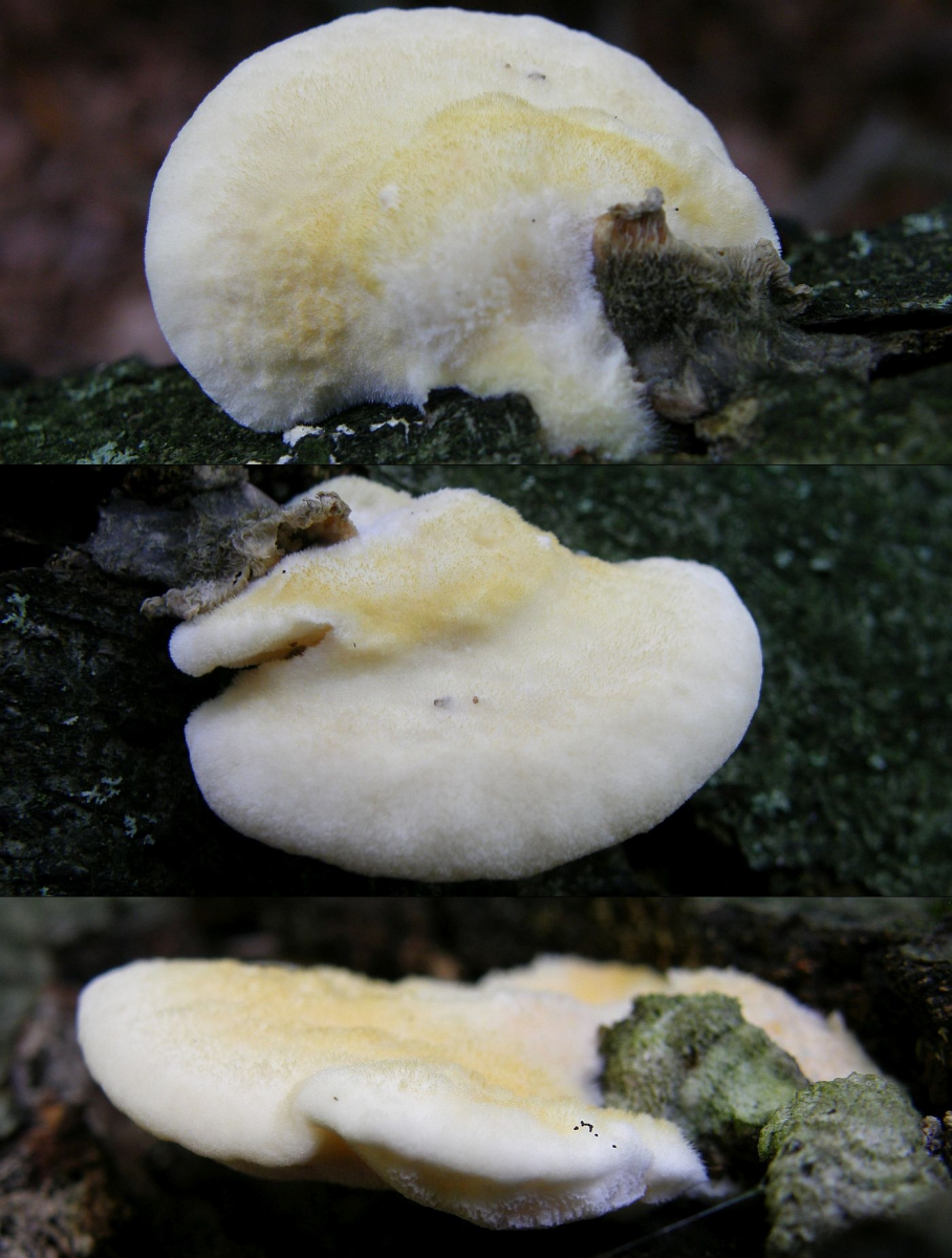 eine Frage zu diesem Porling. Blass ockerorangeweißlich, Oberseite zottig und sehr weich und saftig. Ich hätte zunächst gesagt Climacocystis borealis, aber Mittelhessen ist zwar bergig, aber nicht gebirgig, und vor allem ist das Laubholz (Buche?), woran sie wachsen. Darf er anscheinend manchmal, aber mich macht das schon stutzig.