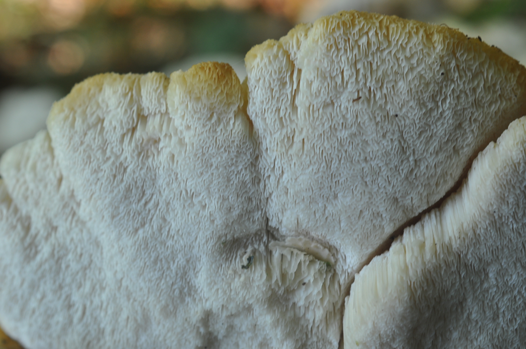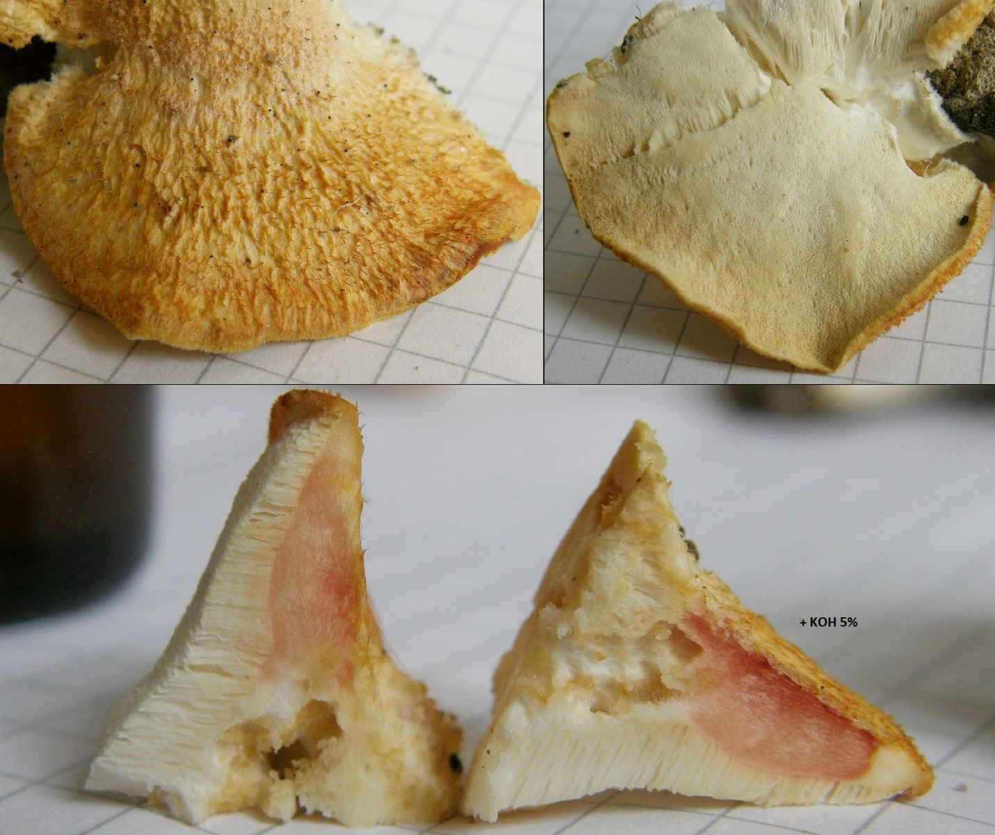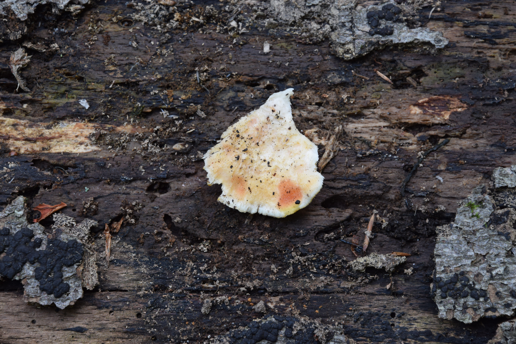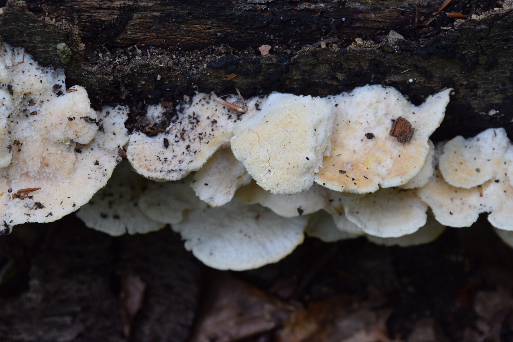 eine Frage zu diesem Porling. Blass ockerorangeweißlich, Oberseite zottig und sehr weich und saftig. Ich hätte zunächst gesagt Climacocystis borealis, aber Mittelhessen ist zwar bergig, aber nicht gebirgig, und vor allem ist das Laubholz (Buche?), woran sie wachsen. Darf er anscheinend manchmal, aber mich macht das schon stutzig.
