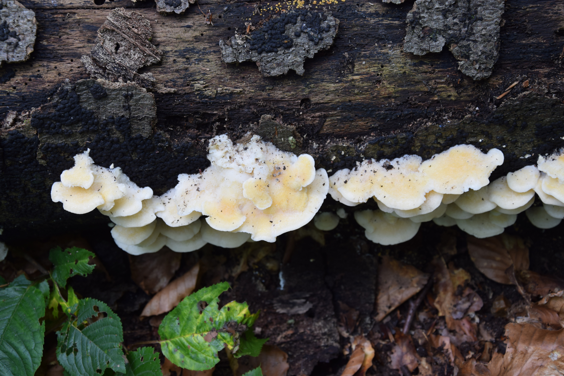 eine Frage zu diesem Porling. Blass ockerorangeweißlich, Oberseite zottig und sehr weich und saftig. Ich hätte zunächst gesagt Climacocystis borealis, aber Mittelhessen ist zwar bergig, aber nicht gebirgig, und vor allem ist das Laubholz (Buche?), woran sie wachsen. Darf er anscheinend manchmal, aber mich macht das schon stutzig.