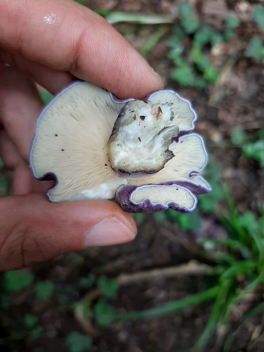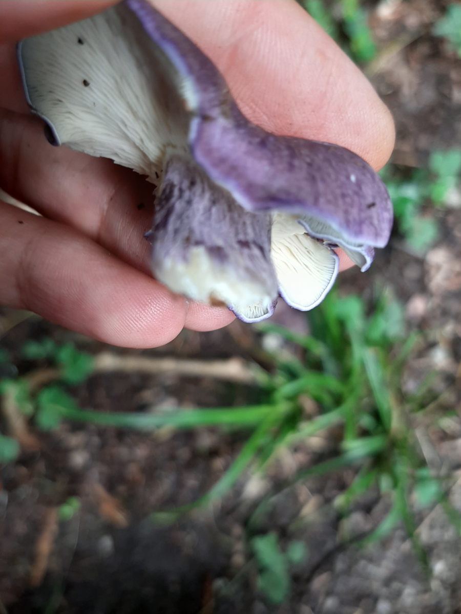 Habe noch einen zweiten Pilz mit lila Hut und Stiel, die Lamellen sind schmutzig weiß und ein sehr starker Mehlgeruch.