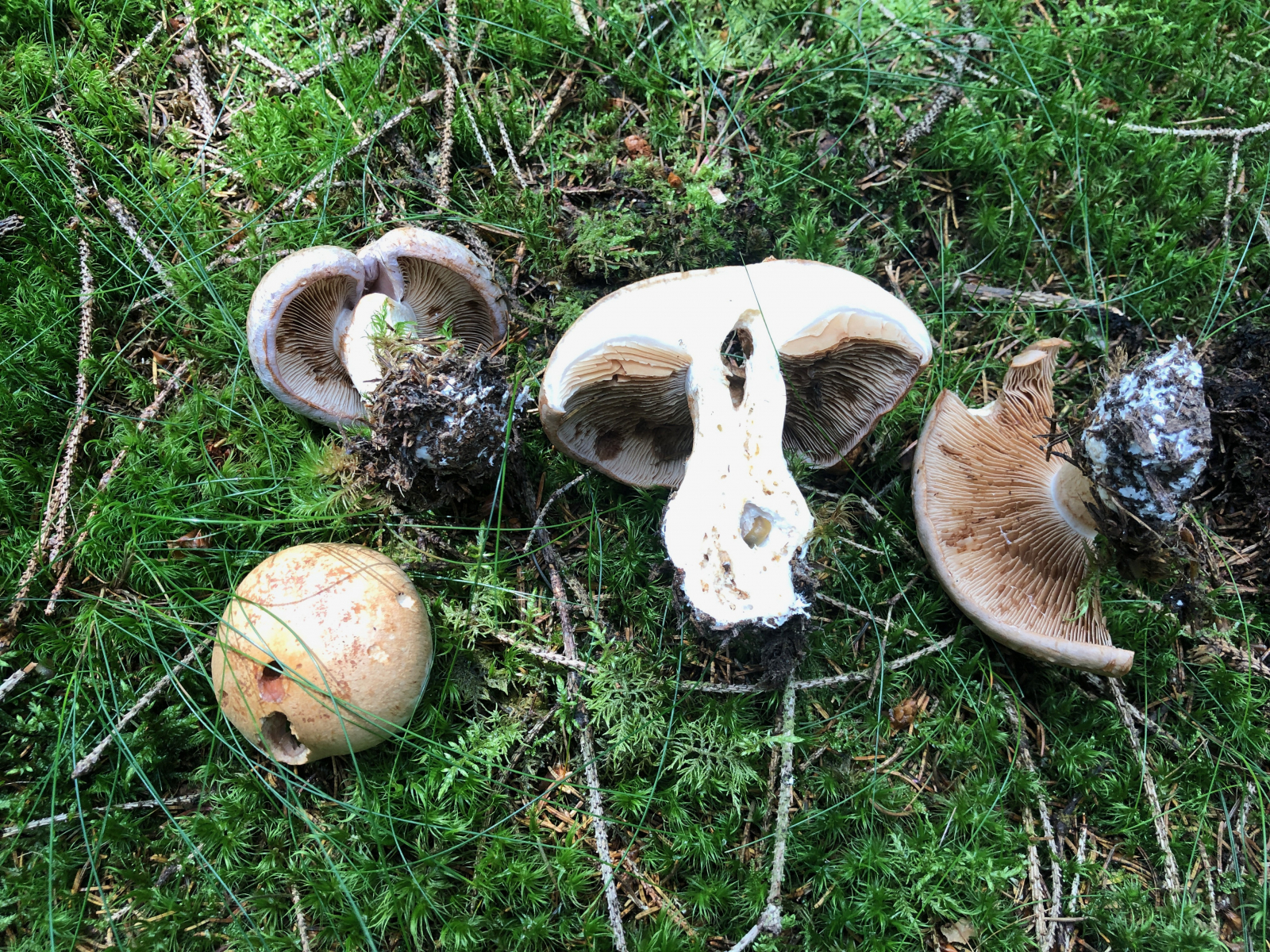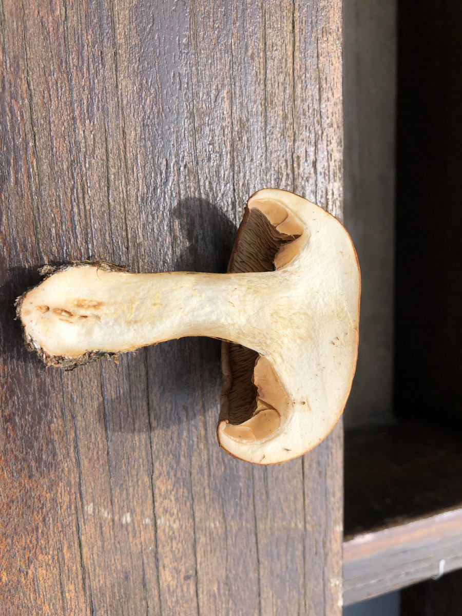 Lamellen hellbraun mit cremefarbener Schneide, leicht ausgebuchtet angewachsen, untermischt.