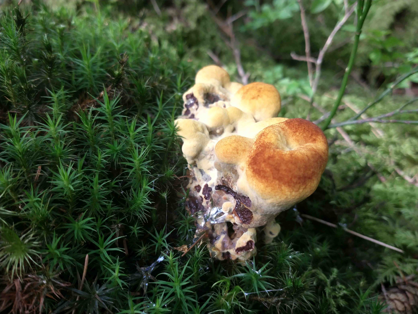 Pilz 3: Diesen Pilz halte ich für einen Schwarzblauenden Röhrling. Zuerst war er ganz gelb, aber schon bei den leichtesten Berührungen wurde er sofort blau, dann schwarz. Der Stiel ist etwas faserig.