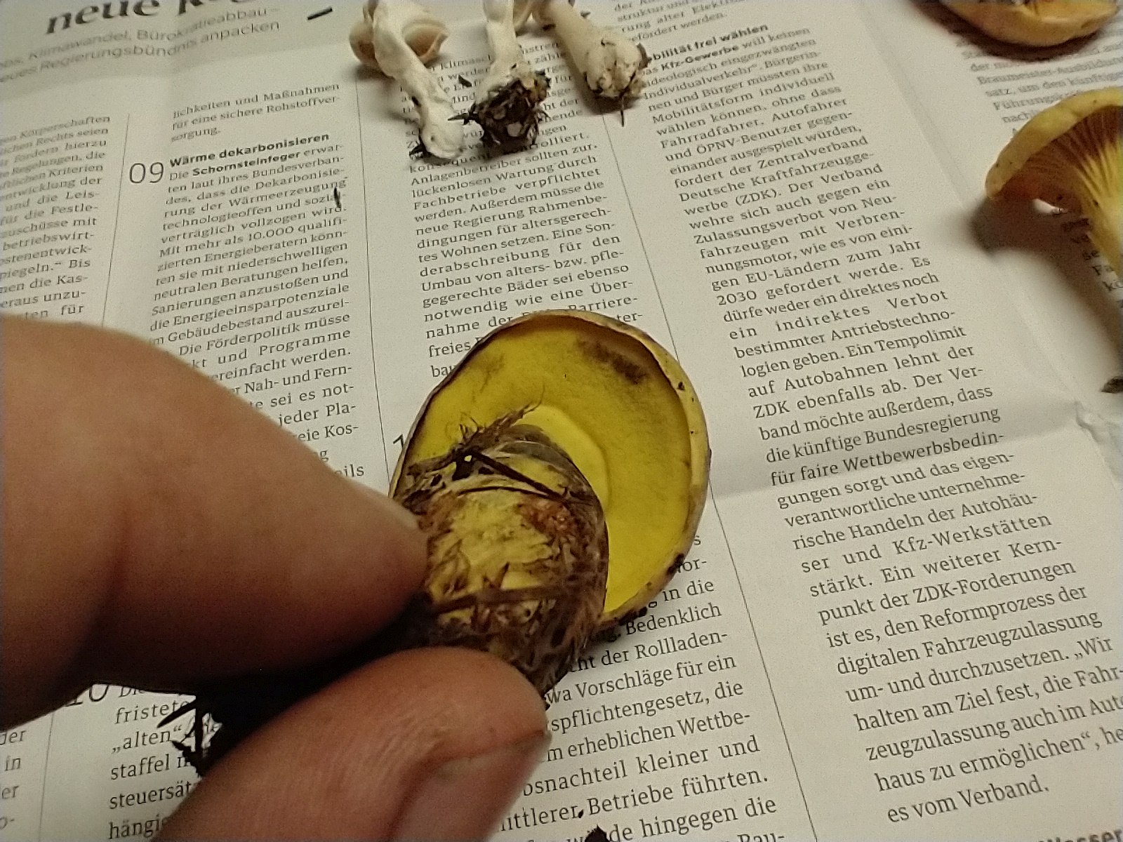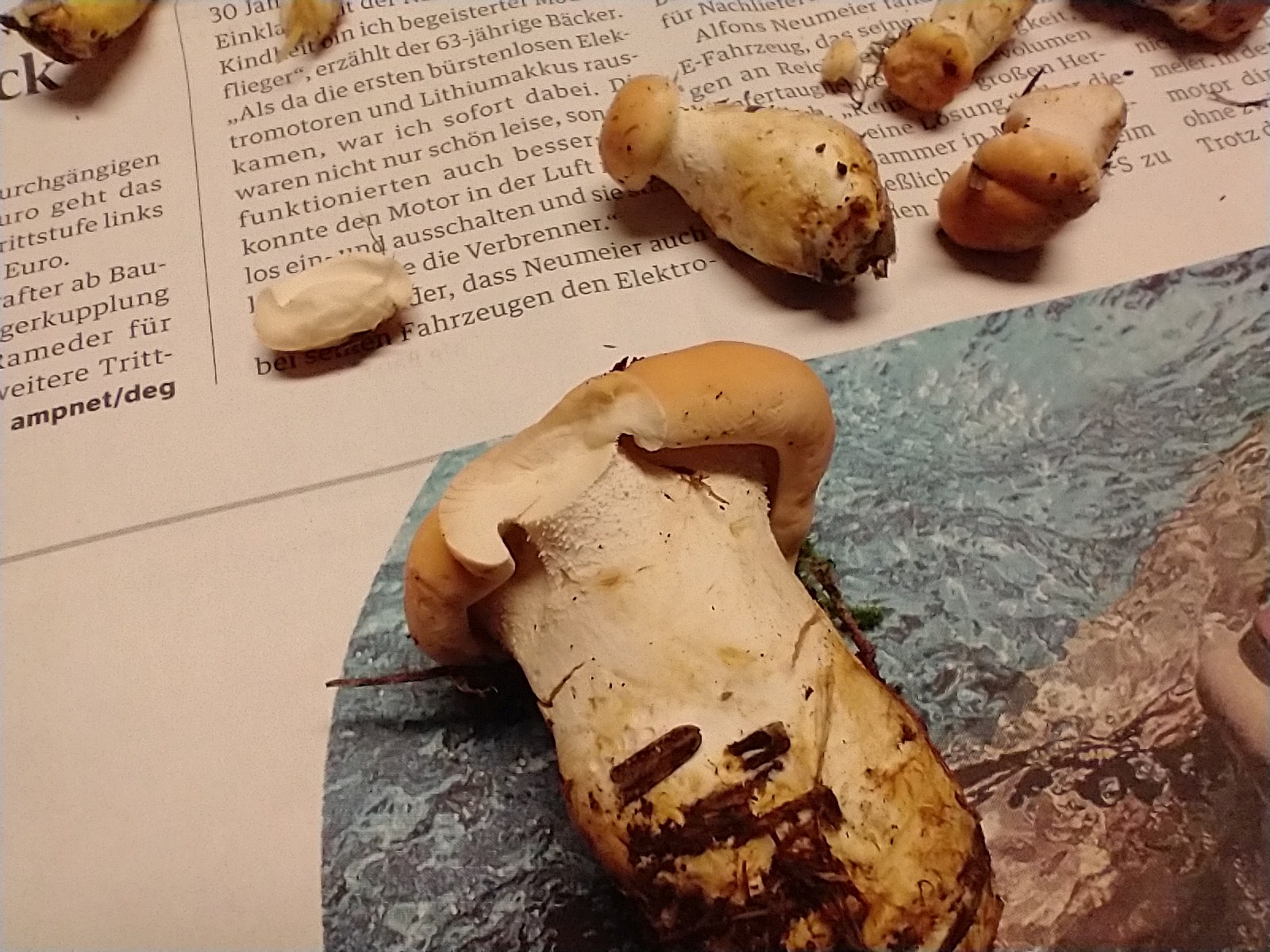 Pilz 6: Das halte ich für Semmelstoppelpilze. Ich denke die sind auch relativ sicher zu bestimmen. Einige Zeit nach dem aufschneiden war das Fleisch gelb-orange.