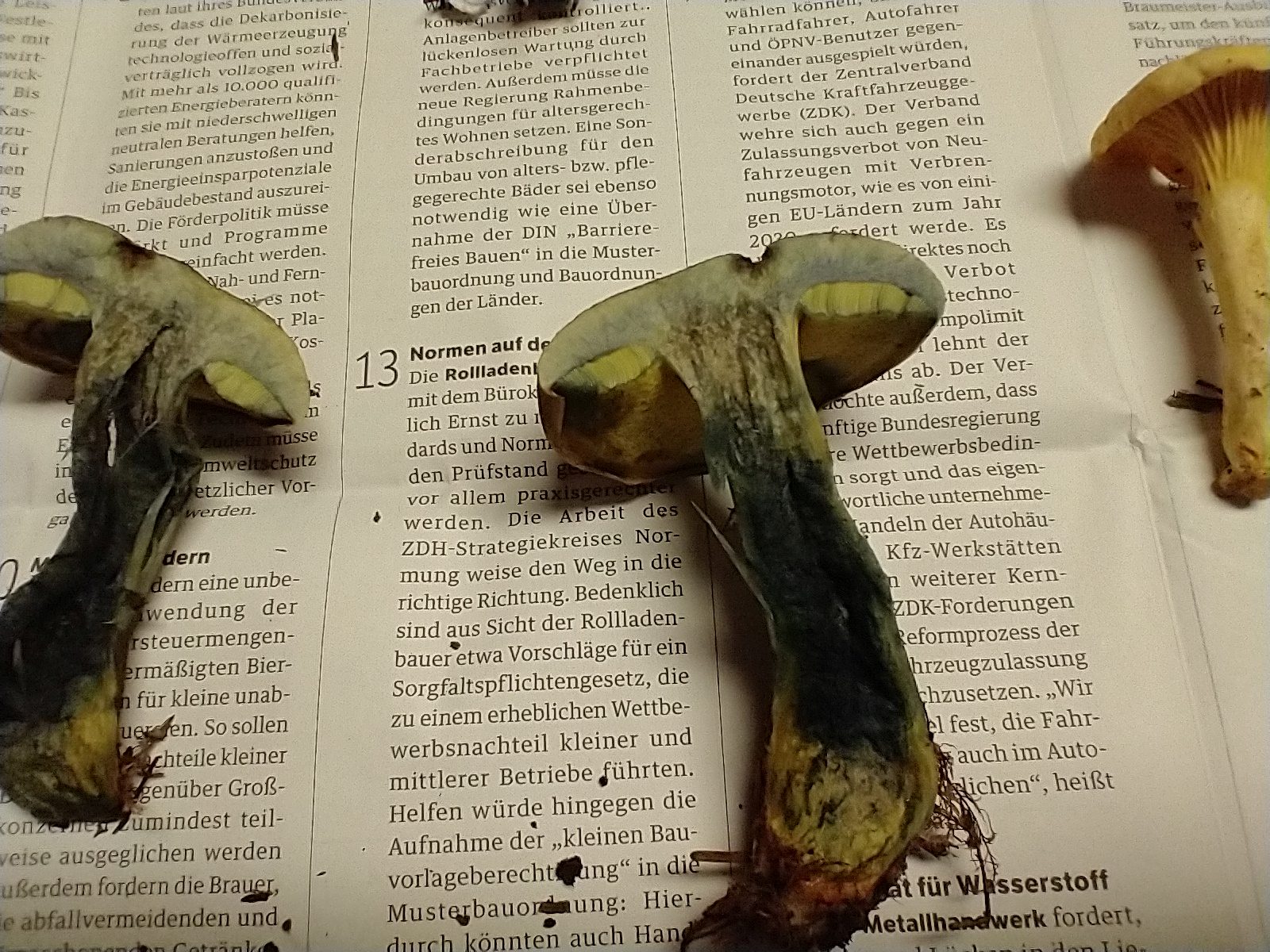 Pilz 3: Diesen Pilz halte ich für einen Schwarzblauenden Röhrling. Zuerst war er ganz gelb, aber schon bei den leichtesten Berührungen wurde er sofort blau, dann schwarz. Der Stiel ist etwas faserig.