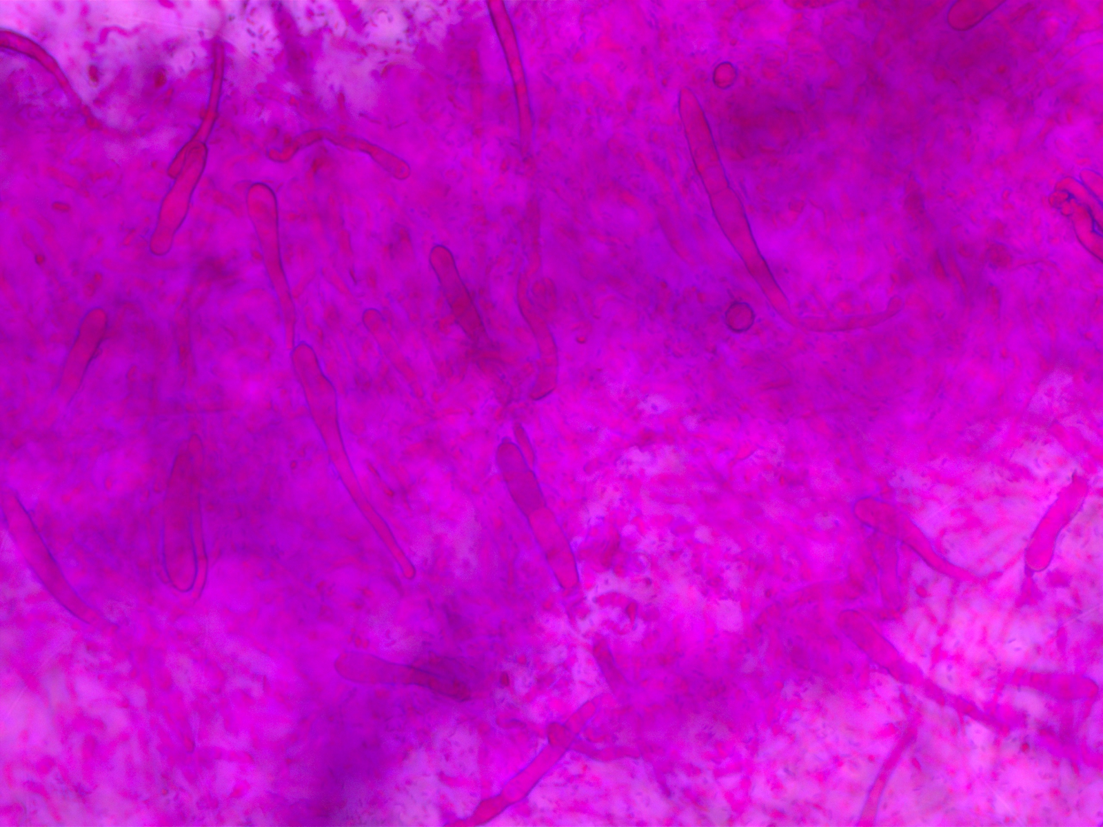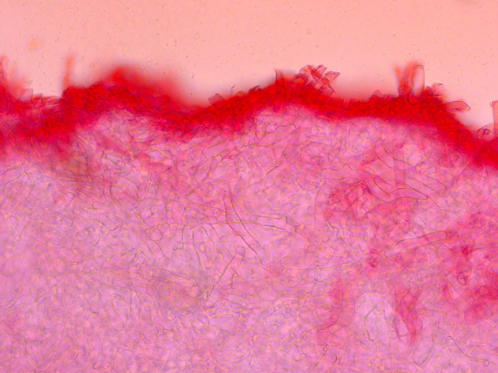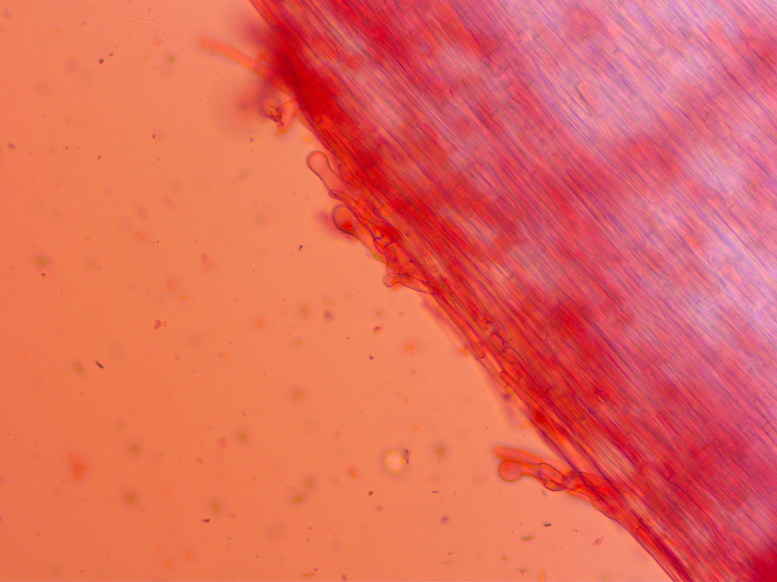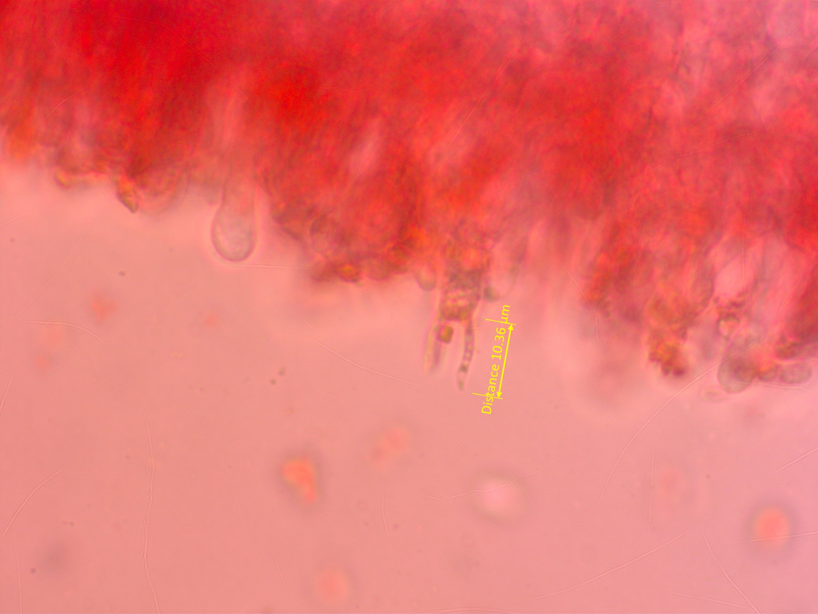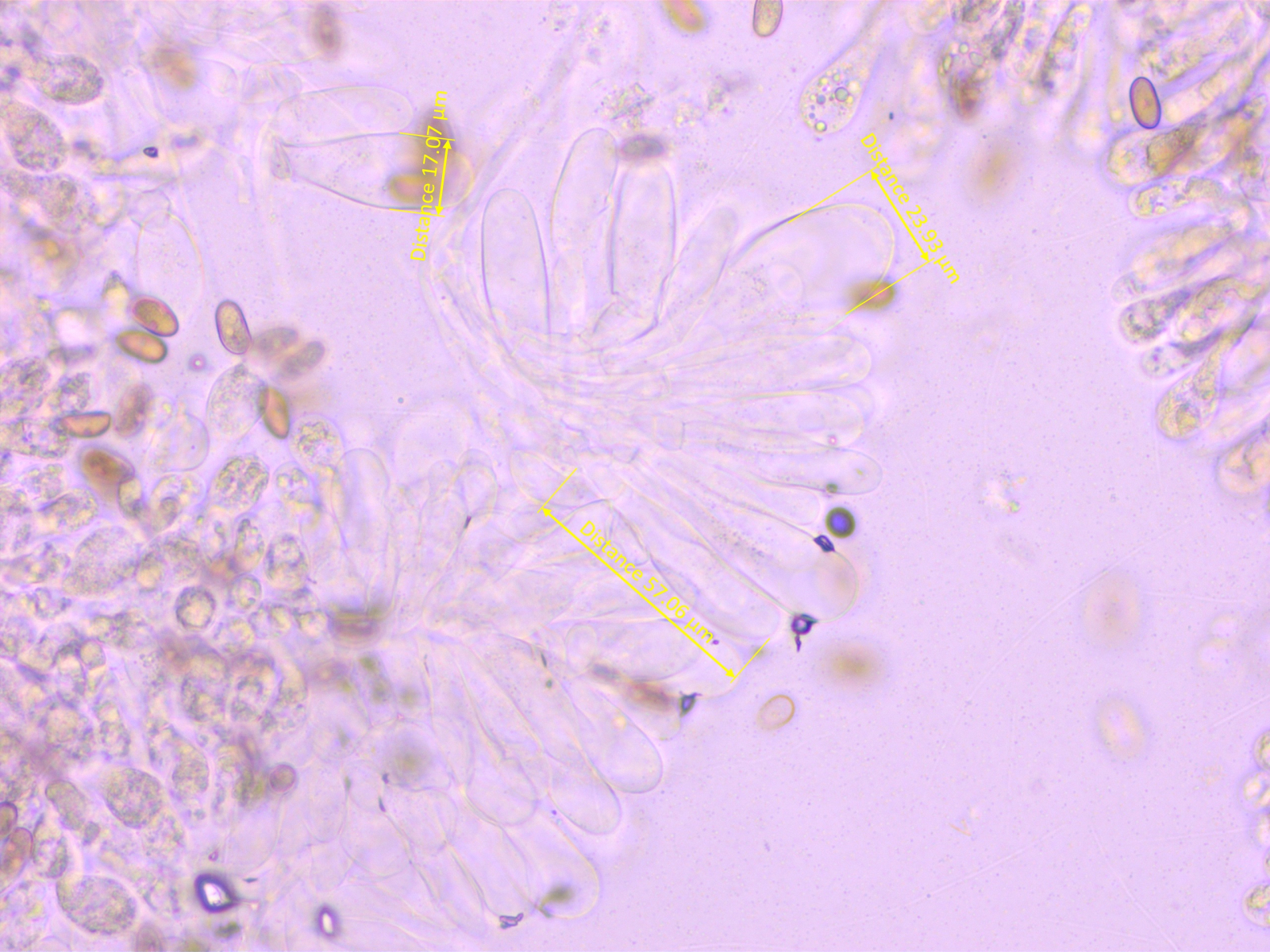 Basidien mit auffallend langen Sterigmen. Kleine, keulige Marginalzellen sind auch vorhanden (oder sind es doch Basidiolen?)