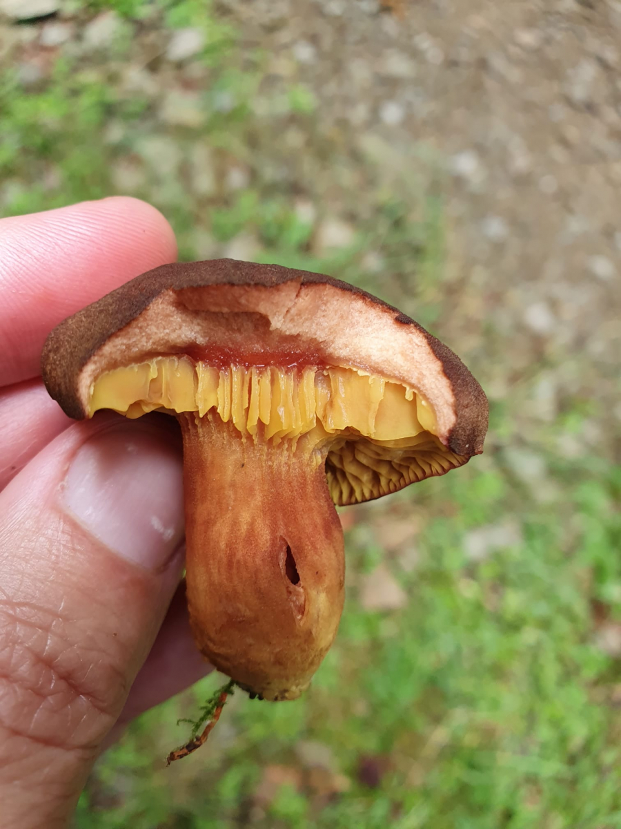 Ich bin heute auf einer Wanderung in Südfrankreich buchstäblich über ein paar Pilze gestolpert, die ich in meinen Büchern nicht finden kann. Das mag natürlich auch mal an einer veränderten Farbe liegen (regional oder altersbedingt....), aber bei den Lamellenpilzen finde ich nicht mal etwas ähnliches. Auf den Handyfotos sind die Farben weniger knallig als in Wirklichkeit, vor allem das Gelb der Lamellen war fast schreiend, der Hut dagegen wirklich zartbitterschokoladenfarben.