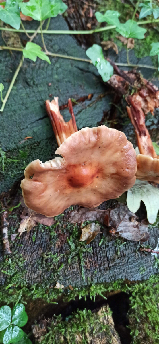 Rotstieliger Rübling? Wirkt aber größer und Lamellen passen farblich nicht... Der Buckel passt auch nicht. Eiche und Buche standen da rum. LG Wastl