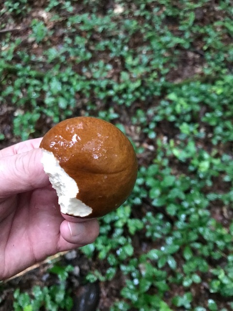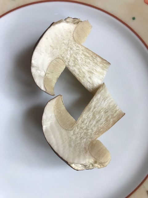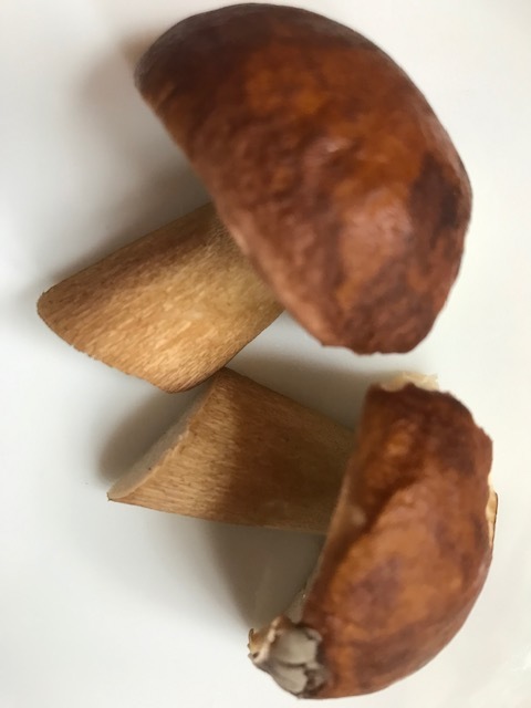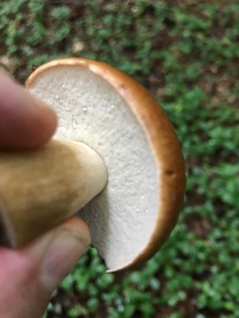 Ich habe heute versucht Pilze zu finden und wurde heftig vom Regen erwischt. Auf meiner Flucht in die Hütte bin ich dann doch noch auf einen Pilz gestossen, von dem ich denke, dass es ein Maronenröhrling ist. In jedem Fall sollte es ein essbarer Pilz sein. Er sieht lecker aus (ist kein Kriterieum, ich weiß). Sein Stamm war schon durch und durch von Schnecken durchfressen. Seine Hutfarbe ist ein prächtiges sattes Braun. Seine Hautunterseite ist weiss und bildet keine Farbe aus, wenn man sie drückt.