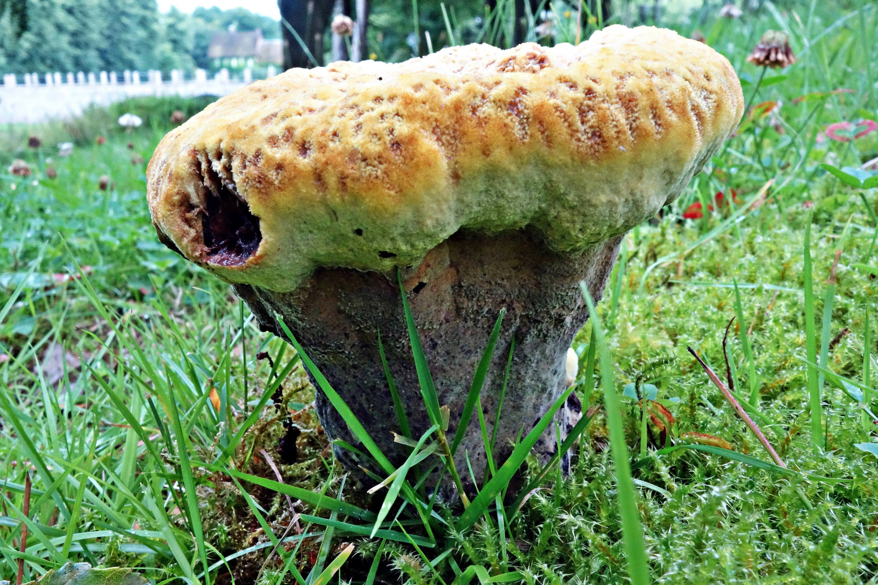 Habe heute im Ahrensburger Schloßpark zwischen B75 und Schloßteich bei meiner Rundfahrt mit dem Fahrrad diesen Pilz gefunden. Er stand allein auf einer Rasenwiese, die nächsten Laubbäume Buche, Linde und Erle über 10 Meter entfernt, der nächste Nadelbaum fast 40 Meter weit daneben. Geruch und Geschmack angenehm, Fleisch dunkel rotbraun einfärbend. Erinnert hat er mich an den Kiefern Braunporling. Vielleicht kann ja jemand weiterhelfen.