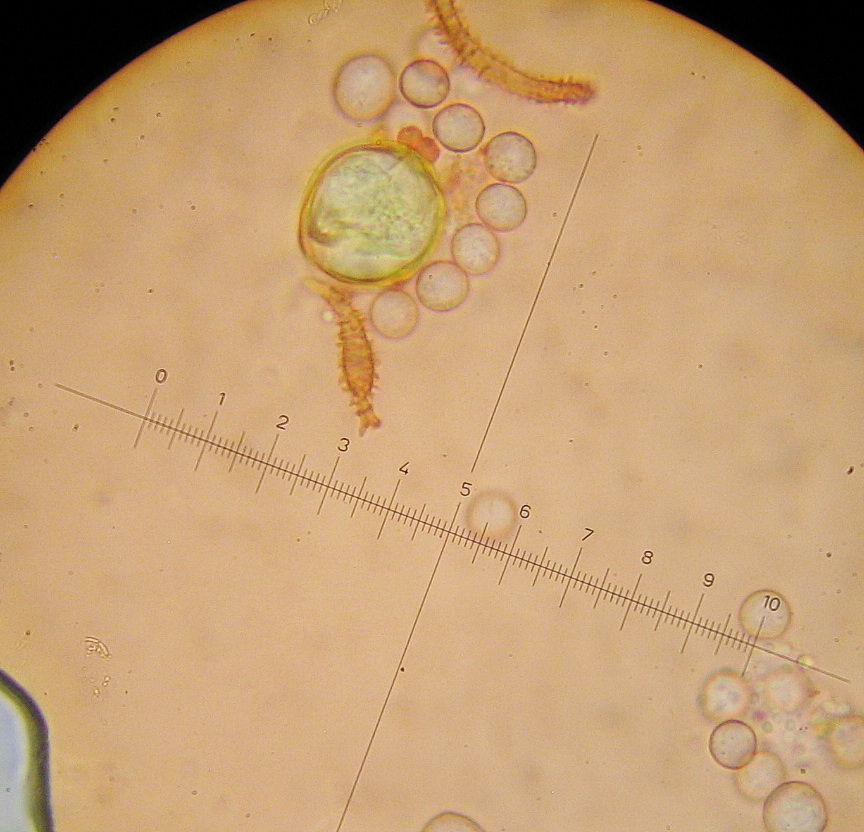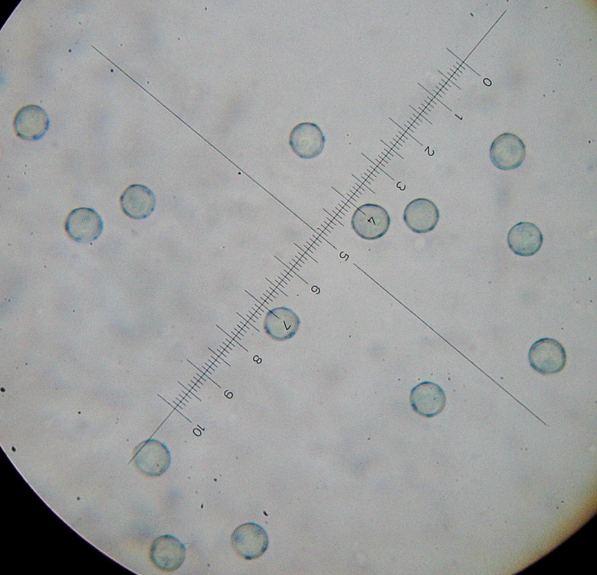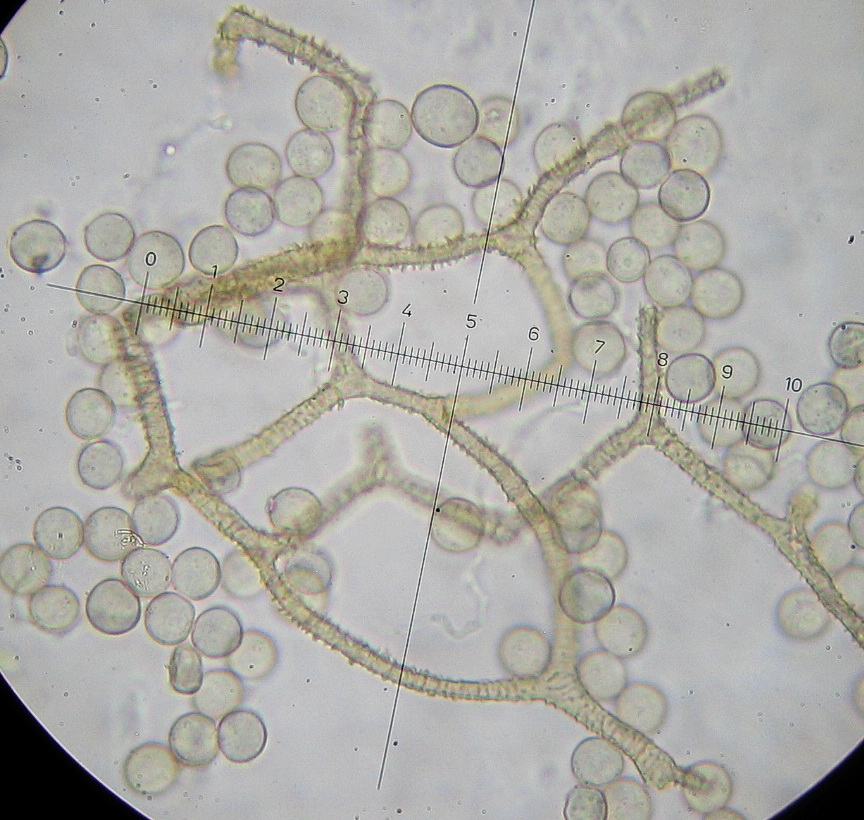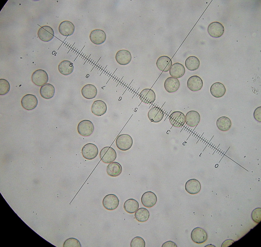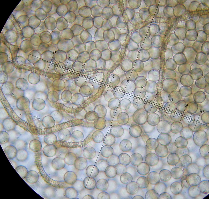 Die Sporen sind nicht ganz rund,hyalin, um 8µ, ( hat auch größere Ausreiser-Sporen), und hat lückigauftretende, einzelne Wärzchen ( zumindest nicht gaz glatt).