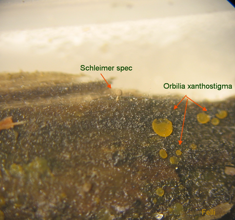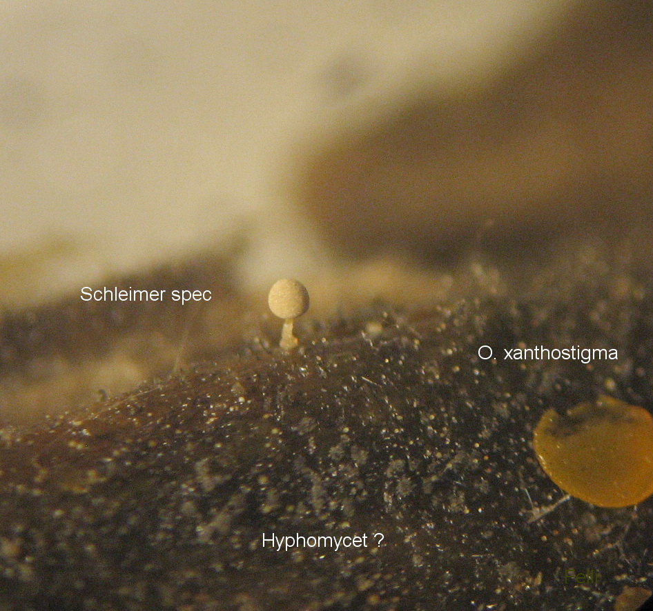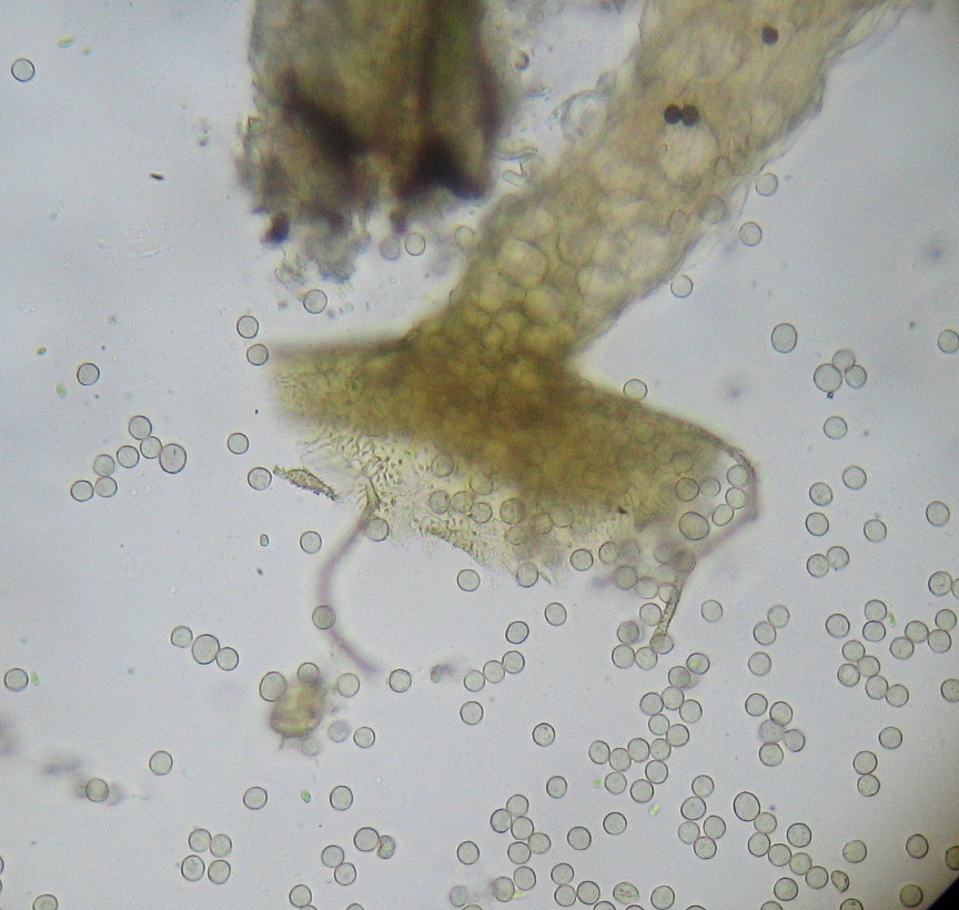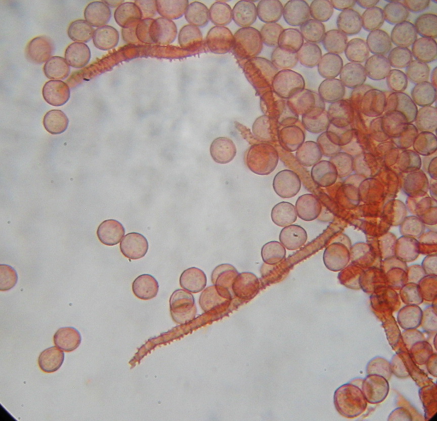 Die Sporen sind nicht ganz rund,hyalin, um 8µ, ( hat auch größere Ausreiser-Sporen), und hat lückigauftretende, einzelne Wärzchen ( zumindest nicht gaz glatt).