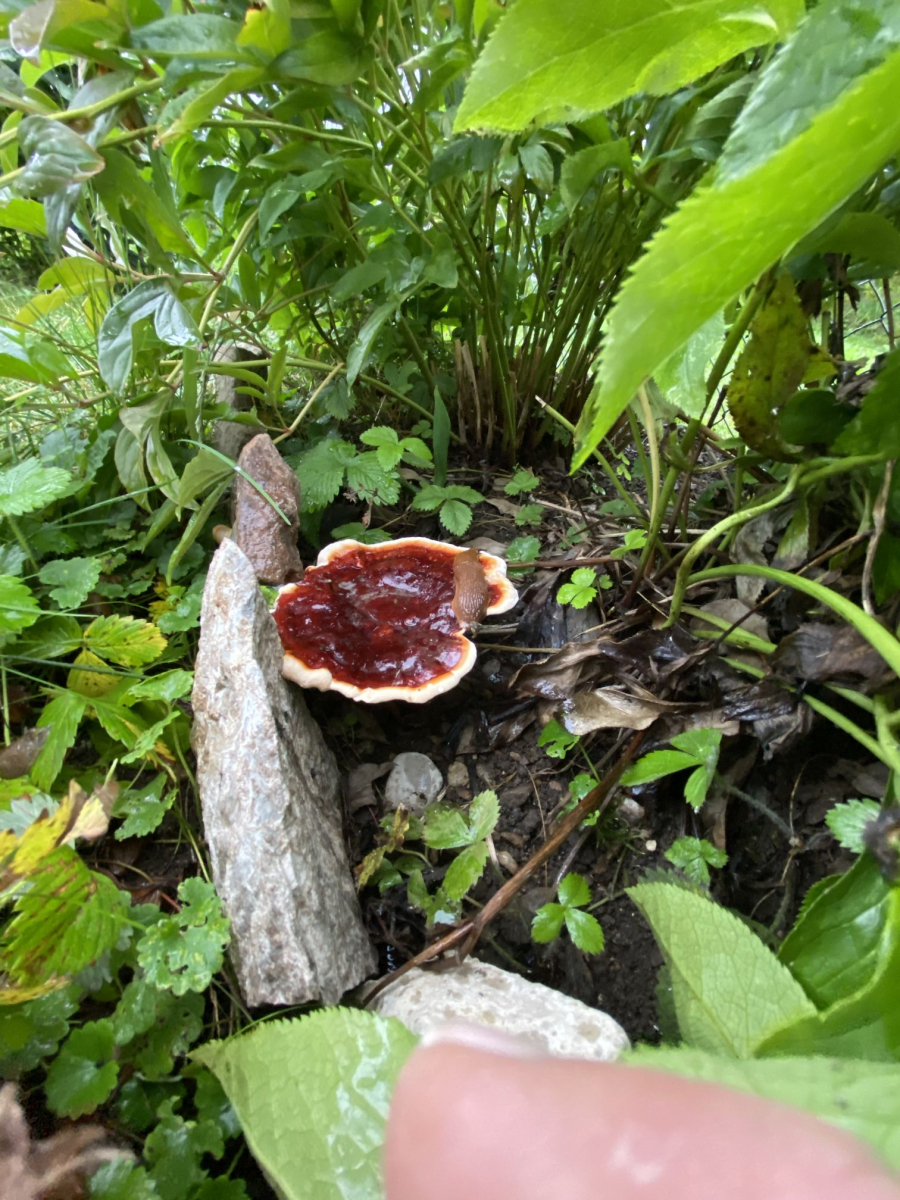 Vergleiche deinen Pilz mal mit dem glänzenden Lackporling (Ganoderma Lucidium). Zumindest Form, Farbe und Stiel erinnern daran. Die zähe Flüssigkeit in der Mitte? Keine Ahnung, vielleicht die Folge von viel Feuchtigkeit? Als harzig ist er jedenfalls beschrieben.