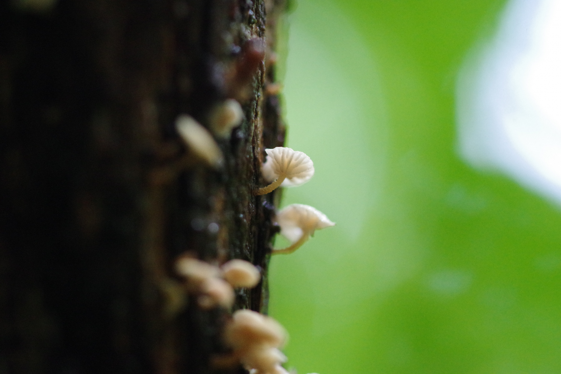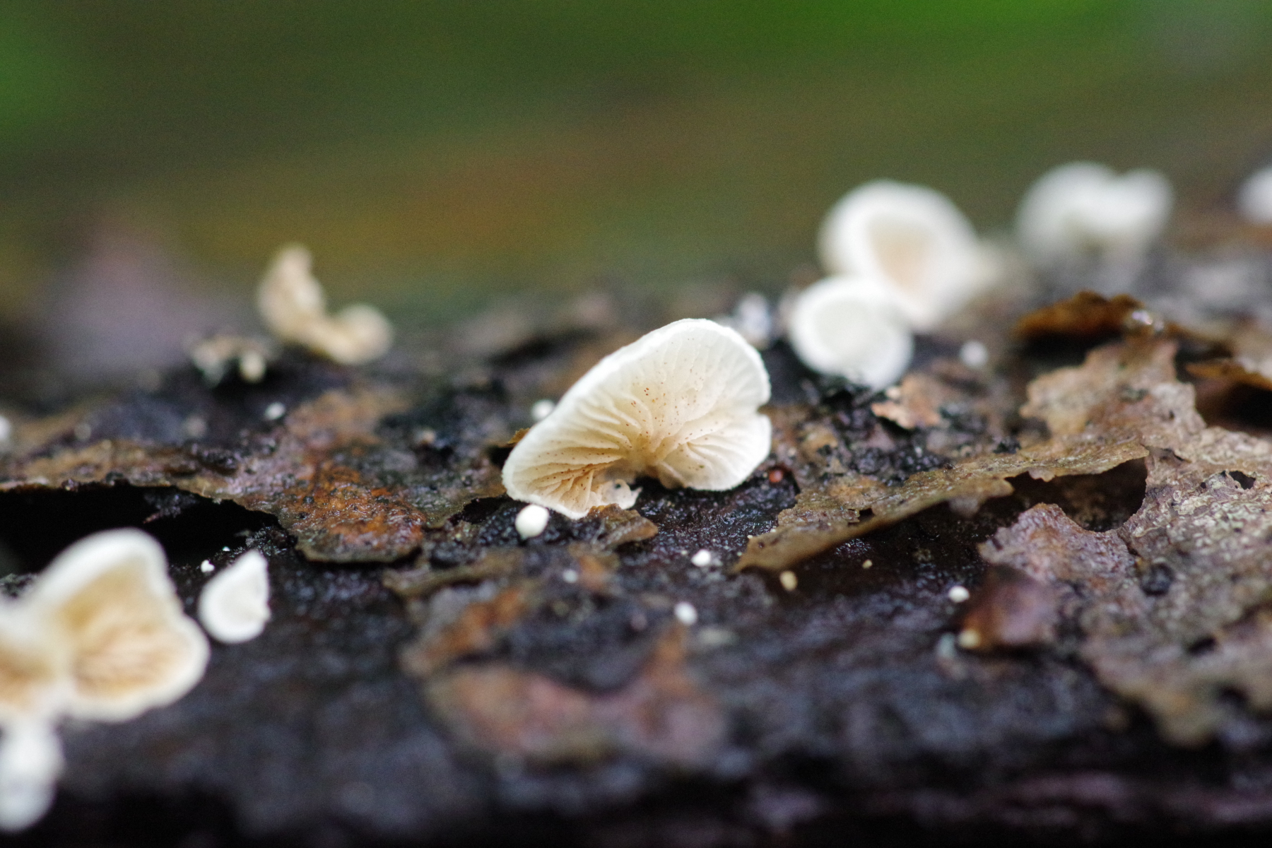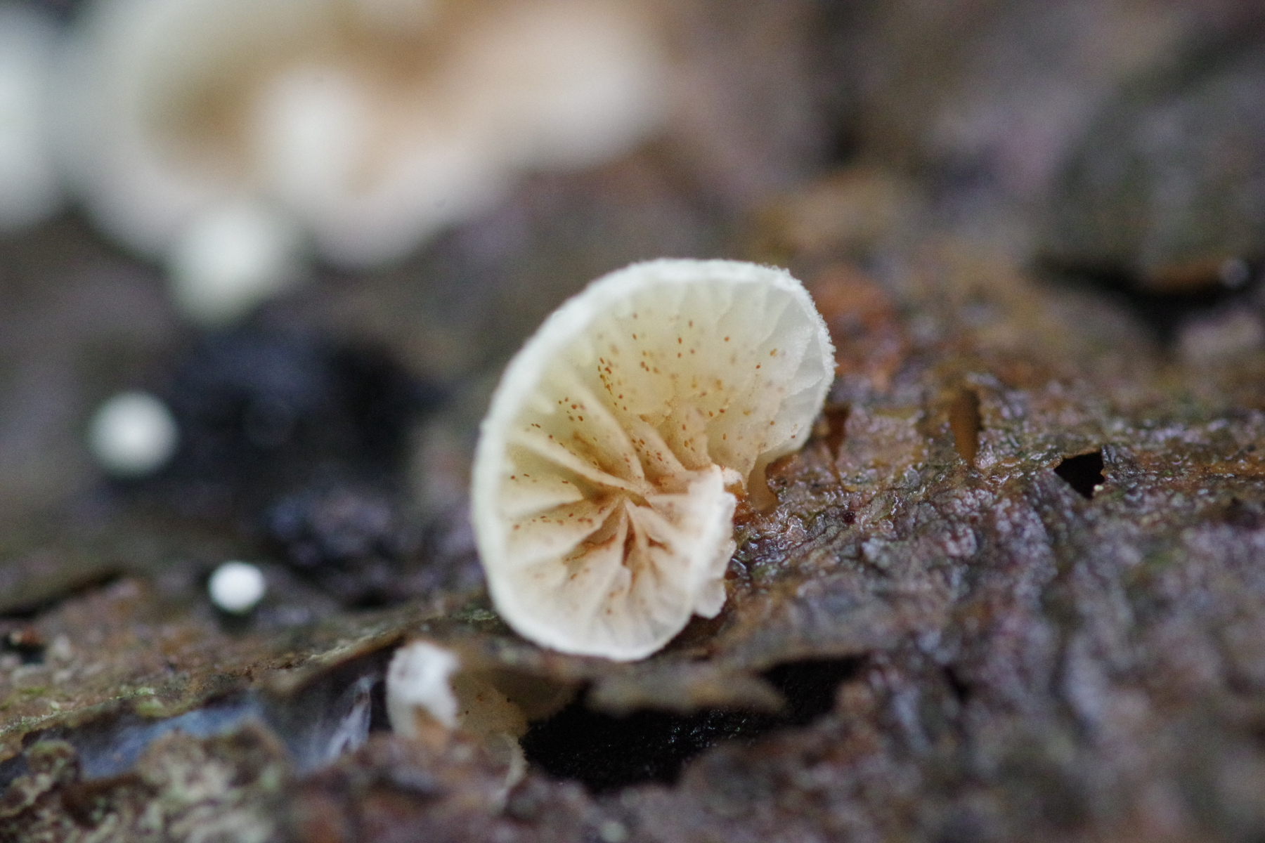 1) vermutlich Crepidotus sp. an toter Salweide, auffällig finde ich die roten Flecken an den Lamellen, die selbst wenn die tierischen Ursprungssein sollten, vielleicht artspezifisch sind. Oben auch nur weiß, die sind leider überbelichtet und auf den Bildern wäre nix zu sehen. Bis maximal 10 mm breit.