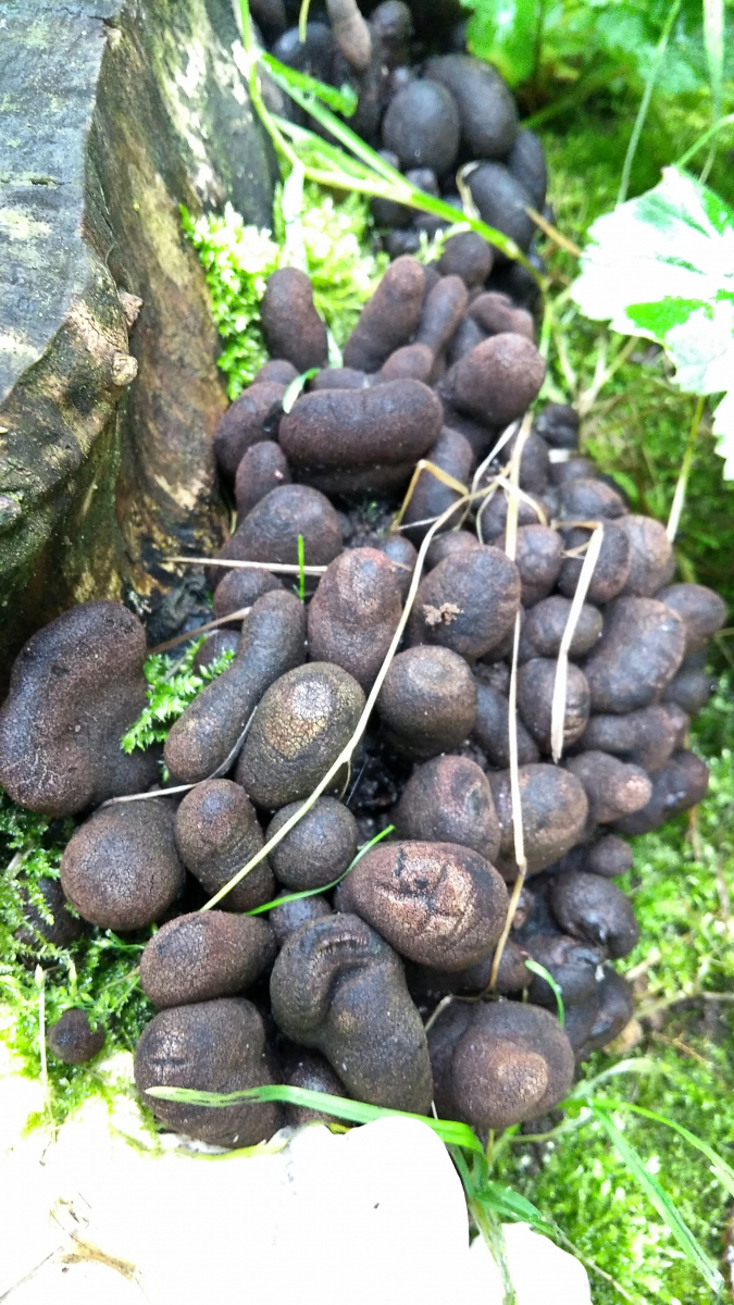 Ich habe heute an einem Laubbaumstumpf Fruchtkörper gefunden, die ich gerne Vielgestaltige Holzkeule (Xylaria polymorpha) nennen würde. Sie wuchsen am gleichen Stumpf zusammen mit einigen handtellergrossen Trameten. Weil ich die bislang noch nicht fand, möchte ich mich hier versichern, ob ich richtig liege. Die genaue Holzart kann ich leider nicht bestimmen, Laubholz erscheint mir aber aufgrund der Rinde sicher.