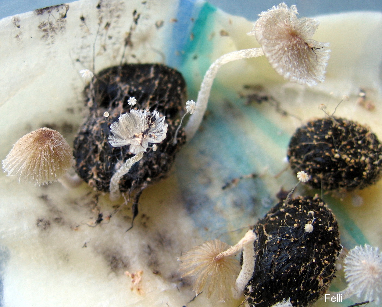 kaum ist die Massenblüte von C. pusillulus vorbei, wachsen schon etwas größere (20mm hoch Hut 5-7mm) Tintlinge nach.