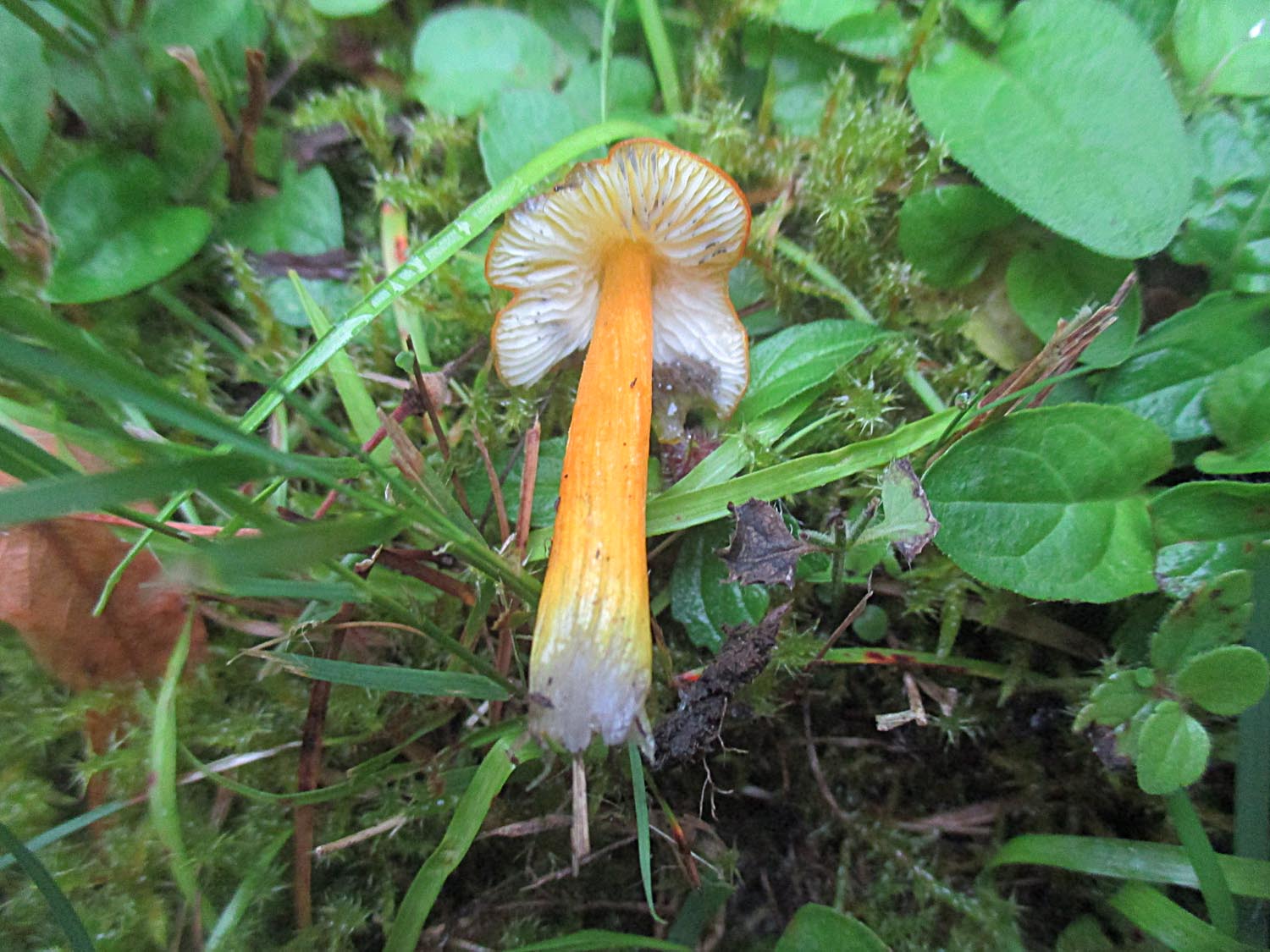 Welchen Namen ich diesem Saftling geben soll weiß ich nicht. Er war ca. 3,5 cm hoch und schwärzt nur ganz leicht an den Lamellen. Das zweite Bild ist nach fünf Minuten aufgenommen worden.