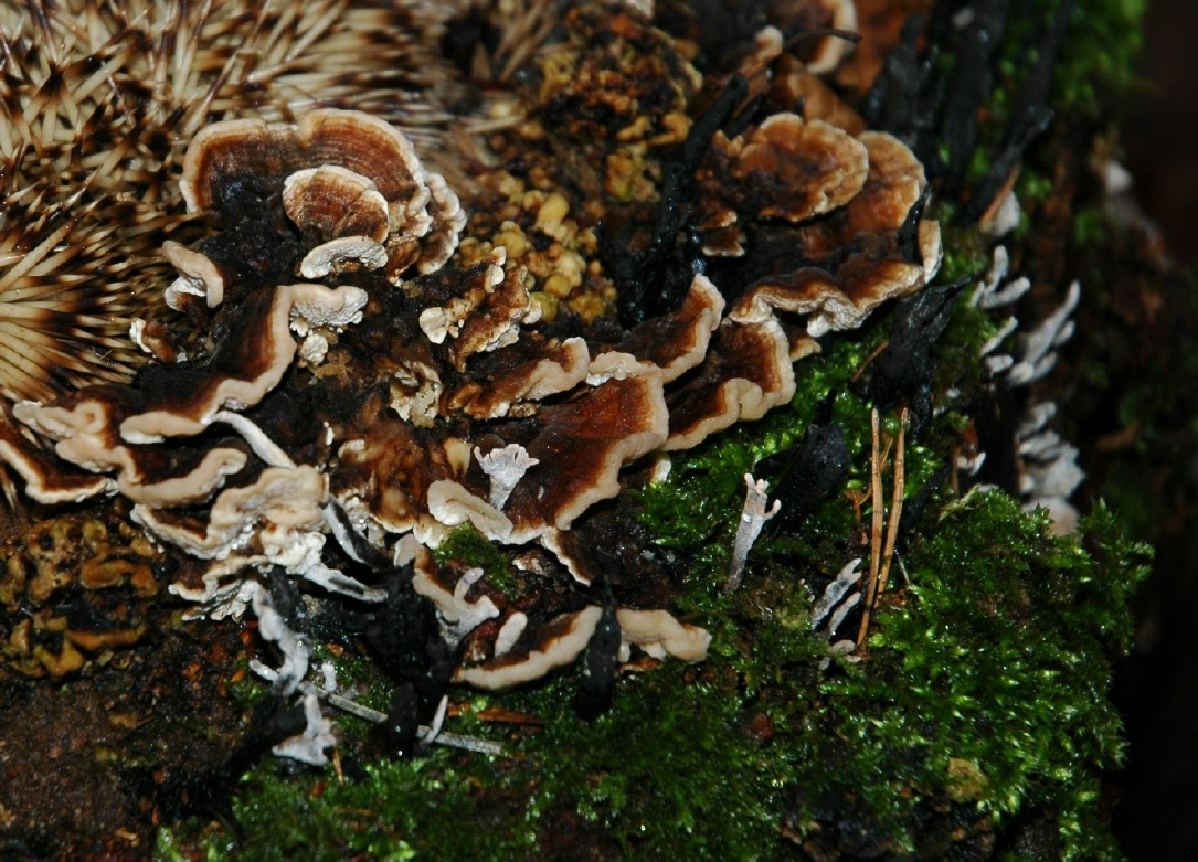 • Bist Du Dir sicher, daß die Fruchtkörper wirklich aus der Haut des Igels wachsen? Ich glaube auf den Fotos ein Rindenstück zu erkennen, aus dem sie wachsen, und das den Stacheln aufliegt.