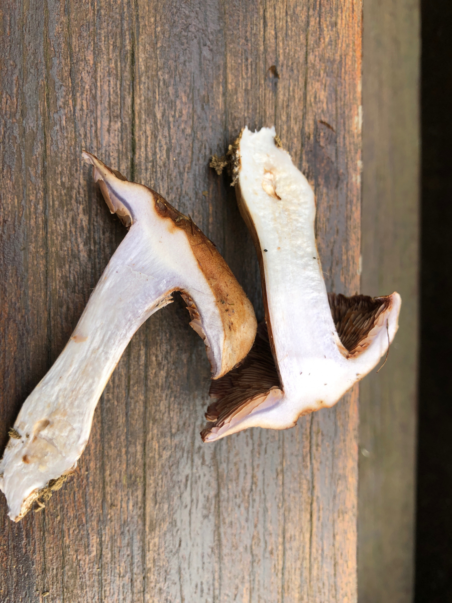Fruchtfleisch weiß mit violetten Tönen besonders oberhalb der Lamellen und an der Stielspitze