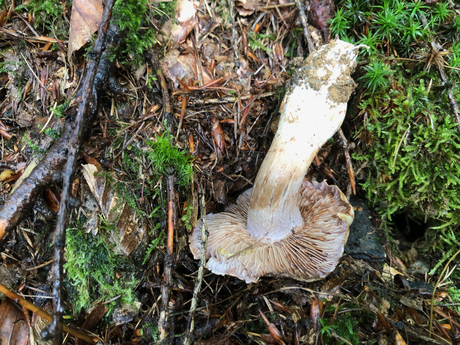 ein einsamer Cortinarius begegnete mir vorgestern im Mischwald. Als mögliche Baumpartner kommen Buche und Fichte eventuell noch Birke infrage. Nach der jüngsten Diskussion um die Phlegmacien denke ich, dass dieser auch zu der Gruppe gehört. Am nächsten kommt dem Pilz m. E. Cortinarius variicolor