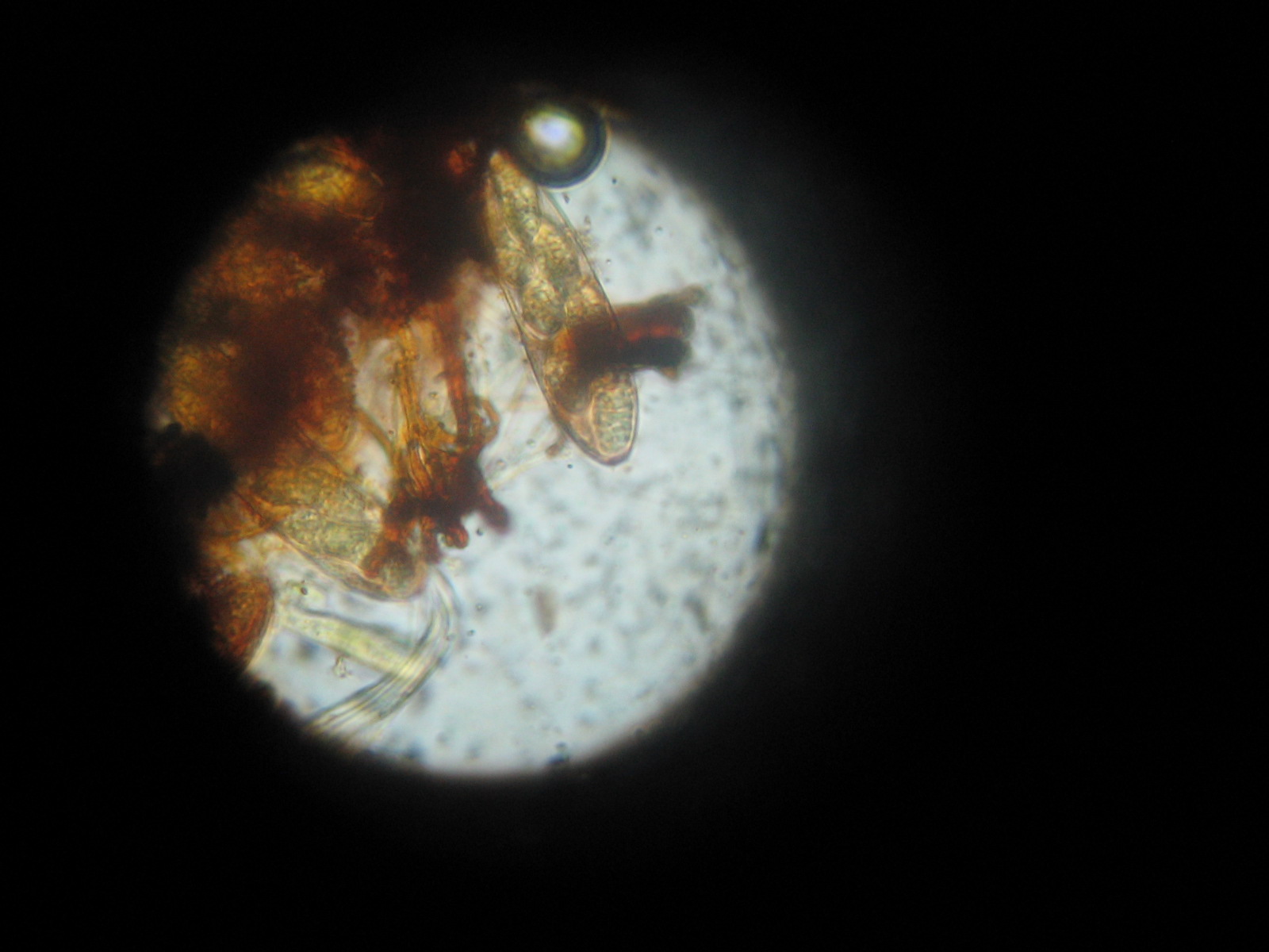 Die Fruchtköper sind unter 1 mm groß, gelblich weiß und leicht gestielt. Die Sporen sind etwas ungewöhnlich (finde ich jedenfalls) ornamentiert,unregelmäßig oval und leicht gebogen. Sie messen 25,50 x 9,16 / 25,02 x 9,04 / 24,6 x 8,91 / 24,6 x 10,08 µm. Die Asci sind 8-sporig und die Paraphysen leicht kopfig. Jodreaktion ist positiv, (Ascusspitze rötlich), aber nur am Rand des Präparates.