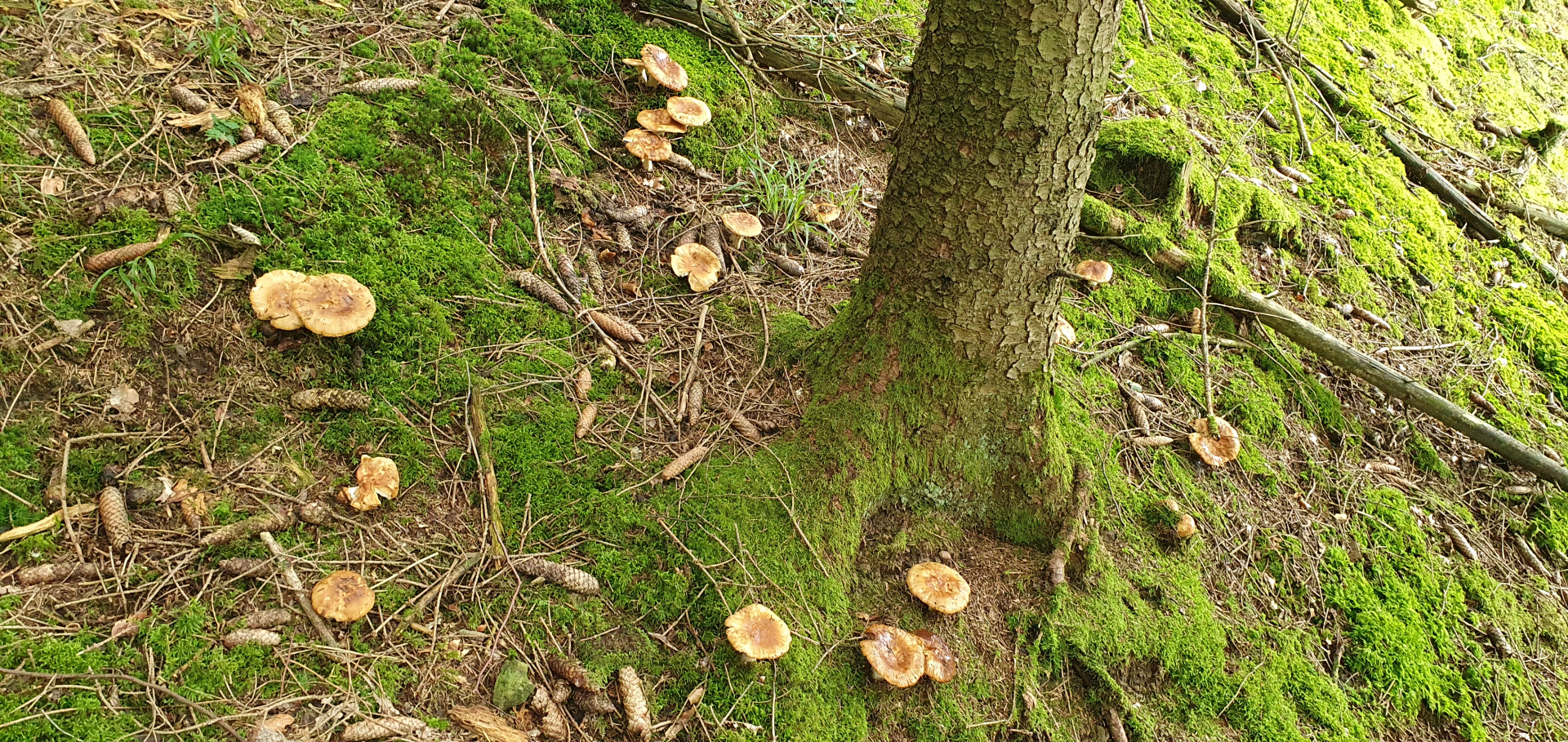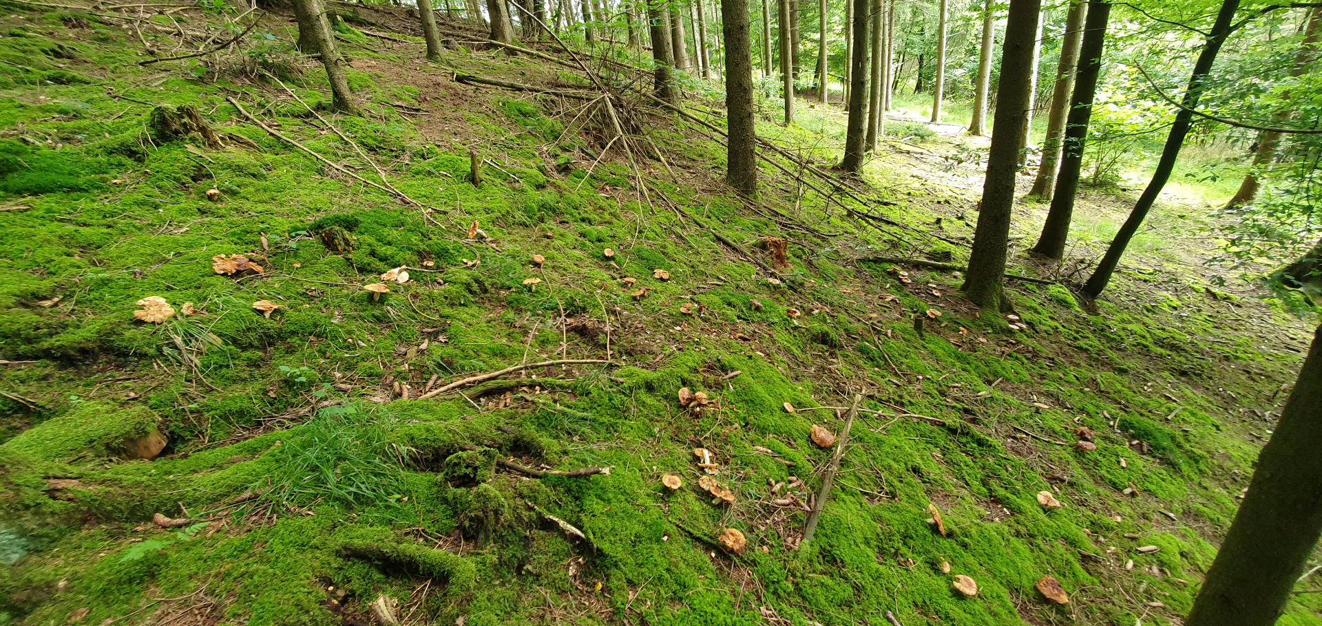 Zum Abschluss noch ein paar Winzlinge, die aber vermutlich mal größer werden wollen, an einer Stelle viele kleine Büschel mit winzigen Köpfchen von Cantharellus tubaeformis: