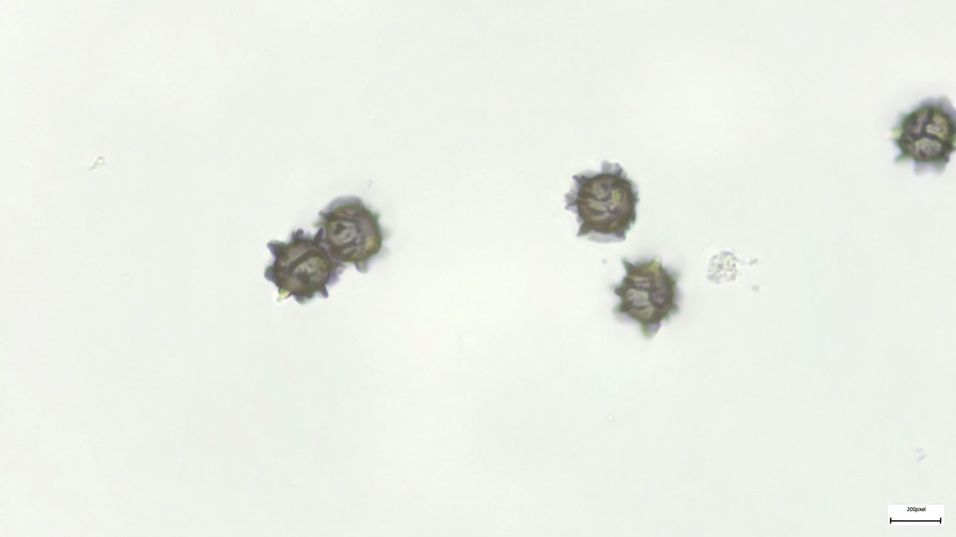Sporen spindelig, 24x11µm mit den typischen drei Ölkernen: