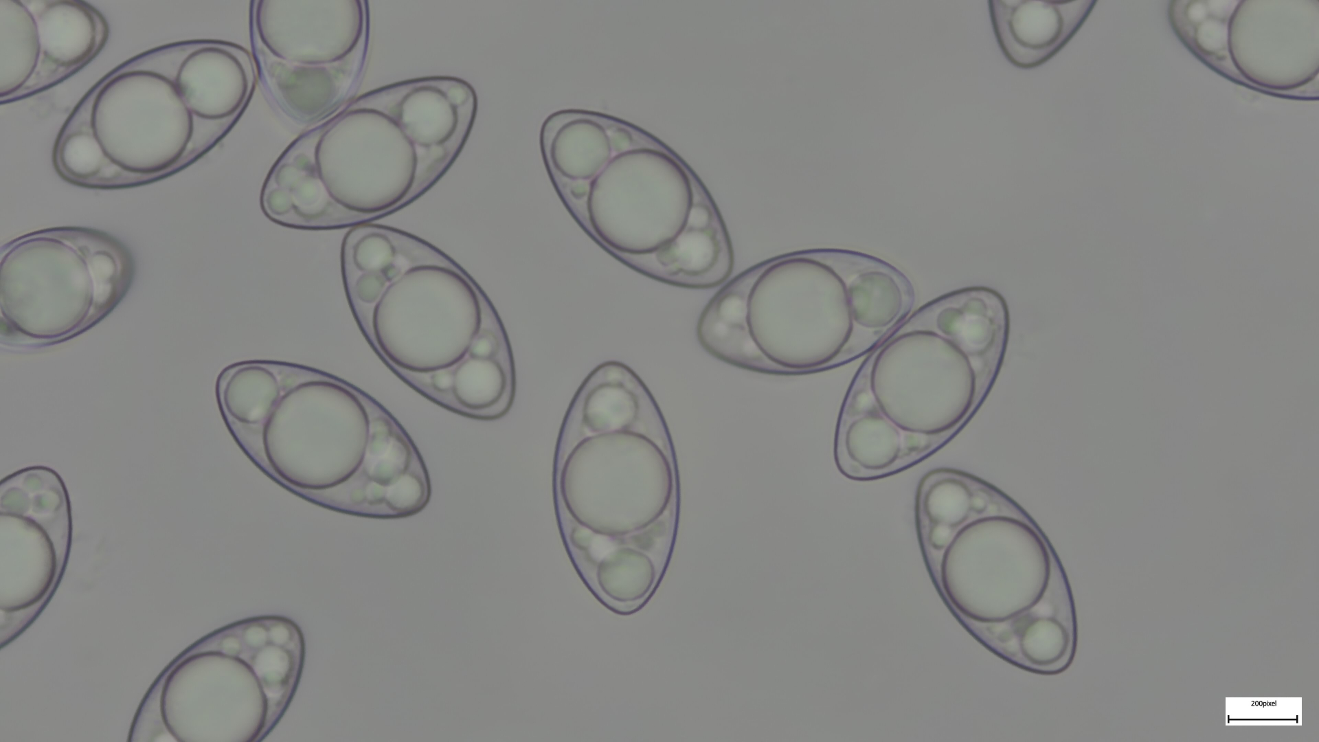 Sporen spindelig, 24x11µm mit den typischen drei Ölkernen: