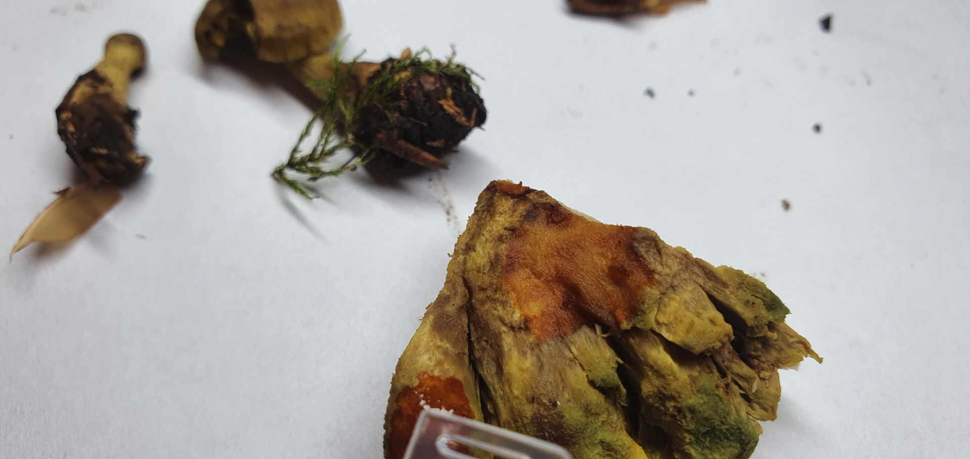 In den Wahnsinn treiben mich die Cortinarien, mit der Gattung habe ich einfach viel zu wenig Erfahrung und zudem habe ich noch zwei kleine Exemplare gefunden, die ich für Cortinarien halte, bei denen ich nicht im Ansatz weiß, in welche Richtung ich gucken soll ... ich nenne Sie liebevoll den kleinen Grünen und den kleinen Roten: