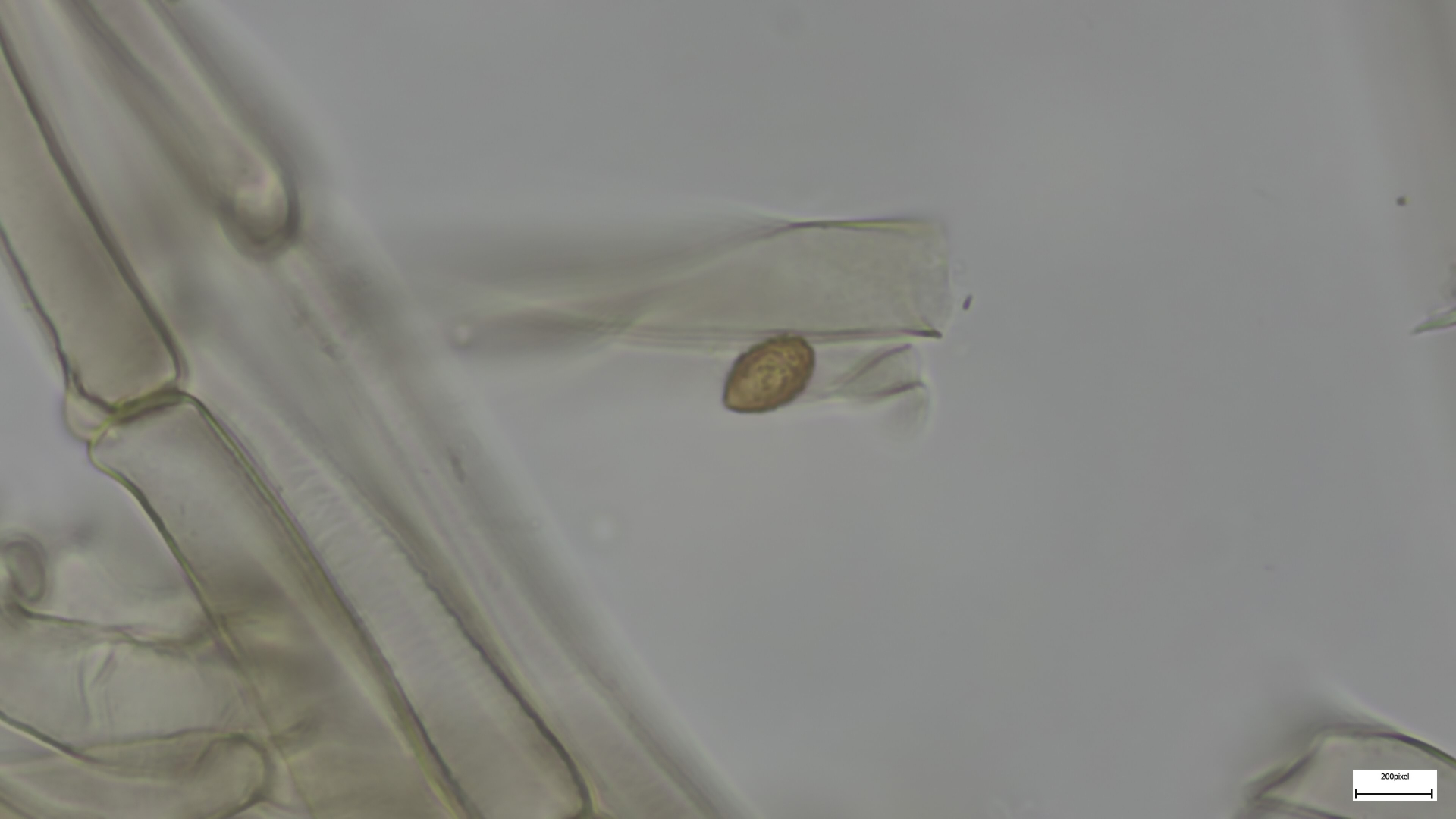 Sporen spindelig, 24x11µm mit den typischen drei Ölkernen: