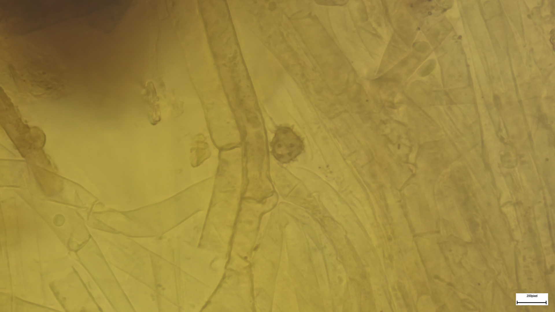 sehr auffällige Hyphen in der Hutdeckschicht, mit zahlreichen kettengliedrigen Elementen (40x8µm) und stark ausgeprägten Schnallen